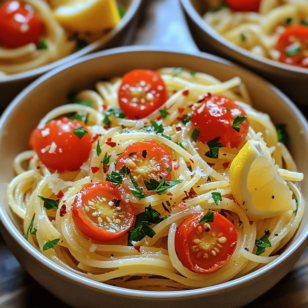 ![- 300g spaghetti - 6 cloves garlic, thinly sliced - 1/2 teaspoon red pepper flakes - 1/4 cup extra-virgin olive oil - Zest and juice of 1 lemon - 1/2 cup fresh parsley, chopped - Salt to taste - Freshly grated Parmesan cheese (optional) - 1 cup cherry tomatoes, halved To make Spaghetti Aglio e Olio, you need simple and fresh ingredients. The garlic is key. It adds depth and flavor. Thinly sliced garlic cooks fast, so watch it closely. Red pepper flakes give the dish a bit of spice. You can add more or less based on your taste. Extra-virgin olive oil is the base for the sauce. It should be high quality for the best flavor. The lemon zest and juice brighten up the dish. Fresh parsley adds color and freshness. Salt enhances all the flavors, so don’t skip it. If you like cheese, sprinkle on some Parmesan at the end. The cherry tomatoes are a fun addition. They bring sweetness and juiciness. You can use them or leave them out. They add a nice twist to the classic recipe. Check out the Full Recipe for more details on how to prepare this dish. - Protein options (shrimp, chicken) - Seasonal vegetables - Other herbs and spices To make the meal heartier, think about adding proteins. Shrimp or chicken cook quickly and add great flavor. Seasonal vegetables like spinach or zucchini can also bring in extra nutrients. Herbs like basil or oregano can enhance the taste too. Feel free to get creative with what you have! To start, boil water in a large pot. Add salt to the water. This step adds flavor to the spaghetti. Once the water reaches a rolling boil, add 300g of spaghetti. Cook according to package instructions until it is al dente. This usually takes around 8 to 10 minutes. After cooking, reserve 1 cup of pasta water. This is key for the sauce. Drain the spaghetti but do not rinse it. In a large skillet, pour in 1/4 cup of extra-virgin olive oil. Heat it over medium heat. Add 6 cloves of sliced garlic. Sauté the garlic until it turns golden, about 2 minutes. Be careful not to burn it. Next, stir in 1/2 teaspoon of red pepper flakes. This adds a nice kick to the dish. Allow the flakes to cook for about 30 seconds. Then, add 1 cup of halved cherry tomatoes. Cook these for 3 to 4 minutes. They should soften and become juicy. Now it’s time to combine! Toss the drained spaghetti into the skillet. Mix it well to coat it with the garlic and oil. Add the zest and juice of 1 lemon. Also, add half of the chopped parsley. If the pasta looks dry, add some reserved pasta water. Keep mixing until you reach your desired creaminess. Finally, season with salt to taste. Remove the skillet from heat. Your delicious Spaghetti Aglio e Olio is ready to enjoy! For the full recipe, check out the detailed guide. To get great flavor, focus on sautéing garlic just right. Use medium heat and watch it closely. Garlic cooks fast and can burn easily. Sauté it for about two minutes until golden, but not brown. This gives a nice, sweet flavor. Next, balance spice and acidity with lemon. The zest adds a fresh burst, while the juice brightens the dish. Add lemon juice right before serving. This keeps the flavor fresh and lively. For al dente pasta, cook spaghetti for 8-10 minutes. Check the package for exact times, as brands vary. You want it to be firm but not hard. Timing is key for adding ingredients. Toss in cherry tomatoes after the garlic. Cook them for 3-4 minutes until they soften. This keeps them fresh and juicy. Don't forget to reserve some pasta water before draining. It helps bind the dish together later. When plating Spaghetti Aglio e Olio, use shallow bowls. This makes the dish look inviting. Add a drizzle of olive oil on top for shine. Garnish with parsley for color. A lemon wedge on the side adds a nice touch. You can also sprinkle freshly grated Parmesan cheese for extra flavor. Enjoy your beautiful, tasty dish! For the full recipe, check out the link provided. {{image_2}} You can easily add proteins like shrimp or chicken to make your dish heartier. This small change can turn a light meal into a filling feast. You can also incorporate seasonal vegetables, like zucchini or asparagus, for a fresh taste. These add color and nutrition to your plate, making your meal even better. To make your dish pop, try infusing extra-virgin olive oil with herbs. You can use rosemary, thyme, or basil. This simple step adds rich flavors without much effort. Another great idea is to use different types of cheese for depth. Pecorino Romano or a tangy goat cheese can bring new taste sensations to your Spaghetti Aglio e Olio. If you want to simplify your cooking, try the one-pot spaghetti method. Cook everything together for a quick meal with less cleanup. Just toss the raw pasta, garlic, and oil into the pot with water and let it cook. You can also make a baked version. This way, your pasta gets crispy edges while remaining soft inside, offering a delightful contrast. For the full recipe, visit [Full Recipe]. To store leftover spaghetti, let it cool first. Place it in an airtight container. Make sure to refrigerate it. Leftovers can last up to three days in the fridge. If you want to keep it longer, you can freeze spaghetti for up to three months. To reheat spaghetti, the stovetop is best. Heat a pan over medium heat. Add a splash of water or olive oil. This helps keep the pasta moist. Stir occasionally until warm. You can also use the microwave. Place the spaghetti in a bowl, cover it, and heat in short bursts. Check often to avoid drying it out. Enjoy your meal! Yes, you can! If you skip the cheese, the dish remains tasty. You might add a splash of cream for a creamy texture. Another option is to use nutritional yeast. It gives a cheesy flavor without dairy. Salads go great with this dish. A simple green salad with lemon dressing works well. Garlic bread is also a fantastic choice. It complements the garlic flavor in the pasta. To serve more people, just multiply the ingredients. For example, double everything for eight servin