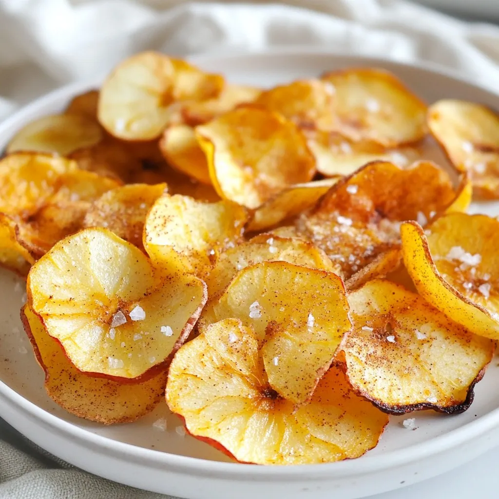 To make tasty air fryer apple chips, you need just a few simple ingredients: - 2 large apples (any variety you prefer) - 1 teaspoon cinnamon - 1 tablespoon sugar (optional) - A pinch of salt - 1 teaspoon lemon juice These ingredients work together to create crispy, sweet snacks that are fun to eat. If you don't have all the ingredients, don't worry! Here are some easy swaps: - Apples: You can use any type of apple. Fuji, Granny Smith, or Honeycrisp all work well. - Cinnamon: If you want a different flavor, try nutmeg or pumpkin spice. - Sugar: You can skip the sugar if you want a tart snack. Or, use honey or maple syrup for sweetness. - Lemon Juice: Lime juice can also add a nice tang. Feel free to mix and match based on what you have at home. Some apples are better for making chips than others. Here are my top picks: - Fuji: Sweet and crunchy, great for chips. - Granny Smith: Tart and firm, perfect for a tangy bite. - Honeycrisp: Juicy and sweet with a nice crunch. - Pink Lady: Balanced sweetness and tartness, excellent for flavor. Choosing the right apple makes a big difference in taste and texture. Enjoy experimenting with different types! {{ingredient_image_1}} First, wash and dry your apples. I like using two large apples for this recipe. You can choose any variety you love. Next, you need to core the apples. After that, slice them thinly. Aim for about 1/8 inch thick. A mandoline works great, but a sharp knife is fine too. Once sliced, put the apple pieces in a bowl. Add one teaspoon of lemon juice. This helps keep the apples fresh and bright. Now sprinkle in one teaspoon of cinnamon. If you want extra sweetness, add one tablespoon of sugar. Finally, toss in a pinch of salt. Mix everything well so the apples are nicely coated. Now it’s time to air fry! Preheat your air fryer to 160°F (70°C) for about five minutes. This step is important for even cooking. After preheating, arrange the apple slices in the air fryer basket. Make sure they lie flat. They should not overlap at all. You may need to do this in batches if your air fryer is small. Set the timer for 10 to 15 minutes. Check the apple chips halfway through and flip them over. They should turn golden and crisp. If your slices are thicker, you may need a few extra minutes. Keep an eye on them to prevent burning. Once the apple chips are done, carefully take them out of the air fryer. Place them on a wire rack. Let them cool for a few minutes. The chips will continue to crisp as they cool. Once they are completely cool, store them in an airtight container. This keeps them fresh and crunchy. Enjoy your tasty snack! To get the best crispiness, slice your apples thin. Aim for about 1/8 inch thick. Use a mandoline for even slices. This tool helps you get perfect cuts every time. Make sure to coat each slice with lemon juice. This helps keep the apples fresh and adds flavor. Toss the slices with cinnamon, sugar, and salt for extra taste. When you place the slices in the air fryer, avoid overlapping. This allows hot air to flow around each slice. Air fry at 160°F for 10-15 minutes. Check them halfway through and flip for even cooking. Let the chips cool on a wire rack. They will crisp up more as they cool. Feel free to experiment with flavors! You can add nutmeg or ginger for a warm twist. Try using vanilla or almond extract for a sweet touch. Want a savory snack? Sprinkle some paprika or chili powder on the apple slices. This adds a nice kick. You can also try other toppings. Drizzle melted dark chocolate after cooking for a treat. One common mistake is slicing apples too thick. Thick slices won’t get crispy. Always aim for even, thin cuts. Another mistake is overcrowding the air fryer basket. This can lead to soggy chips. Fry in batches if needed. Don’t skip the cooling step. If you store them right away, they may lose their crispiness. Let them cool completely before sealing them in a container. Pro Tips Choose the Right Apples: For the best flavor and texture, use a mix of sweet and tart apples like Honeycrisp or Granny Smith. Slice Evenly: Using a mandoline ensures that the apple slices are uniform in thickness, which helps them cook evenly. Experiment with Spices: Feel free to add nutmeg or ginger for an extra layer of flavor if you love a spiced twist. Cooling is Key: Letting the chips cool on a wire rack helps them crisp up even more, preventing sogginess. {{image_2}} You can change the taste of your apple chips easily. Try adding different spices. For a sweet touch, use nutmeg or ginger. For a savory kick, sprinkle some chili powder. You can also mix spices. A blend of cinnamon and cardamom gives a warm flavor. Experiment and find what you like best. Apple chips are just the start! Many fruits work well in the air fryer. Pears make a great choice; they add a juicy crunch. Bananas are fun, too, and turn crispy quickly. You can even try strawberries or kiwi. Just remember to adjust the cooking time as needed. If you want to cut back on sugar, there are great options. Try using honey or maple syrup. These natural sweeteners add flavor without too much sugar. You can also skip sweeteners altogether. The fruit itself is tasty and sweet enough! Adding a bit of lemon juice brightens the flavor too. To keep your apple chips fresh and crispy, store them in an airtight container. This will help keep out moisture. Use a glass jar or a plastic container with a tight lid. Place a paper towel in the bottom to absorb any extra moisture. When stored properly, apple chips can last up to two weeks. Keep them in a cool, dry place, away from direct sunlight. If you see any signs of moisture or softness, it’s time to toss them. If your apple chips lose their crunch, don't worry! You can easily bring them back to life. Preheat your air fryer to 160°F (70°C). Place the stale chips in the basket in a single layer. Air fry for about 2-3 minutes. Check them often to avoid burning. Once they’re crisp again, enjoy! Yes, you can make apple 