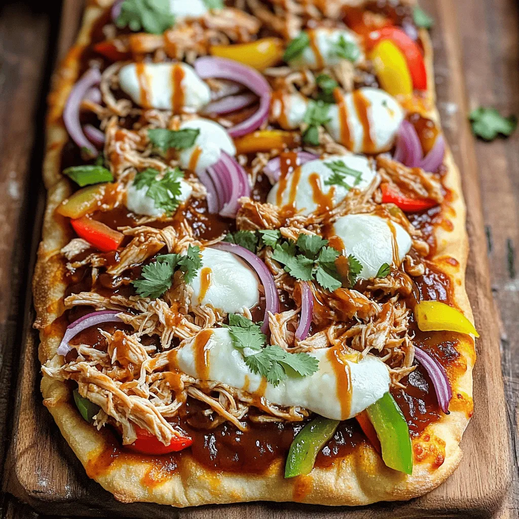 ![To make a tasty BBQ chicken flatbread pizza, you'll need: - 2 pieces of flatbread (store-bought or homemade) - 1 cup cooked chicken breast, shredded - 1/2 cup BBQ sauce (your choice of flavor) - 1 cup shredded mozzarella cheese - 1/2 cup red onion, thinly sliced - 1/2 cup bell pepper (any color), sliced - 1/4 cup fresh cilantro, chopped - 1/4 teaspoon smoked paprika - Salt and pepper to taste - Olive oil for brushing You can add fun flavors to your pizza with these optional ingredients: - Jalapeños for a spicy kick - Pineapple for a sweet touch - Feta cheese for a tangy twist - Avocado slices for creaminess - Green onions for a fresh finish Selecting fresh and high-quality ingredients makes a big difference. Here are some tips: - Choose flatbreads that are soft and pliable. - Look for organic chicken if possible. - Pick BBQ sauce that suits your taste. - Fresh vegetables should be crisp and colorful. - Use real mozzarella for the best melt and flavor. These choices will help you create a delicious meal that you can enjoy any time! Check out the Full Recipe for more details on how to prepare this dish. First, you should preheat your oven to 400°F (200°C). This helps the flatbreads cook evenly. Next, grab your flatbreads. You can use store-bought or make your own if you prefer. Place the flatbreads on a baking sheet. I like to line the sheet with parchment paper. It makes cleaning easy later. Brush each side of the flatbreads with olive oil. This adds a nice flavor and helps them crisp up. In a medium bowl, add your shredded chicken. Pour in about 1/2 cup of BBQ sauce. Stir well until all the chicken is covered. This step is key for flavor. You can choose any BBQ sauce you like. Sweet, spicy, or smoky, it all works great. Once mixed, set the bowl aside. This simple mix brings a ton of taste to your pizza. Now, it’s time to assemble your flatbread pizza. Start by spreading the BBQ chicken mix evenly over the flatbreads. Next, sprinkle about 1 cup of shredded mozzarella cheese on top. Don’t hold back! Add sliced red onion and bell pepper for crunch and color. Season with smoked paprika, salt, and pepper to taste. Finally, place the baking sheet in the oven. Bake for 12-15 minutes. You'll know it's done when the cheese is melted and bubbly. Once out of the oven, let it cool slightly. Garnish with chopped cilantro for a fresh touch. Slice into wedges and enjoy your BBQ Chicken Flatbread Pizza! For the full recipe, check out the details above. To make great flatbread, I like to keep it simple. Use quality flour, warm water, and a touch of salt. Mix these in a bowl until smooth. Let the dough rest for about 30 minutes. This helps it relax and become easier to roll out. Roll the dough thin for a crisp texture. Cook it on a hot skillet or in the oven until golden. This gives you a perfect base for your BBQ chicken toppings. When topping your flatbread, spread the BBQ chicken evenly. This way, every bite has flavor. Start with the chicken, then add cheese. Cheese holds everything together and melts nicely. Next, scatter onions and peppers. This mix adds color and crunch. Don’t overload your flatbread. Too many toppings can make it soggy. Just a little goes a long way. One common mistake is not preheating the oven. Always preheat it to the right temperature. This ensures your pizza cooks evenly. Another mistake is using too much sauce. A thin layer of BBQ sauce is best. If you add too much, the flatbread can become wet. Lastly, don’t forget to let it cool before slicing. This helps keep the toppings in place. For more details on making BBQ Chicken Flatbread Pizza, check out the Full Recipe. {{image_2}} You can mix things up with different toppings. Try adding jalapeños for heat or pineapple for sweetness. Red pepper flakes can give a nice kick too. If you love cheese, feel free to layer on some cheddar or pepper jack. Different BBQ sauces can change the flavor as well. Sweet, tangy, or spicy options all work great. You can even use ranch dressing as a base for a creamy twist. When it comes to flatbread, you have choices. Store-bought flatbreads save time and effort. They come in many types, like whole wheat or gluten-free. Homemade flatbread offers a fresh taste. You can make it with just flour, water, and salt. Roll it out to your preferred thickness for a nice texture. Both methods give good results, so pick what fits your schedule. You can easily adapt this pizza for vegetarian or vegan diets. For a vegetarian option, use grilled vegetables like zucchini or mushrooms. Swap the chicken for marinated tofu or tempeh for added protein. Use vegan cheese to keep it dairy-free. For BBQ sauce, check labels to find one that is vegan-friendly. These swaps keep the pizza tasty and satisfying for everyone. For the full recipe, check the [Full Recipe]. To keep leftover BBQ chicken flatbread pizza fresh, wait for it to cool. Wrap each piece tightly in plastic wrap or aluminum foil. Place the wrapped pizza in an airtight container. Store it in your fridge for up to three days. This way, the flavors stay intact, and the crust stays crisp. To reheat your pizza, the oven is best. Preheat the oven to 350°F (175°C). Place the pizza on a baking sheet. Heat for about 10-15 minutes. Keep an eye on it to avoid burning. You can also use a skillet. Heat the skillet over medium heat. Place the pizza in the pan, cover it, and cook for about 5-7 minutes. This method keeps the crust nice and crunchy. If you want to freeze your BBQ chicken flatbread pizza, wrap each piece well. Use plastic wrap and then foil for extra protection. You can freeze it for up to three months. When ready to eat, thaw it overnight in the fridge. Reheat it in the oven for the best results. This method helps keep the flavors and textures just right. Enjoy your meal any time! For the full recipe, check out the details above. For BBQ Chicken Flatbread Pizza, I recommend using naan or pita bread. They are thick and hold toppings well. You 