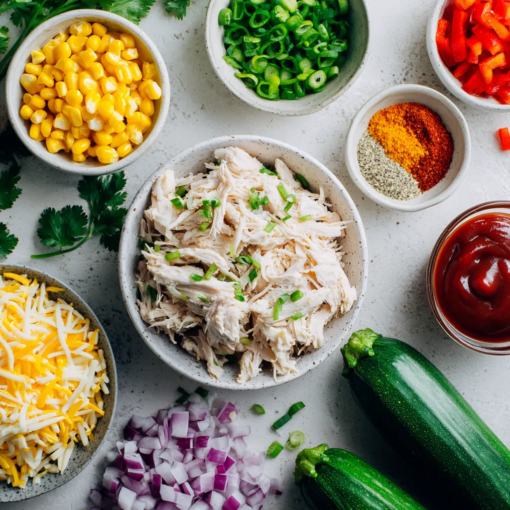 - In a large bowl, mix the shredded chicken, BBQ sauce, corn, diced red bell pepper, diced red onion, garlic powder, smoked paprika, and the scooped-out zucchini flesh. Season with salt and pepper to taste.