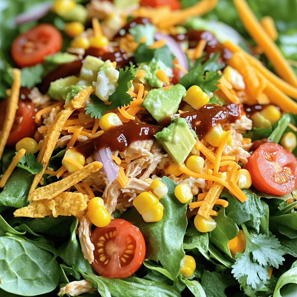 Next, grab a large salad bowl. Place the mixed salad greens at the bottom. This creates a fresh base. Now, layer the salad with cherry tomatoes, corn, diced avocado, and red onion. Each layer adds color and crunch. After that, add the BBQ chicken mixture right on top of the salad.