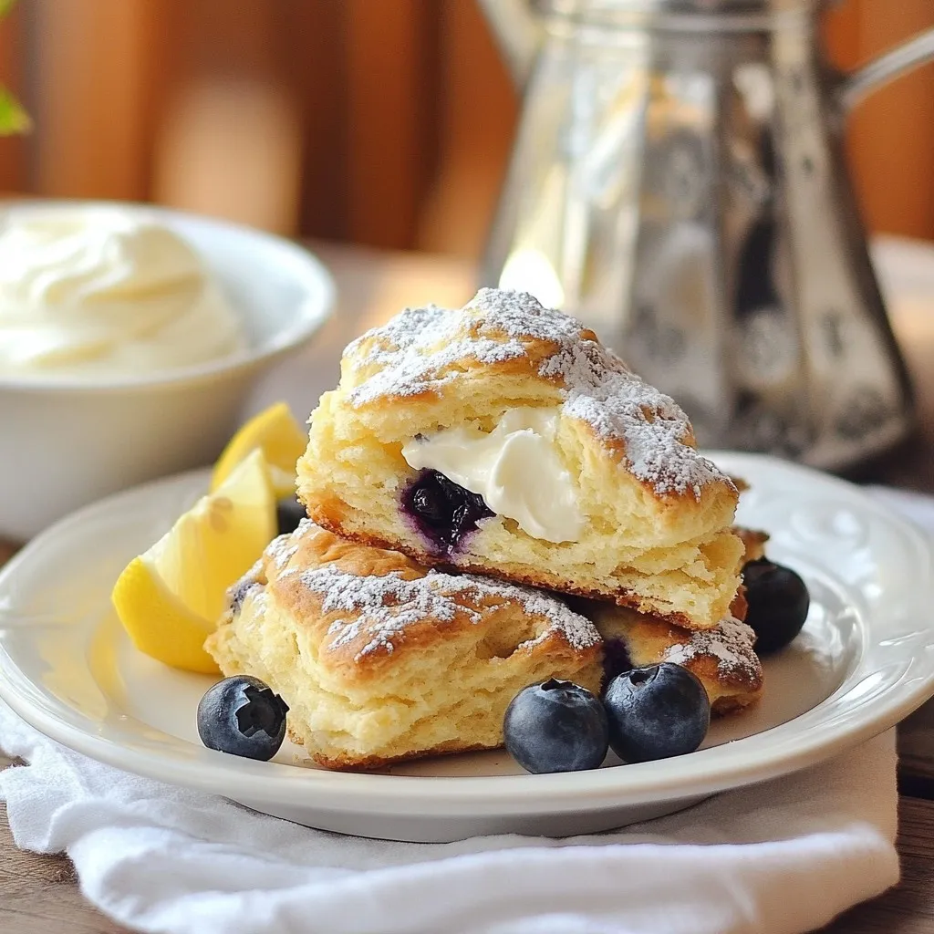 - 2 cups all-purpose flour - 1/4 cup granulated sugar - 1 tablespoon baking powder - 1/2 teaspoon salt - 1/2 cup unsalted butter, chilled and cubed - 1 cup fresh blueberries - Zest of 1 lemon - 1/2 cup heavy cream - 1 large egg - 1 teaspoon vanilla extract - 1 tablespoon lemon juice Gather these ingredients before you start. They are the key to making tasty blueberry lemon scones. The flour gives the scones their base. Sugar adds sweetness, while baking powder helps them rise. Salt enhances the flavor. Butter is crucial. Using chilled butter keeps the scones flaky. Fresh blueberries burst with flavor and add moisture. Lemon zest brightens up the taste and aroma. Heavy cream makes them rich and tender. The egg binds everything together. Vanilla extract adds a warm, sweet note. Lemon juice balances the sweetness with a tart kick. - Powdered sugar for dusting - Clotted cream - Lemon curd You can serve your scones with extras. A dusting of powdered sugar makes them look pretty. Clotted cream adds richness, while lemon curd gives a zesty twist. These toppings take your scones to the next level. Enjoy them warm for the best experience! {{ingredient_image_1}} - Preheat oven to 400°F (200°C) - Line baking sheet with parchment paper Start by heating your oven. The right temp helps the scones rise well. Lining your baking sheet with parchment makes cleanup easy. - Whisk together flour, sugar, baking powder, and salt Next, grab a large bowl. Add flour, sugar, baking powder, and salt. Whisk them together until they blend well. This mix forms the base of your scones. - Add chilled, cubed butter and mix until coarse crumbs form - Fold in fresh blueberries and lemon zest Now, add chilled, cubed butter to your dry mix. Use your fingers or a pastry cutter. Mix until it looks like coarse crumbs. Then, gently fold in fresh blueberries and lemon zest. This adds flavor and color! - Whisk together heavy cream, egg, vanilla extract, and lemon juice In a different bowl, whisk heavy cream, egg, vanilla extract, and lemon juice. Make sure it’s smooth. This mix will bring moisture to your scones. - Pour wet ingredients into dry ingredients and mix gently - Knead and shape dough into a circle about 1-inch thick Pour the wet ingredients into the dry mix. Stir gently until just combined. Don’t overmix! This can make the scones tough. Transfer the dough to a floured surface. Knead a few times to bring it together. Then, shape it into a circle that is about 1-inch thick. - Cut dough into 8 wedges and place on baking sheet - Bake for 15-20 minutes until golden brown Cut the dough into 8 wedges. Place them on your prepared baking sheet, giving them space. Bake for 15-20 minutes. You want them golden brown and firm. A toothpick should come out clean when inserted. Enjoy the sweet aroma as they bake! To get the best scone texture, you need to pay close attention. For flaky scones, keep your butter cold. Cut the butter into small pieces and work it gently into the flour. This creates little pockets of butter that melt while baking. For moist scones, add enough cream, but don't add too much. The right balance will give you the perfect bite. Avoid overmixing the dough. When you combine wet and dry ingredients, stir just until you see no dry flour. Overmixing makes scones tough. You want them light and airy, so mix with care. Serve your blueberry lemon scones warm. They taste delightful with clotted cream or lemon curd. These creamy spreads add richness and a burst of flavor. They are perfect for afternoon tea. Think about pairing them with a cup of tea or coffee. The bright lemon and sweet blueberries shine in every bite. One common mistake is overworking the dough. Kneading too much will make your scones dense and chewy. Handle the dough gently. Another mistake is choosing the wrong flour. Always use all-purpose flour. Using bread flour can give a tough texture. Stick to the basics for the best results. Pro Tips Use Cold Ingredients: Ensure your butter and cream are very cold to create flaky layers in the scones. Don’t Overwork the Dough: Mix the ingredients until just combined to avoid tough scones; a little stickiness is okay. Experiment with Flavors: Try adding different berries or herbs like rosemary for a unique twist on the classic scone. Proper Storage: Store leftover scones in an airtight container at room temperature for up to 2 days or freeze for longer freshness. {{image_2}} For those needing a gluten-free option, you can use different flours. Here are some good substitutes: - Almond flour: It adds a nice nutty flavor. - Coconut flour: Use less, as it absorbs more liquid. - Gluten-free all-purpose flour: This is often the easiest choice. When using these flours, you may need to adjust the liquid. Keep an eye on the dough texture. It should remain soft but not sticky. To make vegan scones, you can swap out dairy and eggs. Here are some tips: - For butter: Use coconut oil or vegan butter in equal amounts. - For heavy cream: Try almond milk or coconut cream. - For eggs: Use 1 tablespoon of ground flaxseed mixed with 2.5 tablespoons of water per egg. Let it sit for a few minutes to thicken. These changes will help keep the scones moist and tasty. You can easily add your twist to these scones. Here are some fun ideas: - Nuts: Chopped walnuts or pecans add a nice crunch. - Different berries: Try raspberries, blackberries, or strawberries for a new flavor. - Herbs: Fresh basil or mint can give a refreshing twist. Mix and match these suggestions to create your perfect scone. Enjoy your baking adventure! To keep your scones fresh, store them in an airtight container. This helps to trap moisture and keep them soft. Place a piece of wax paper between layers if you stack them. Avoid leaving them out, as they can dry out quickly. Keep them at room temperature for up to two days. You can freeze both unbaked and baked scones. For unbaked scones, shape the dough and place the wedges on a baking sheet. Freeze them for abou