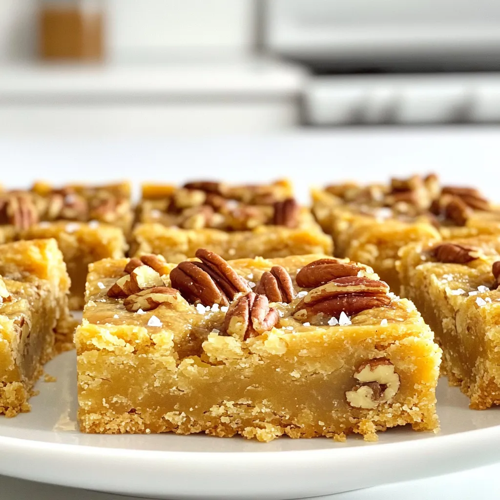 To make Brown Butter Maple Pecan Shortbread Bars, gather these ingredients: - 1 cup unsalted butter (2 sticks), browned - 1/2 cup maple syrup - 3/4 cup granulated sugar - 1/2 teaspoon salt - 2 cups all-purpose flour - 1/2 cup finely chopped toasted pecans - 1 teaspoon vanilla extract - Optional: Sea salt for sprinkling You can make a few swaps if needed. Here are some ideas: - Unsalted butter: Use salted butter. Just reduce or skip the added salt. - Maple syrup: Honey or agave syrup works well too. These will change the flavor slightly. - All-purpose flour: Almond flour or oat flour are good gluten-free options. - Chopped pecans: Try walnuts or hazelnuts for a different nutty twist. Using high-quality ingredients makes a big difference. Fresh, unsalted butter gives a rich taste. Pure maple syrup adds depth and sweetness. When you choose good flour, it helps with texture. Fresh pecans boost flavor and crunch. Quality matters for the best results. Your bars will taste much better with these choices. They will impress your family and friends. First, heat your oven to 350°F (175°C). Grab an 8x8 inch baking pan. Line it with parchment paper. Leave some paper hanging over the sides. This helps you lift the bars out later. Next, take a medium saucepan. Add the unsalted butter to it. Melt the butter over medium heat. Stir it often as it cooks. Watch closely as it turns golden brown. This should take about 5 minutes. You’ll smell a nutty aroma when it’s ready. Remove it from heat and let it cool a bit. In a large bowl, pour in the browned butter. Add the maple syrup, granulated sugar, and salt. Whisk these together until smooth. Then, mix in the vanilla extract. After that, slowly add the flour. Mix gently until just combined. Be careful not to over-mix! Finally, fold in the finely chopped toasted pecans. Pour the batter into your prepared pan. Spread it evenly across the bottom. Bake in the preheated oven for 20-25 minutes. Look for lightly golden edges. A toothpick should come out clean when inserted in the center. Once baked, take the pan out of the oven. Let it cool for 10 minutes. Use the parchment paper to lift the bars from the pan. Place them on a wire rack to cool completely. If you like, sprinkle a bit of sea salt on top before slicing. Cut into squares and enjoy! To make great brown butter, heat unsalted butter in a pan. Stir it often as it melts. Keep an eye on it. You want it to turn golden brown. This usually takes about five minutes. The nutty smell shows it's ready. Remove it from heat quickly to avoid burning. Let it cool slightly before mixing with other ingredients. This step adds rich flavor to your shortbread bars. When you mix your batter, do it gently. Combine the wet and dry ingredients just until they blend. Over-mixing can lead to tough bars. Use a spatula to fold in the flour, and then the pecans. This keeps your bars soft and crumbly. Remember, less is more here! To get the best texture, use the right flour. All-purpose flour works best for these bars. The pecans should be finely chopped and toasted for rich flavor. If you want a touch of saltiness, sprinkle sea salt on top before baking. This brings out the sweetness of the maple syrup. Enjoy the warm bars with a cup of tea or coffee! {{image_2}} You can switch up the nuts in these bars. Walnuts or almonds work great too. They add a new crunch and flavor. If you want some spice, try adding cinnamon or nutmeg. Just a pinch can make a big difference. Experiment with different nuts to find your favorite mix. If you don’t have maple syrup, you can use honey or agave syrup. These will change the taste but still keep it sweet. You can also use brown sugar for a deeper flavor and richness. Just remember that each sweetener has a unique taste profile. These bars taste amazing on their own, but they shine with ice cream. Vanilla or caramel ice cream pairs really well. You can also serve them with whipped cream for extra fluff. Drizzle some extra maple syrup on top for a sweet touch. These options make your dessert even more delightful and fancy! Store your Brown Butter Maple Pecan Shortbread Bars in an airtight container. This keeps them fresh. Place parchment paper between layers to prevent sticking. Keep the container at room temperature. Avoid direct sunlight or heat. You can freeze these bars for later. First, let them cool completely. Cut them into squares. Wrap each square in plastic wrap. Place the wrapped bars in a freezer bag. They will stay good for up to three months. When you want to eat them, thaw overnight in the fridge. These bars stay fresh for about a week at room temperature. You can also store them in the fridge for up to two weeks. If you notice any change in color or smell, toss them out. For the best taste, enjoy them within the first few days. To cut shortbread bars, first let them cool completely. Once cool, lift them out of the pan using the parchment paper. Use a sharp knife for clean cuts. I like to cut them into squares or rectangles. Wipe the knife with a damp cloth between cuts. This helps keep the edges neat. You can use salted butter, but it will change the taste. The bars may end up saltier. If you choose salted, skip the added salt in the recipe. Unsalted butter gives you more control over the flavor. I recommend sticking with unsalted for the best results. To check if the bars are done, look for golden edges. A toothpick inserted in the center should come out clean. The top should look set and slightly firm. If it still looks wet, give it a few more minutes. Keep a close eye, as overbaking can dry them out. Brown butter has a rich, nutty flavor. You make it by cooking butter until it turns golden brown. This process creates a deeper taste that enhances your bars. Regular butter does not have this complexity. The browning also adds a lovely aroma that fills your kitchen. This blog post guided you through making perfect shortbread bars. We covered key ingredients, from measurements to q