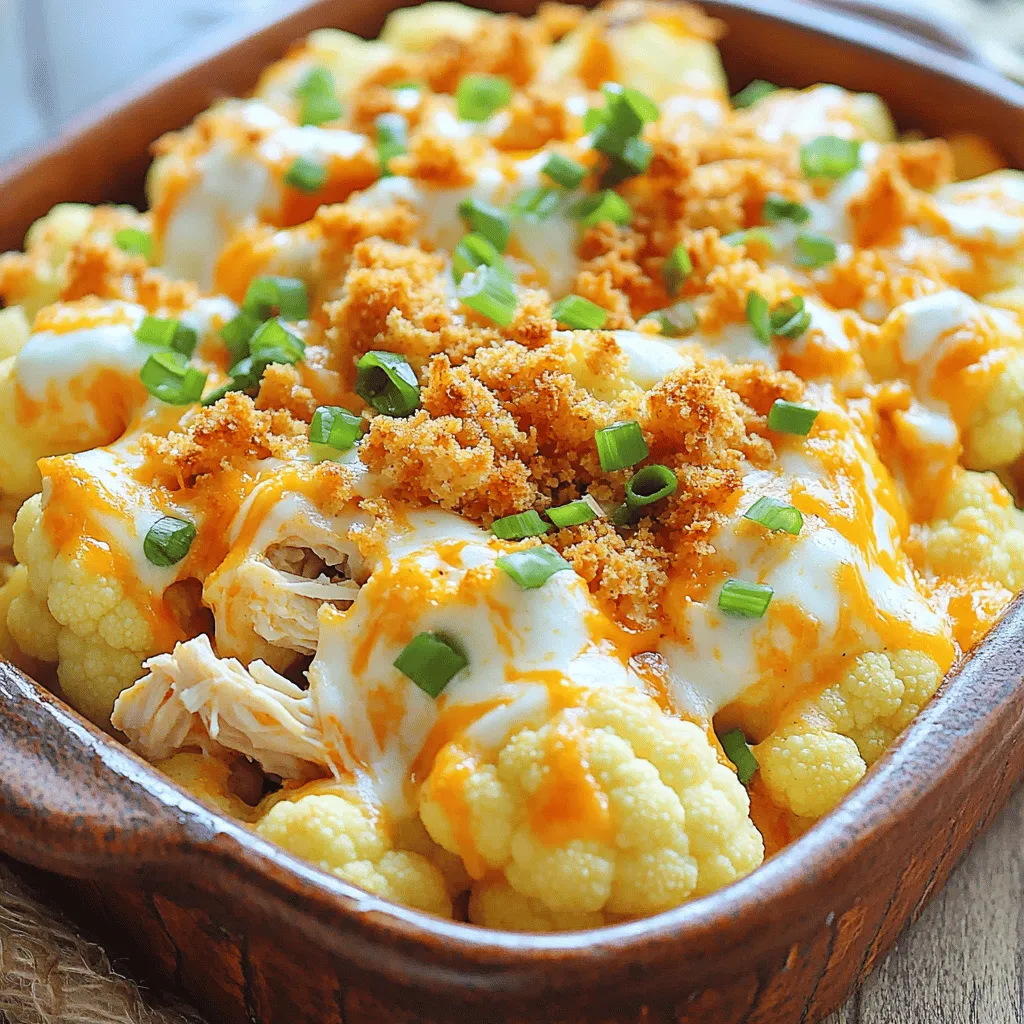 The base of this dish is the cauliflower florets. You want to chop them into bite-sized pieces. Cauliflower adds a nice texture and absorbs flavors well. Next, cooked shredded chicken is key. You can use leftovers or rotisserie chicken. It brings protein and heartiness to the casserole. Buffalo sauce is what gives this dish its kick. You can adjust the heat level to match your taste.