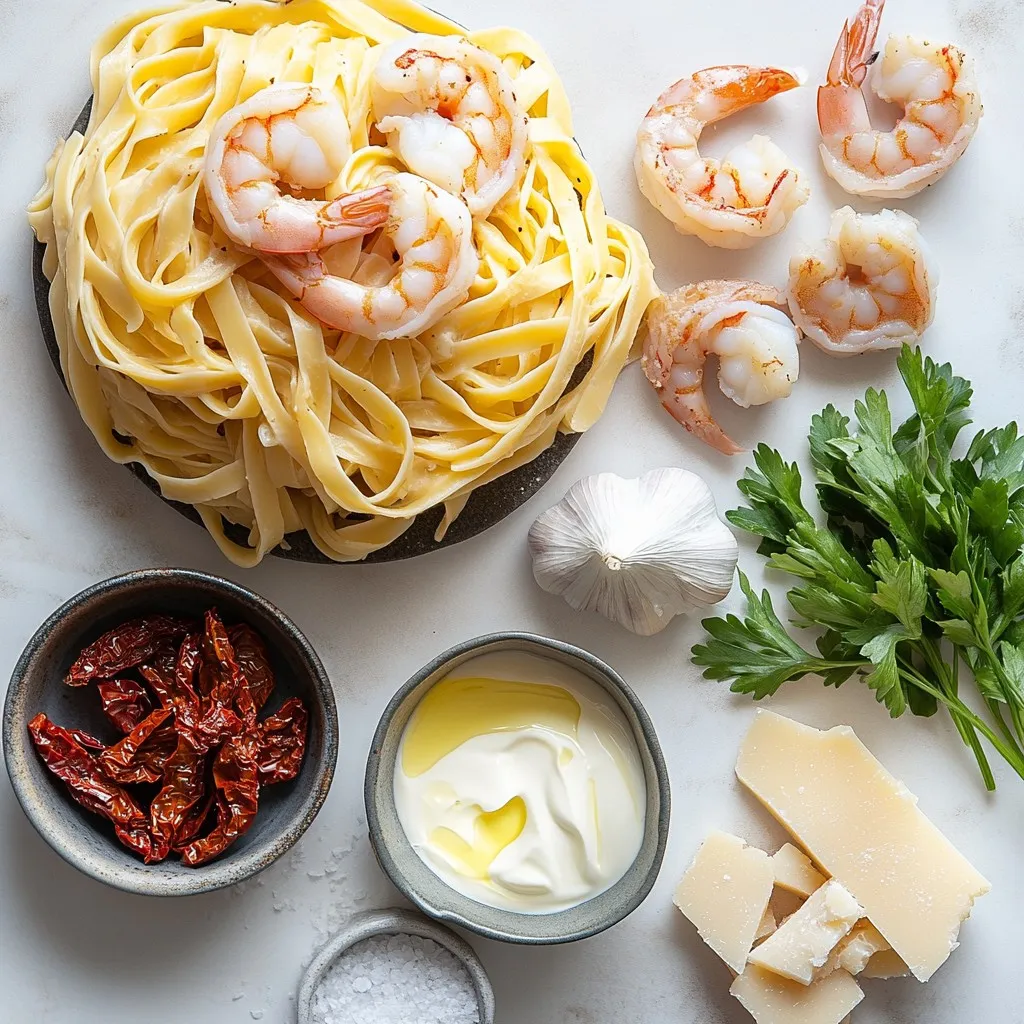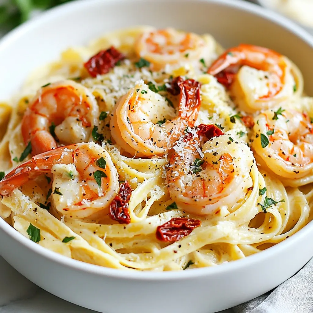 • Add the cooked fettuccine, sun-dried tomatoes, and sautéed shrimp to the Alfredo sauce. Toss everything together gently until the pasta is fully coated in sauce.