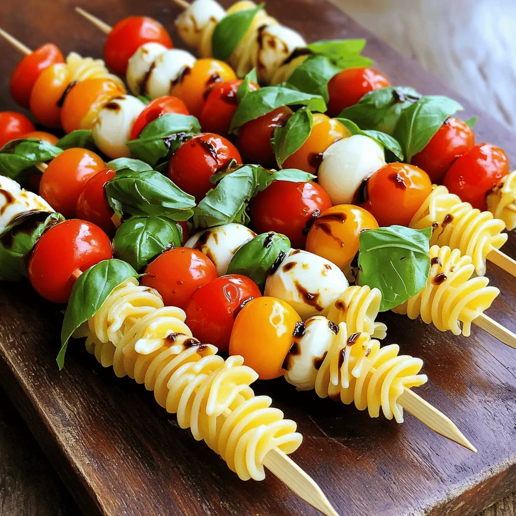 Caprese Pasta Salad Skewers are great for parties or picnics. They are easy to grab and eat. You can serve them with a side of extra balsamic glaze for dipping. If you want to add a twist, pair them with grilled chicken or shrimp. They also work well with a light salad on the side. Enjoy them cold or at room temperature for the best taste.