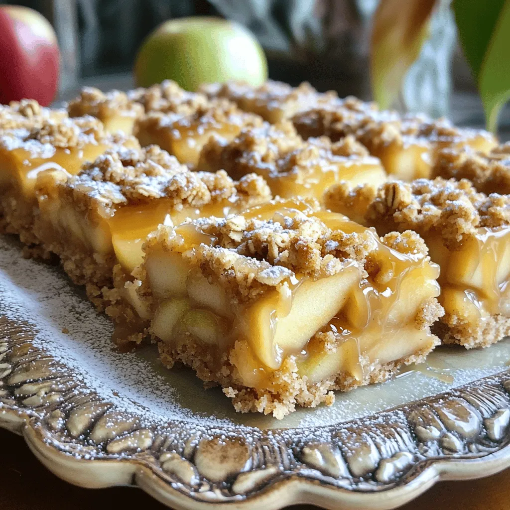 - 2 cups all-purpose flour - 1 cup rolled oats - 1 cup brown sugar, packed - 1 teaspoon baking powder - 1/2 teaspoon baking soda - 1/2 teaspoon salt - 1 cup unsalted butter, melted - 3 cups apples (Granny Smith recommended) - 1/2 cup granulated sugar - 1 teaspoon cinnamon - 1/4 teaspoon nutmeg - 1 cup caramel sauce - 1/2 cup chopped nuts (optional) To make delicious caramel apple crisp bars, gather these simple ingredients. Start with 2 cups of all-purpose flour. Next, add 1 cup of rolled oats for texture. Use 1 cup of brown sugar to give sweetness and depth. Combine with 1 teaspoon of baking powder, 1/2 teaspoon of baking soda, and 1/2 teaspoon of salt to help with rising. Melt 1 cup of unsalted butter to bind everything together. For the filling, choose 3 cups of peeled and diced Granny Smith apples. Their tartness balances the sweetness. Mix them with 1/2 cup of granulated sugar, 1 teaspoon of cinnamon, and 1/4 teaspoon of nutmeg for that warm spice flavor. Don’t forget the star of this recipe, 1 cup of caramel sauce, to drizzle over the apples. If you like, add 1/2 cup of chopped nuts for a bit of crunch. These ingredients come together to create a sweet treat you won't forget! - Preheat oven to 350°F (175°C). - Grease or line a 9x13 inch baking dish. - In a large bowl, combine 2 cups of flour, 1 cup of rolled oats, and 1 cup of brown sugar. - Add 1 teaspoon of baking powder, 1/2 teaspoon of baking soda, and 1/2 teaspoon of salt. - Mix until everything is well blended. - Pour in 1 cup of melted butter and stir until crumbly. - Reserve 1 cup of this mixture for topping. - Press the remaining mixture firmly into the baking dish to form the base layer. - Peel, core, and dice 3 cups of apples. Granny Smith works best for tartness. - In a bowl, toss the diced apples with 1/2 cup of granulated sugar, 1 teaspoon of cinnamon, and 1/4 teaspoon of nutmeg. - Mix until the apples are well coated. - Evenly distribute the apple mixture over the base layer. - Drizzle half of the caramel sauce over the apples. - Sprinkle the reserved crumb mixture on top. - If you like, add 1/2 cup of chopped nuts for extra crunch. - Bake the bars for 25-30 minutes, until the top is golden brown and the apples are tender. - Let the bars cool completely in the pan before slicing. - Drizzle the remaining caramel sauce on top before serving. - Check the bars mid-way through baking for even cooking. This helps avoid over-baking. - Use parchment paper in your baking dish. This makes it easy to lift the bars out later. - Swap granulated sugar with coconut sugar. It adds a nice caramel flavor. - For a vegan option, use coconut oil instead of butter. You can also find vegan caramel sauce in stores. - Serve caramel apple crisp bars warm with a scoop of vanilla ice cream. It adds creaminess. - Present the bars on a pretty platter. Dust with powdered sugar for a nice touch. - Drizzle extra caramel sauce on each plate. This adds sweetness and makes your dessert pop. {{image_2}} You can change the taste of your caramel apple crisp bars. Adding spices like ginger or allspice makes them unique. These spices add warmth and depth. You can also try different types of apples. Granny Smith apples are tart and firm. Other apples, like Fuji or Honeycrisp, offer sweetness. Mixing apple varieties gives your bars a fun twist! When it comes to caramel, you have choices. You can use homemade caramel sauce for a rich flavor. Making it at home is easy and rewarding. If you're short on time, store-bought caramel works just as well. You can also try alternative toppings. A chocolate drizzle adds a sweet surprise. It pairs nicely with the apple and caramel. You can adapt this recipe for different diets. For a gluten-free version, swap all-purpose flour for gluten-free flour. This keeps the bars tasty for everyone. If you need nut-free options, simply leave out the nuts. The bars will still be delicious and satisfying. You can enjoy these treats and cater to different dietary needs! To keep your caramel apple crisp bars fresh, store them properly. - Cool completely before storing. This helps avoid condensation. - Use an airtight container to keep them moist. - Place parchment paper between layers to prevent sticking. - They stay fresh for up to one week at room temperature. For longer storage, refrigerate them to extend freshness. You can also freeze these delicious bars for later. - Cut the bars into squares before freezing. - Wrap each square in plastic wrap. - Place wrapped bars in a freezer-safe bag or container. - They can last up to three months in the freezer. To enjoy later, simply thaw at room temperature. For best texture, warm them in the oven for a few minutes. How long do caramel apple crisp bars last? Caramel apple crisp bars will stay fresh for up to one week. Keep them in an airtight container. This helps keep the bars moist and tasty. Can I make this recipe ahead of time? Yes, you can make these bars a day in advance. Just cool them completely and store them. This allows the flavors to blend even more. What’s the best way to reheat the bars? To reheat, place the bars in a warm oven at 350°F for about 10 minutes. This will soften them up and make the caramel gooey again. Are caramel apple crisp bars healthy? These bars are a sweet treat and not a health food. They contain sugar and butter, but you can make healthier choices. Use whole wheat flour or less sugar for a lighter version. Nutritional facts and serving sizes Each bar contains about 200 calories, with 10 grams of fat and 30 grams of carbs. This is based on a serving size of one bar. Remember to enjoy them in moderation! Why are my bars too crumbly? If your bars are too crumbly, you may have added too much flour or not enough butter. Make sure to measure carefully and mix well. Press the mixture firmly into the baking dish. What to do if the apples are too firm? If your apples are too firm, you can slice them thinner next time. You can also bake the bars a bit longer.