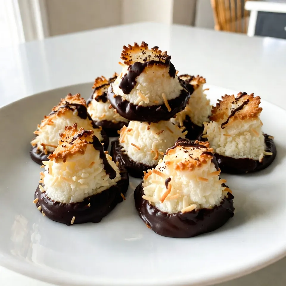 To make these tasty chocolate dipped coconut macaroons, gather these ingredients: - 3 cups shredded unsweetened coconut - 1 cup sweetened condensed milk - 1 teaspoon vanilla extract - 1/4 teaspoon salt - 1 cup semi-sweet chocolate chips - 1 tablespoon coconut oil Selecting the best ingredients is key to great macaroons. Here’s how: - Coconut: Look for unsweetened shredded coconut. This gives you control over sweetness. - Sweetened Condensed Milk: Choose a brand without added preservatives. It ensures a rich flavor. - Chocolate Chips: Opt for semi-sweet chocolate chips for a perfect balance. - Coconut Oil: Use pure coconut oil, which adds a nice hint of coconut flavor. If you have allergies, here are some swaps you can try: - Coconut: If you can’t eat coconut, consider using oats. They won’t taste the same, but they work in texture. - Condensed Milk: Use a dairy-free sweetened condensed milk made from almond or soy. - Chocolate Chips: Use dairy-free or dark chocolate chips for a vegan option. - Coconut Oil: Substitute with any neutral oil, like grapeseed or canola oil, if needed. {{ingredient_image_1}} To start, gather your ingredients. You need 3 cups of shredded unsweetened coconut, 1 cup of sweetened condensed milk, 1 teaspoon of vanilla extract, and 1/4 teaspoon of salt. In a large bowl, mix the coconut with the sweetened condensed milk. Add the vanilla and salt, then stir well. You want the coconut to be coated fully. This mix will be the base of your macaroons. Now it’s time to shape the macaroons. Use your hands to form small mounds. Each mound should be about the size of a golf ball. Space them about 1 inch apart on a baking sheet lined with parchment paper. Preheat your oven to 325°F (160°C). Bake the macaroons for about 20 to 25 minutes. They are done when the edges turn golden brown. After baking, let them cool completely on the sheet. While your macaroons cool, prepare the chocolate dip. You need 1 cup of semi-sweet chocolate chips and 1 tablespoon of coconut oil. In a microwave-safe bowl, combine these two ingredients. Microwave in 30-second bursts, stirring in between. Keep going until the chocolate is smooth. Once cooled, dip the bottom half of each macaroon into the melted chocolate. Allow the excess chocolate to drip off. Place them on a fresh sheet of parchment paper to set. For quicker results, chill them in the fridge. For the best bake, keep a close eye on your macaroons. Bake them at 325°F (160°C). Watch for golden edges, which show they are done. If they look too brown, you may overbake them. Using parchment paper helps prevent sticking and makes cleanup easy. Let them cool completely on the sheet before moving them. This helps them stay firm. To get a smooth chocolate dip, use semi-sweet chocolate chips and a bit of coconut oil. This oil helps the chocolate melt smoothly. Microwave the chocolate in short bursts, stirring in between. Don’t rush this step; patience gives you the best dip. Dip each macaroon halfway, letting the extra chocolate drip off. This makes them look neat and tasty. Store any leftover macaroons in an airtight container. They stay fresh this way for up to a week. If you want to keep them longer, try freezing them. Just place them in a freezer-safe container. When you're ready to eat them, let them thaw in the fridge. This keeps them from getting soggy. Enjoy your sweet treats! Pro Tips Use Fresh Coconut: For a more vibrant flavor, use freshly shredded coconut instead of packaged. It enhances the taste and texture of the bites. Experiment with Flavors: Consider adding a pinch of cinnamon or almond extract to the coconut mixture for a unique twist that complements the chocolate. Chill Before Dipping: Refrigerating the macaroons for 15-20 minutes before dipping them in chocolate will help them hold their shape better. Store Properly: Keep the finished Coconut Bliss Bites in an airtight container in the fridge for up to a week to maintain their freshness. {{image_2}} You can easily add fun flavors to your coconut macaroons. Try mixing in almond extract or coffee. For almond, use one teaspoon of almond extract instead of vanilla. This gives a nice nutty flavor. If you love coffee, add one tablespoon of instant coffee granules to the coconut mix. This will make your macaroons rich and tasty. You can change the chocolate used for dipping. While semi-sweet chocolate is a classic, try dark or white chocolate. Dark chocolate gives a bold taste. White chocolate adds a sweet creaminess. Melt them just like the semi-sweet chocolate. You can even mix chocolates for a fun look. Dip half in dark and half in white for a cool two-tone effect. If you want to make a healthier version, swap out some ingredients. Use light sweetened condensed milk for a lower calorie option. You can also use dark chocolate with a higher cocoa content. This gives more flavor and less sugar. For a nut-free option, use almond milk instead of sweetened condensed milk. This keeps the dish tasty and lower in calories. To keep your macaroons fresh, store them in an airtight container. This helps prevent them from drying out. Place a layer of parchment paper between layers of macaroons. This stops them from sticking together. Keep the container in a cool, dry place away from sunlight. Avoid the fridge, as it can make them soggy. Freezing your macaroons is easy and keeps them tasty. First, let the macaroons cool completely after dipping in chocolate. Then, place them on a baking sheet lined with parchment paper. Freeze them for about an hour until firm. After that, transfer the macaroons to a freezer-safe bag. Remove as much air as possible before sealing. They will stay fresh for up to three months in the freezer. Chocolate dipped coconut macaroons last for about one week at room temperature. If stored correctly in an airtight container, they can retain their taste and texture. If you freeze them, they can last up to three months. Remember to check for any signs of freezer burn