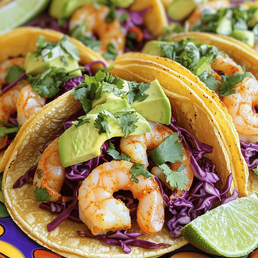 Now it’s time to build your tacos! Warm the corn tortillas in a dry skillet for about 30 seconds on each side. This makes them soft and easy to fold. On each tortilla, layer some shredded red cabbage first. This adds crunch and a fresh taste. Next, top with the cooked shrimp and a few slices of avocado. Sprinkle fresh cilantro on top for a burst of flavor. If you like, add a dollop of sour cream or Greek yogurt.Enjoy your colorful and tasty tacos!