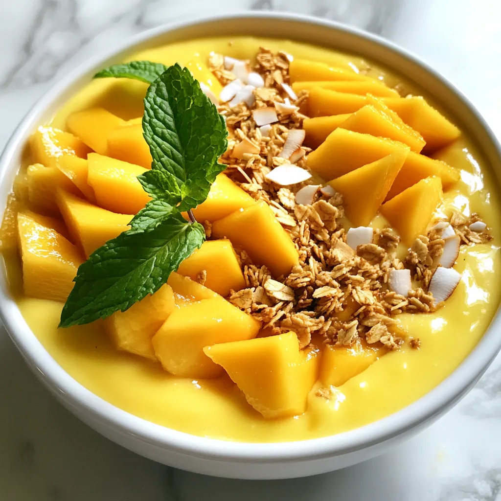 - Decorate the top of the smoothie bowl with granola, shredded coconut, fresh mango slices, and mint leaves to make it visually appealing.
