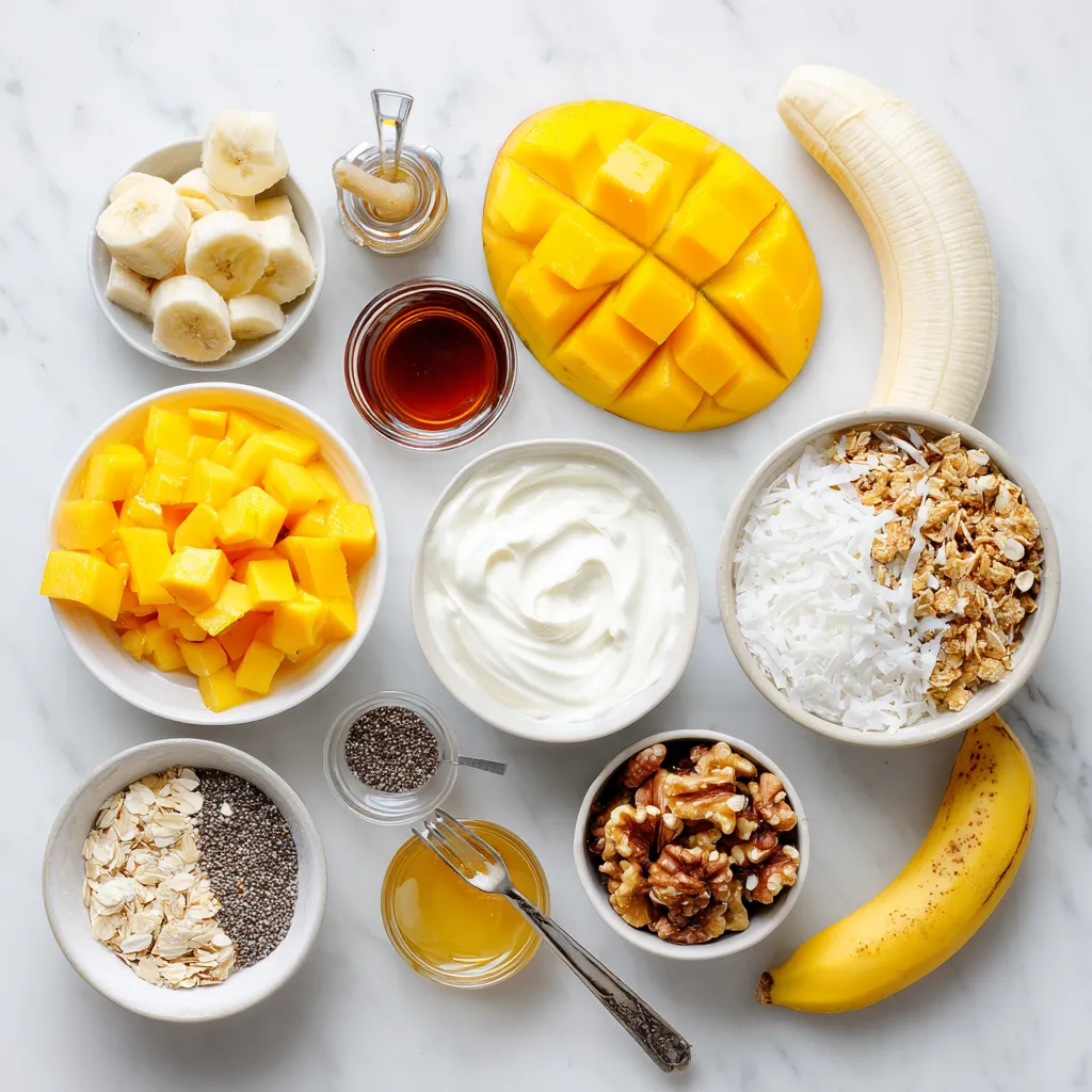 – Toppings: sliced banana, diced mango, shredded coconut, chia seeds, granola, and nuts (e.g., almonds or walnuts)
