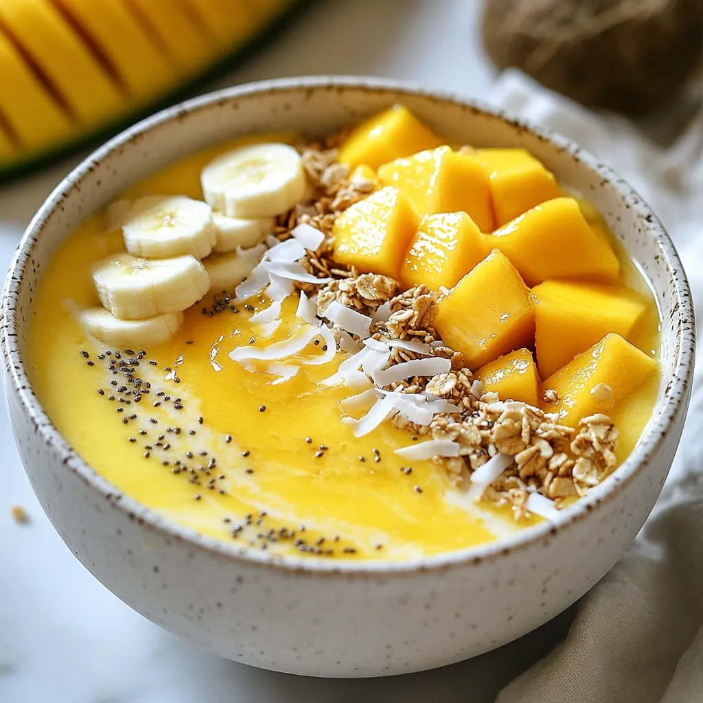To make a Coconut Mango Smoothie Bowl, gather these fresh ingredients: - 1 ripe mango, diced - 1 cup coconut milk (canned or carton) - 1 frozen banana - 1/2 cup Greek yogurt (optional for creaminess) - 1 tablespoon honey or maple syrup (adjust for sweetness) - 1/4 teaspoon vanilla extract - Toppings: sliced banana, diced mango, shredded coconut, chia seeds, granola, and nuts (e.g., almonds or walnuts) You can mix in some optional ingredients to add more flavor: - A pinch of cinnamon for warmth - A squeeze of lime for zing - Spinach for extra nutrition and color - A scoop of protein powder for a boost Each serving of this smoothie bowl is packed with nutrients: - Calories: About 300 - Protein: 8 grams - Fat: 10 grams - Carbohydrates: 45 grams - Fiber: 5 grams - Sugars: 20 grams This bowl not only tastes great but also gives you a healthy start to your day! {{ingredient_image_1}} Start by gathering your ingredients. You will need: - 1 ripe mango, diced - 1 cup coconut milk (canned or carton) - 1 banana, frozen - 1/2 cup Greek yogurt (optional for creaminess) - 1 tablespoon honey or maple syrup (adjust for sweetness) - 1/4 teaspoon vanilla extract In a blender, combine the diced mango, coconut milk, frozen banana, Greek yogurt, honey, and vanilla extract. Blend until smooth. The mixture should look creamy and thick. If it is too thick, add more coconut milk. Taste it to see if it needs more sweetness. You can add more honey or syrup if you like. To get that perfect creamy texture, use a high-speed blender. This helps all the ingredients blend well. If your blender struggles, stop it and stir the mixture. Then, blend again. If the smoothie is still too thick, splash in a bit more coconut milk. This will help it blend easier. Once the smoothie base is ready, pour it into a bowl. Use the back of a spoon or spatula to smooth the top. Now comes the fun part—adding toppings! Arrange sliced banana and diced mango on top. Then sprinkle shredded coconut, chia seeds, granola, and nuts. You can be creative with your designs. Serve it right away with a spoon. Enjoy the fresh flavors of your coconut mango smoothie bowl! To pick a ripe mango, look for a slight give when you press it. The skin color can vary, but a golden hue often means it’s ripe. Avoid mangos with dark spots or wrinkles. A sweet smell near the stem is also a good sign. Ripe mangos taste sweet and juicy, which will brighten your smoothie bowl. You can adjust the sweetness easily. If you like it sweeter, add more honey or maple syrup. Start with one tablespoon, then taste it. If it needs more, add a little at a time. Remember, the ripe mango and banana will add natural sugar, so be careful. Balance is key to a perfect smoothie bowl. To make this smoothie bowl vegan, skip the Greek yogurt. Use only coconut milk and a frozen banana. You can replace honey with maple syrup for sweetness. This keeps the flavor bright and fresh while being plant-based. Enjoy a delicious and creamy vegan smoothie bowl that everyone will love! Pro Tips Use Ripe Mangoes: Ensure your mangoes are fully ripe for the best flavor and sweetness. A ripe mango will yield slightly to pressure and have a sweet aroma. Freeze Your Banana: Using a frozen banana gives your smoothie bowl a creamy texture and keeps it cold, making it a refreshing treat. Adjust Consistency: If your smoothie is too thick, gradually add more coconut milk until you reach your desired consistency. It should be thick enough to hold toppings but smooth enough to eat with a spoon. Get Creative with Toppings: Mix and match your toppings based on your preferences or what you have on hand. Fresh fruits, nuts, seeds, and granola not only enhance flavor but also add nutritional value. {{image_2}} You can change the taste of your coconut mango smoothie bowl by adding other fruits. Try berries like strawberries or blueberries for a pop of color and flavor. Peaches or pineapples also blend well and give a tropical twist. Simply dice your chosen fruit and toss it into the blender with the mango. This small change can make your smoothie bowl even more exciting. If you want to switch up the base, there are many milk options to consider. Almond milk or oat milk can add a different taste. These options are great for those who want to avoid coconut. You can also use soy milk to add creaminess without using dairy. Just remember to pick unsweetened versions to control the sweetness. Toppings can elevate your smoothie bowl to a new level. You can use sliced bananas or diced mango for a fresh look. Shredded coconut adds a nice crunch, while chia seeds give a boost of nutrition. Granola can add texture and a sweet bite. Nuts like almonds or walnuts provide healthy fats and a satisfying crunch. Mix and match your toppings based on what you have at home or what you enjoy most! If you have leftover smoothie bowl, store it in the fridge. Use an airtight container to keep it fresh. This will help it last for up to one day. If you notice any change in color or smell, it is best to discard it. You can freeze extra smoothie ingredients for later use. Simply chop the ripe mango and banana, then place them in a freezer bag. Make sure to remove excess air before sealing. You can freeze coconut milk in ice cube trays. This way, you can easily add it to your smoothies later. Just remember to use them within three months for the best taste. Always choose ripe fruits for the best flavor. Check the mango for a sweet smell and slight give when you press it. Keep your smoothies bright and fresh by using fresh coconut milk. If you buy canned coconut milk, store it in the fridge after opening. Use it within a week for the best quality. Yes, you can use frozen mango. It makes the smoothie colder and thicker. Just add it to your blender with the other ingredients. You may need to adjust the coconut milk for the right texture. Frozen mango is a great option if fresh mango is not available. To make this smoothie bowl dairy-free, skip the Gree