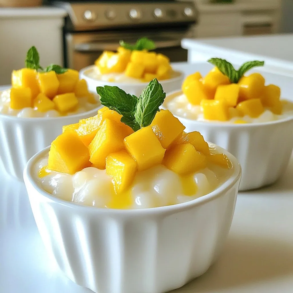- 1/2 cup small tapioca pearls - 2 cups coconut milk - 1 cup mango puree (fresh or canned) - 1/4 cup sugar (adjust to taste) - 1/2 teaspoon vanilla extract - 1/4 teaspoon salt The main ingredients of this pudding create a creamy and fruity dessert. The small tapioca pearls are key. They give the pudding its unique texture. You can find them easily in most grocery stores. Coconut milk adds richness and a tropical taste. The mango puree brings sweetness and bright flavor. You can use fresh mango or canned puree based on what you have. - 1 ripe mango, diced (for topping) - Mint leaves (for garnish) The toppings make this pudding even better. Fresh diced mango adds a burst of flavor. It also gives a nice color contrast. Mint leaves bring a refreshing touch. They look great on top of the pudding. You can use fresh or canned mango puree for this recipe. Fresh mango gives a bright taste, while canned is easy and quick. If you want to try a different sweetness, use honey or maple syrup instead of sugar. Just remember to adjust the amount based on your taste. {{ingredient_image_1}} - Rinse the tapioca pearls under cold water. Use a fine-mesh strainer. Keep rinsing until the water runs clear. This step cleans the pearls and helps with cooking. - In a medium saucepan, combine 2 cups of coconut milk, 1/4 cup of sugar, and 1/4 teaspoon of salt. Heat this mixture over medium heat. You want it warm, but not boiling. - Add the rinsed tapioca pearls to the coconut milk mixture. Stir well to mix everything together. - Reduce the heat to low. Let it simmer for 15-20 minutes. Stir occasionally. The tapioca pearls will become translucent, and the mixture will thicken. - Once thickened, remove the saucepan from heat. Add 1/2 teaspoon of vanilla extract and half of the mango puree (reserve the other half for serving). Stir to combine. - Let the pudding cool slightly. Then, transfer it into serving bowls or cups. - Refrigerate the pudding for at least 2 hours. This helps it set completely. - When ready to serve, top each bowl with the reserved mango puree and diced mango. Garnish with fresh mint leaves for a pop of color. Enjoy your delicious coconut mango tapioca pudding! To get the best texture for your pudding, cooking time is key. If you want a thicker pudding, let it simmer a bit longer. Keep stirring as it cooks to avoid sticking. This helps the tapioca pearls cook evenly. The pearls should become clear and slightly chewy. If they are still hard, give them more time. To boost the flavor, try adding a pinch of cinnamon or nutmeg. You can also mix in a splash of lime juice for a zesty kick. Pairing with other fruits, like pineapple or berries, adds freshness. These fruits complement the sweet mango and creamy coconut. Experiment with different fruit combinations to find your favorite. Watch out for overcooking the tapioca. If you cook it too long, the pearls can become mushy. On the other hand, undercooking leaves them hard. Aim for that perfect chewy texture. Also, be careful with sugar. Adding too much can make the pudding overly sweet. Adjust the sugar to your taste for the best result. Pro Tips Perfect Tapioca Texture: Ensure that you rinse the tapioca pearls thoroughly to remove excess starch, which helps achieve a smoother texture in your pudding. Adjusting Sweetness: Taste the pudding before chilling it. You can adjust the sweetness by adding more sugar if desired, but remember that the mango puree will also add sweetness. Chill for Best Results: Allow the pudding to chill for at least 2 hours. This helps the flavors meld together and gives the pudding a firmer texture. Garnish Creativity: Feel free to experiment with toppings! Consider adding toasted coconut flakes or a drizzle of honey for extra flavor and texture. {{image_2}} You can switch up the taste of your coconut mango tapioca pudding in fun ways. One great option is to add passion fruit. The tangy flavor of passion fruit boosts the tropical vibe. Just mix in some fresh passion fruit juice with your mango puree. It adds a zing you will love. Another exciting twist is using green tea. Simply brew some green tea and let it cool. Replace part of the coconut milk with this tea. The earthy notes of green tea mix well with coconut. It offers a unique and calming dessert experience. If you want a vegan version, you are in luck! The recipe is already vegan. Just use plant-based sugar to keep it vegan-friendly. This ensures all your guests can enjoy this pudding. For a low-sugar option, try using a sugar substitute. Stevia or monk fruit sweetener works great. You can adjust the amount to fit your taste. It keeps the pudding sweet without the added sugar. Serving style can change your dessert game. You can create layered dessert cups by alternating layers of pudding and fruit. Start with the pudding, then add diced mango and repeat. This makes a beautiful and tasty treat. Another idea is to serve tapioca in a parfait-style. Use a tall glass and layer tapioca, mango puree, and fresh mango. Top with mint leaves for a pop of color. This style makes each bite a joy. To keep your coconut mango tapioca pudding fresh, store leftovers in the refrigerator. Use a tight lid or plastic wrap to cover the pudding. This helps prevent it from absorbing other smells in the fridge. Glass containers work well for storage. They are easy to clean and do not stain. Can you freeze coconut mango tapioca pudding? Yes, you can freeze it. However, the texture may change once thawed. To freeze, place the pudding in an airtight container. Leave some space at the top, as it may expand. Tips for thawing and serving: When you're ready to eat it, move the container to the fridge for about 6-8 hours. This will help it thaw slowly. Stir it before serving to make it creamy again. You can also add fresh toppings after thawing for a better taste. How long does it last in the fridge? The pudding stays good for about 4-5 days. If you see any water on top or a strange smell, it’s time to t