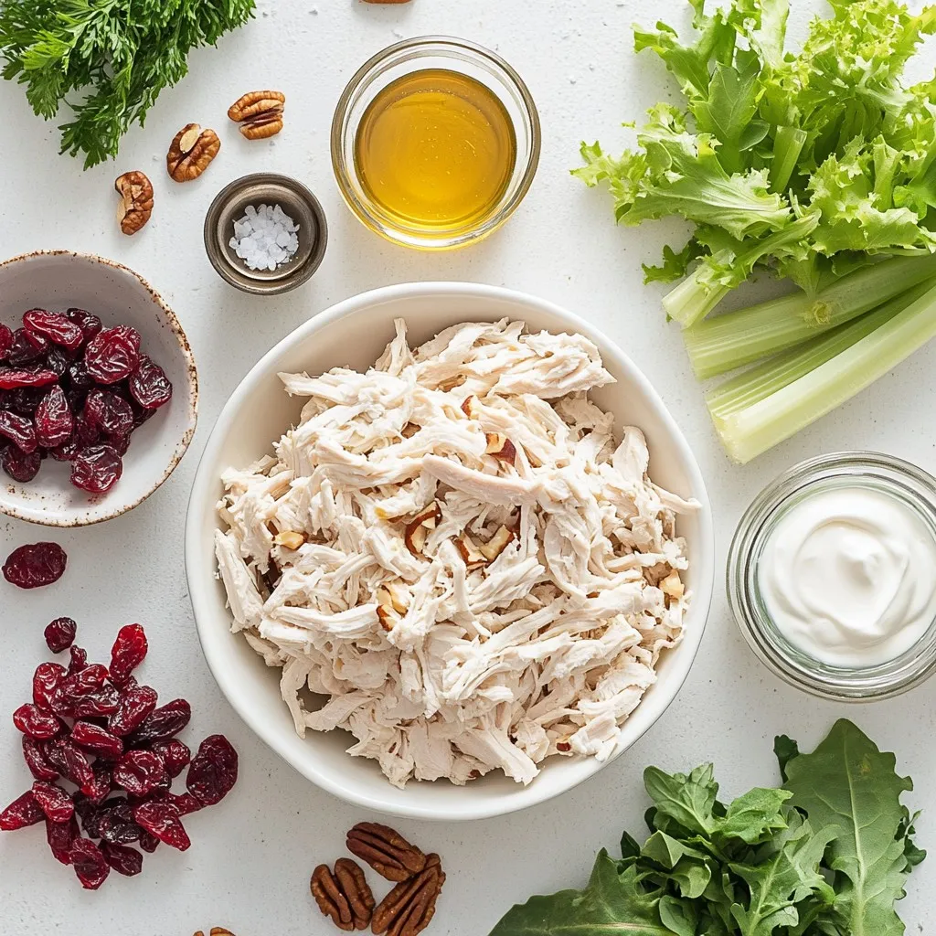 For this cranberry pecan chicken salad, you need a mix of fresh and hearty ingredients. I like to use cooked chicken breast that is shredded. It gives a nice base and adds protein. Dried cranberries bring a sweet and tart flavor. Pecans add a crunchy texture and nutty taste.
