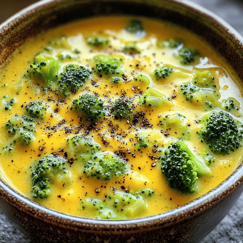 For this creamy broccoli cheddar soup, you will need: - 1 large head of broccoli, chopped into florets - 1 medium onion, diced - 2 cloves garlic, minced - 1 medium potato, peeled and diced I always choose fresh broccoli when I can. It tastes better and has more nutrients. Fresh broccoli also has a nice crunch. Frozen broccoli can work in a pinch, but it may be softer and lose some flavor. If you use frozen, make sure to adjust the cooking time so it doesn’t overcook. You will also need some key kitchen staples: - 2 cups vegetable broth - 1 cup heavy cream - 2 cups cheddar cheese, shredded For seasoning, gather these essentials: - Salt and pepper to taste - 1 teaspoon dried thyme - 1/2 teaspoon nutmeg (optional) Vegetable broth gives the soup a rich flavor. Heavy cream adds that creamy texture we love. Shredded cheddar cheese melts in beautifully, making the soup yummy and cheesy. Salt and pepper bring out the flavors, while thyme adds a nice herbal note. Nutmeg can enhance the soup’s warmth, but it’s up to you if you want to add it. To start, heat two tablespoons of olive oil in a large pot over medium heat. Add one medium onion, diced. Sauté the onion for about five minutes until it looks clear. Next, add two cloves of minced garlic. Cook this mix for another minute. You will smell the garlic's strong aroma. Now it's time for the veggies! Add one medium potato, peeled and diced. Then, toss in one large head of broccoli, chopped into florets. Pour in two cups of vegetable broth. Bring the mix to a boil. After it boils, lower the heat. Let it simmer for about 15 to 20 minutes. The veggies should be soft enough to blend. For a smooth soup, you can use an immersion blender. This tool lets you blend right in the pot. If you don’t have one, carefully transfer the soup in batches to a regular blender. Remember to let steam escape. Blend until the soup is nice and smooth. Return the blended soup to the pot. Now, stir in one cup of heavy cream. This will make your soup rich and creamy. Gradually add two cups of shredded cheddar cheese. Keep stirring until the cheese melts completely. To finish, season your soup. Add salt and pepper to taste. Use one teaspoon of dried thyme for added flavor. If you like, sprinkle in half a teaspoon of nutmeg. This spice adds a warm note. Taste the soup and adjust if needed. Let it simmer on low heat for another five to ten minutes. This lets the flavors blend perfectly. To get the right texture for your creamy soup, aim for a smooth and velvety finish. After cooking your veggies, use an immersion blender to puree them. If you don't have one, carefully blend the soup in batches. This method helps avoid lumps. If your soup is too thick, add a splash of vegetable broth or water. Stir well to combine. If it's too thin, simmer it longer to thicken the soup. You can also add more potatoes to help with this. To elevate the flavor, consider adding fresh herbs like parsley or basil. They bring brightness to the dish. You can also try spices like smoked paprika for a warm kick. When it comes to cheese, I recommend sharp cheddar for a bold taste. You can also mix in Gruyère for extra creaminess and depth. For a lovely presentation, serve the soup in deep bowls. Top it with extra shredded cheese and a sprinkle of fresh black pepper. A drizzle of olive oil adds a nice touch. Pair your soup with a warm crusty bread or a fresh salad. A light side helps balance the richness of the soup. {{image_2}} You can make this soup fit different diets. To make it gluten-free, just use gluten-free broth. For a dairy-free version, switch heavy cream with coconut milk or a nut milk. If you’re vegetarian, you are good to go! For a vegan twist, swap out the cheese with a plant-based alternative. Adding more veggies can change the taste. Try carrots or spinach for extra nutrients. You can also toss in proteins. Cooked chicken or crispy bacon will add heartiness to the soup. Both options make it more filling and fun. Want to spice it up? Add a pinch of cumin or curry powder for a new flavor. You can also mix in some fresh herbs like cilantro or basil to brighten the soup. If you want a smoky taste, add smoked paprika. These simple changes can make your soup unique and exciting. To keep leftover soup fresh, store it in an airtight container. Make sure the soup cools down first. Place it in the fridge within two hours of cooking. You can keep it in the fridge for about 3 to 4 days. Check for any off smells or changes in texture before eating. If you want to freeze the soup, let it cool completely. Once cooled, pour the soup into freezer-safe bags or containers. Leave some space for the soup to expand. You can store it in the freezer for up to 3 months. To thaw, place the soup in the fridge overnight. When reheating, the stovetop is best for even heating. Pour the soup into a pot and heat over medium. Stir often to avoid burning. You can also use a microwave, but use a microwave-safe bowl. Heat it in 1-minute intervals, stirring in between. This helps keep the texture and flavor nice. How can I make this soup ahead of time? You can make this soup up to two days ahead. Just cook it as usual. Let it cool, then store it in an airtight container in the fridge. When ready to eat, reheat on the stove. Add a bit more cream if needed. Can I use other types of cheese for this recipe? Yes! You can use other cheeses like Gouda or Monterey Jack. Each cheese will give the soup a unique taste. Just make sure it melts well for the best texture. Is this soup healthy? This soup can be healthy. It has broccoli, which is rich in vitamins. The heavy cream and cheese add fat, so enjoy in moderation. Pair it with a salad for a balanced meal. What are the calorie counts for a serving? One serving of this soup has around 400 calories. This can vary based on the cheese and cream you use. Always check your ingredients for more precise numbers. What can I use instead of heavy cream? You can use half-and-half or wh