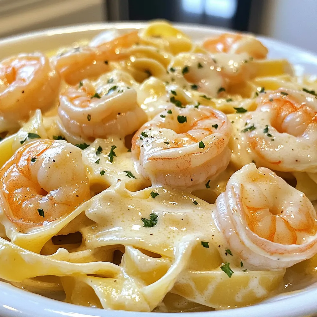 To make this creamy garlic shrimp Alfredo, you need to gather some key ingredients. First, get 8 ounces of fettuccine pasta. This pasta holds the sauce well and adds a nice texture. Next, pick up 1 pound of large shrimp. Make sure they are peeled and deveined for quick cooking.