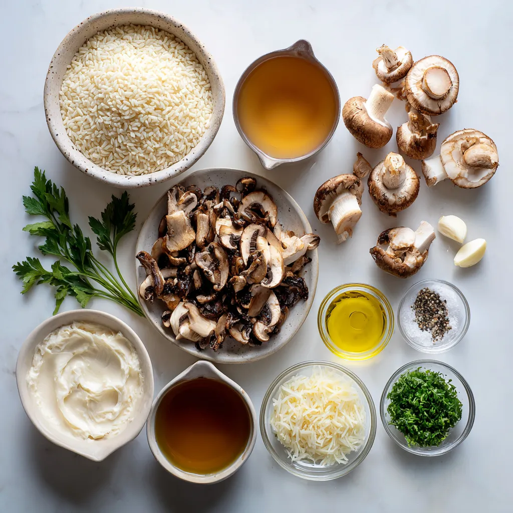 The main ingredients in this creamy mushroom risotto are essential for a rich flavor. Arborio rice gives the dish its creamy texture. It has a high starch content that releases when you cook it. The mixed mushrooms add depth with their unique tastes. I love using shiitake, cremini, and button mushrooms together.
