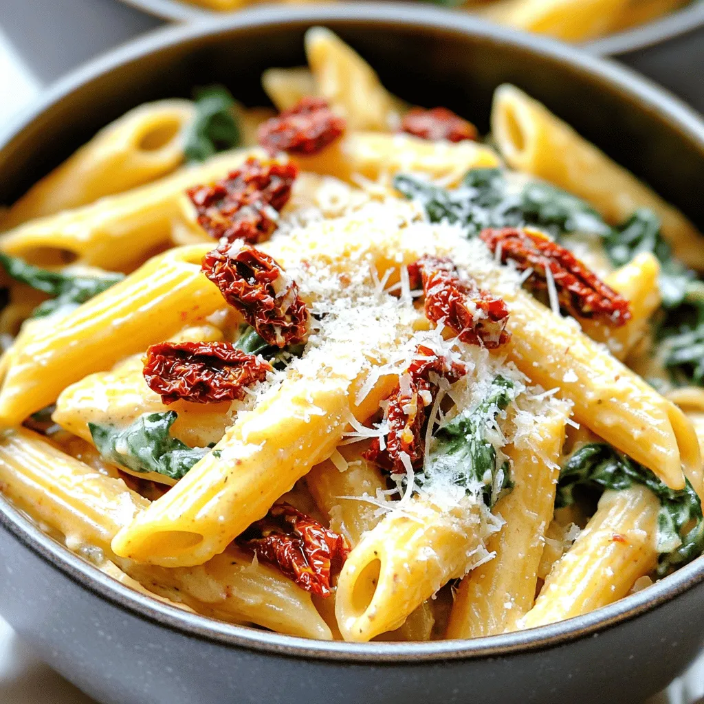 - Pasta options: - 12 oz (340g) penne pasta works great here. You can use any pasta shape you like, but penne holds the sauce well. - Fresh vegetables: - 1 cup sun-dried tomatoes in oil, drained and sliced adds a burst of flavor. - 3 cups fresh spinach gives color and nutrients to the dish. - Dairy and alternatives: - 1 cup heavy cream makes the sauce rich and creamy. Use a dairy-free alternative if you prefer. - ½ cup grated Parmesan cheese adds a cheesy finish. For vegan, try nutritional yeast. - Seasonings and oils: - 2 tablespoons olive oil is perfect for sautéing. - 1 teaspoon dried oregano and 1 teaspoon dried basil enhance the flavors. - Salt and pepper to taste bring everything together. - Broth and seasonings: - 4 cups vegetable broth provide the base for cooking the pasta. - Red pepper flakes are optional if you like a bit of heat. These ingredients blend to create a creamy delight that is quick and easy to make. You’ll love how they come together in one pot. Happy cooking! Start by heating olive oil in a large pot over medium heat. Add the diced onion and sauté for about 3-4 minutes. You want the onion to turn clear. Next, toss in the minced garlic for one more minute. Keep stirring so it won't burn. Now, add the sun-dried tomatoes, dried oregano, and dried basil. Cook this mix for about 2 minutes to let those flavors come together. The aroma will make your kitchen feel warm and inviting. Pour in the vegetable broth and bring it to a boil. Once it bubbles, add 12 ounces of penne pasta. Stir well so the pasta is fully covered. Lower the heat to a simmer and cook uncovered for 10-12 minutes. Stir occasionally to keep the pasta from sticking. You want it to be al dente, with some liquid still left in the pot. When the pasta is nearly done, add 3 cups of fresh spinach and 1 cup of heavy cream. Stir until the spinach wilts and the mixture turns creamy. This step adds a lovely color and richness to your dish. Season with salt, pepper, and red pepper flakes if you like heat. Stir in ½ cup of grated Parmesan cheese until it melts completely. Remove the pot from heat and let it sit for a few minutes to thicken. Taste and adjust seasoning if needed. Now, your creamy sun-dried tomato spinach pasta is ready to serve! Enjoy every bite of this one-pot delight. To make your pasta creamy, adjust the liquid. If it seems too thick, add a bit more broth or cream. The right balance ensures a smooth texture. For cream alternatives, you can use coconut cream or cashew cream. Both add a nice flavor without dairy. Spices and herbs can take your dish up a notch. Try adding garlic powder, thyme, or even a squeeze of lemon juice. They add depth to the taste. For serving, garnish with extra Parmesan cheese and fresh basil. A sprinkle of red pepper flakes gives it a nice kick, too. Timing is key for al dente pasta. Cook the penne for about 10-12 minutes. Stir occasionally to prevent sticking. This keeps your pasta from getting mushy. Stirring during cooking helps mix in the flavors. It also ensures an even cook. Enjoy the process and watch your dish come alive! {{image_2}} You can easily add protein to your creamy sun-dried tomato spinach pasta. If you want meat, try chicken or shrimp. Cook the chicken in cubes until golden brown. Then, add the sun-dried tomatoes and herbs. For shrimp, toss them in during the last few minutes of cooking. They cook quickly and add great flavor. If you prefer plant-based options, consider chickpeas or tofu. Cook cubed tofu until crispy, then mix it in. Chickpeas add nice texture and protein. They pair well with the creamy sauce. For a vegetarian dish, you can swap heavy cream for plant-based cream. Almond or coconut cream works great. It keeps the dish creamy while being dairy-free. If you're vegan, use nutritional yeast instead of Parmesan cheese. It adds a cheesy flavor without any dairy. Mix it in just before serving for the best taste. Feel free to switch pasta shapes. While penne is great, fusilli or farfalle also work well. These shapes hold the sauce nicely. You can also add different vegetables. Try bell peppers, zucchini, or mushrooms. They add color and nutrition. Just sauté them with the onions and garlic for extra flavor. To keep your creamy sun-dried tomato spinach pasta fresh, follow these tips: - Store leftovers in airtight containers. - Let the pasta cool before sealing. - Refrigerate within two hours of cooking. - Use leftovers within three days for best taste. If you want to save some for later, freezing is a great option: - Place cooled pasta in freezer-safe containers. - Leave a little space for expansion. - Label containers with the date. - Use within three months for best quality. When it's time to enjoy your pasta again, reheating is easy: - Heat in a pot over low heat. - Add a splash of vegetable broth or cream to keep it moist. - Stir often to avoid sticking. - For microwave reheating, cover with a lid to keep moisture in. By following these storage tips, your creamy sun-dried tomato spinach pasta will taste just as good the next time you serve it! This dish takes about 30 minutes total. You need about 10 minutes for prep. The cooking time is around 20 minutes. This includes the time to sauté, boil, and simmer everything in one pot. Yes, you can! Look for gluten-free penne or any pasta made from rice or lentils. Many brands offer tasty options that work well in this recipe. Just remember to check the cooking time on the package. Gluten-free pasta may need a bit longer to cook. If you can't find sun-dried tomatoes, try using fresh tomatoes. Chop them and sauté until soft. You can also use roasted red peppers for a different flavor. Both options will give your dish a nice taste. Yes, you can use frozen spinach! Just remember to thaw it first. Squeeze out excess water before adding it to the pot. It will blend well with the cream and other ingredients. This option saves time and still gives great flavor. This blog post covered how to make a de