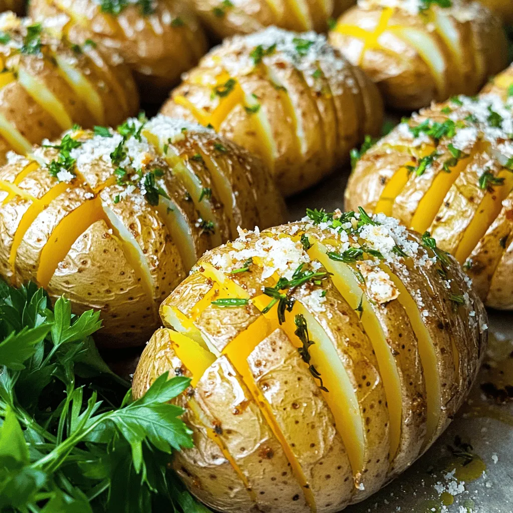 - 4 medium-sized russet potatoes - 4 tablespoons olive oil - 4 cloves garlic, minced - 2 teaspoons fresh rosemary, finely chopped - 2 teaspoons fresh thyme, finely chopped - 1 teaspoon sea salt - ½ teaspoon black pepper - 2 tablespoons grated Parmesan cheese (optional) - Fresh parsley for garnish For these Garlic Herb Hasselback Potatoes, you start with four medium russet potatoes. They are great for baking. Next, you need four tablespoons of olive oil. This oil gives a rich flavor and helps the potatoes crisp up. You will also need four cloves of minced garlic. Garlic adds a tasty punch to the dish. Fresh herbs are key too. You will need two teaspoons of finely chopped rosemary and two teaspoons of finely chopped thyme. These herbs brighten the flavor. Add one teaspoon of sea salt and half a teaspoon of black pepper for seasoning. If you want extra flavor, consider adding two tablespoons of grated Parmesan cheese. This is an optional step but adds a nice touch. Finally, some fresh parsley for garnish makes the dish look lovely. Gather all these ingredients, and you’re ready to create a side dish that will impress anyone! - Preheat your oven to 425°F (220°C). - Line a baking sheet with parchment paper. - Wash and scrub the potatoes well to remove dirt. - Dry the potatoes using a kitchen towel. - In a small bowl, mix the olive oil, minced garlic, chopped rosemary, and chopped thyme. - Add the sea salt and black pepper. Stir well to combine. - Take a sharp knife and make vertical slits in each potato. - Space the cuts about 1/8 inch apart. - Don’t cut all the way through; leave about 1/4 inch at the bottom. - Place the potatoes on the baking sheet. - Brush the garlic herb oil mixture generously over each potato. - Make sure some oil seeps into the slits. - Bake for 45-50 minutes until they are crispy outside and tender inside. - If using Parmesan cheese, sprinkle it on top in the last 10 minutes of baking. - Once done, remove from the oven and let cool a bit. - Garnish with fresh parsley before serving. When making Hasselback potatoes, uniform slicing is key. To slice evenly, place a wooden spoon on each side of the potato. This will stop your knife from cutting all the way through. Aim for slits about 1/8 inch apart. This creates nice gaps for flavor. To ensure even coating of the oil mixture, use a brush. Dip it into the garlic herb oil and apply it generously. Brush over the tops and let some seep into the slits. This way, every bite will be full of taste. You can boost the flavor with more herbs or spices. Try adding some fresh basil or chives for a fresh kick. A sprinkle of smoked paprika adds a nice depth. If you love heat, a pinch of red pepper flakes works well. Using Parmesan cheese can elevate your dish. For best results, add it during the last ten minutes of baking. This allows it to melt and get crispy. Remember, fresh grated cheese melts better than pre-packaged. Baking time can change with the size of your potatoes. If your potatoes are larger, add about 10 minutes to the total bake time. Start checking them at 50 minutes. To check for doneness, use a fork. It should easily pierce through the potato. If it feels firm, give it more time. You want them soft inside and crispy outside. {{image_2}} You can use more than just russet potatoes. Other great options include Yukon Gold and red potatoes. Each type offers a different taste and texture. Yukon Golds are creamy and buttery. Red potatoes provide a waxy feel, perfect for this recipe. Another fun twist is using sweet potatoes. Their natural sweetness contrasts nicely with garlic and herbs. Roast them the same way, and you’ll have a colorful and tasty dish. If you want a garlic-free version, try using onion powder instead. It gives a nice flavor without the garlic. For a vegan option, skip the cheese or use a vegan alternative. Nutritional yeast can add a cheesy taste while keeping it plant-based. You can also swap out the herbs. Try using oregano or basil for a different flavor. Just remember to chop fresh herbs finely. Dried herbs work, too, but use less since they are more potent. After baking, you can add fun toppings. Crumbled bacon or crispy onions give a nice crunch. A dollop of sour cream or Greek yogurt adds creaminess. Freshly chopped chives or green onions will brighten the dish. For a spicy kick, sprinkle some red pepper flakes on top. You can always mix and match to find your perfect combo. Let your creativity shine, and enjoy customizing your Garlic Herb Hasselback Potatoes! To keep your leftover Garlic Herb Hasselback Potatoes fresh, first let them cool. Place them in an airtight container. Store them in the fridge for up to three days. When you want to eat them again, reheat in the oven. This method helps keep the crispiness. Set your oven to 350°F (175°C) and bake for about 15-20 minutes. You can also use a microwave, but the texture may change. If you want to freeze these tasty potatoes, you can do it both ways. For freezing before baking, slice and prep the potatoes as usual. Brush them with the oil mixture, then wrap them tightly in foil. Place in a freezer bag and store for up to three months. For freezing after baking, cool them first. Then, wrap the baked potatoes in foil and place them in a freezer bag. They will last about two months. When thinking about shelf life, here are some quick notes. Fresh potatoes can last for several weeks in a cool, dark place. Olive oil stays good for about a year when stored properly. Garlic can last up to a month if kept in a cool spot. Fresh herbs like rosemary and thyme are best used within a week for peak flavor. Grated Parmesan cheese should be used within a week of opening for the best taste. To check if your potatoes are done, use a fork. Insert it into the potato. If it goes in easily, they are ready. The outside should be crispy, while the inside feels soft. This usually takes about 45 to 50 minutes at 425°F. Yes, you can prepare Hasselback potatoes in 