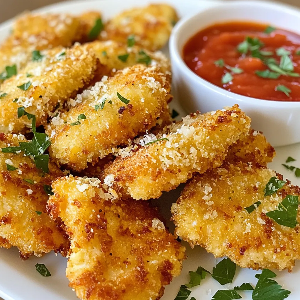 - 1 lb chicken breast, cut into bite-sized pieces - 1 cup all-purpose flour - 2 large eggs, beaten - 1 cup breadcrumbs (preferably panko for extra crunch) - 1/2 cup grated Parmesan cheese - 4 cloves garlic, minced - 1 teaspoon dried oregano - 1 teaspoon paprika - Salt and pepper to taste - Olive oil spray - Parchment paper Gathering these ingredients is easy. You can find chicken breast at any store. Panko breadcrumbs give a great crunch. Grated Parmesan adds a sharp taste. Fresh garlic brings out the best flavor. The spices enhance everything, making each bite special. Parchment paper helps the nuggets bake without sticking. Olive oil spray keeps them crispy without adding too much fat. Using these fresh and simple ingredients makes this snack a favorite. You can easily adjust the spices to fit your taste. Want it spicier? Add some cayenne pepper. Prefer more cheese flavor? Toss in extra Parmesan. Cooking should be fun, and these nuggets let you explore. {{ingredient_image_1}} First, you need to preheat your oven to 400°F (200°C). This step is key for a nice, crispy texture. Next, line a baking sheet with parchment paper. This will stop the nuggets from sticking. Now, let’s mix the ingredients. In a shallow dish, combine 1 cup of all-purpose flour with a pinch of salt and pepper. In another shallow dish, beat 2 large eggs. In a third shallow dish, mix 1 cup of breadcrumbs, 1/2 cup of grated Parmesan cheese, 4 minced garlic cloves, 1 teaspoon of dried oregano, and 1 teaspoon of paprika. This mix brings great flavor! It’s time to coat the chicken! Start by dipping each piece into the flour mixture. Make sure to coat it well. After that, shake off any excess flour. Next, dip the chicken into the beaten eggs. Allow any extra egg to drip off. Finally, coat the chicken with the breadcrumb mixture. Press gently to make sure it sticks well. This step is important for that crunchy texture. Place the coated nuggets on your baking sheet. If you want, lightly spray the tops with olive oil. This helps them get even crispier in the oven. Now, let’s bake! Place the baking sheet in the preheated oven. Bake the chicken nuggets for 15 to 20 minutes. They should turn golden brown and be fully cooked. Halfway through, flip the nuggets for even cooking. This ensures each side gets that perfect crunch. Once baked, let them rest for a minute before serving. This helps them stay juicy inside. Enjoy your tasty garlic Parmesan chicken nuggets! To get that perfect crunch, I always choose panko breadcrumbs instead of regular ones. Panko is lighter and crispier, which makes your nuggets extra crunchy. When you coat your chicken, spray a bit of olive oil on top. This helps achieve that golden color and crispiness. The oil brings out the best in the breadcrumbs. Want to spice things up? You can add other herbs or spices to the breadcrumb mix. Try some Italian seasoning, garlic powder, or even a touch of cayenne for heat. These additions will take your nuggets to the next level. For dips, I love serving them with marinara or garlic aioli. Both pair well with the garlic and cheese flavor. You can choose to bake or fry your nuggets. Baking is great if you want a healthier option. Just remember to flip them halfway through cooking. If you prefer frying, use a pan with hot oil for a crispy finish. Air fryers are another fantastic choice. They cook the nuggets quickly and keep them crispy without much oil. Pro Tips Use Fresh Garlic: Freshly minced garlic gives a robust flavor that powdered garlic cannot replicate. Make sure to use fresh cloves for the best taste! Double-Dip for Extra Crunch: For an even crunchier texture, dip the chicken nuggets in the egg mixture twice before coating them in breadcrumbs. Experiment with Seasonings: Feel free to customize your breadcrumb mixture with different herbs and spices like Italian seasoning or cayenne pepper for a kick! Let Them Rest: Allowing the baked nuggets to rest for a couple of minutes after cooking will help them retain their juiciness and make them easier to handle. {{image_2}} You can switch up the protein in your nuggets. Use chicken thighs or tenders instead of breast. Chicken thighs are juicier and add great flavor. Tenders also stay moist and cook quickly. You can also try turkey nuggets. They offer a leaner option with similar taste. For a plant-based choice, look for veggie or tofu nuggets. They absorb flavors well and make a tasty alternative. Change the cheese for a fun twist. Try cheddar for a sharper taste. Mozzarella gives a milder, creamy flavor. Adjust the garlic to suit your taste. Use less for a subtle hint or more for a bold kick. You can even swap fresh garlic for garlic powder. This makes it easier and just as tasty. Pair these nuggets with different sauces. BBQ sauce adds a nice sweetness. Ranch dressing is creamy and cool. You can also try garlic aioli for a rich flavor. Serve with fresh veggies like carrot sticks or a crisp salad. The crunch of veggies balances the hearty nuggets. This makes for a fun and healthy snack or meal. To store leftover chicken nuggets, place them in an airtight container. Make sure they cool down first. You can keep them in the fridge for up to three days. It is best to eat them within this time for the best taste and texture. For freezing, let the nuggets cool completely. Then, place them in a freezer-safe bag. Remove as much air as possible before sealing. You can freeze them for up to three months. When you want to eat them, take them out and let them thaw overnight in the fridge. You can reheat the nuggets in an oven, microwave, or air fryer. For the oven, preheat it to 375°F (190°C). Bake for about 10-12 minutes until crispy. In the microwave, heat for about 1-2 minutes. But be careful, as this can make them soggy. The air fryer is a great option too. Set it to 375°F (190°C) and cook for about 5-7 minutes. This method keeps them crunchy and delicious. To make these nuggets crispy, focus on the coating and o