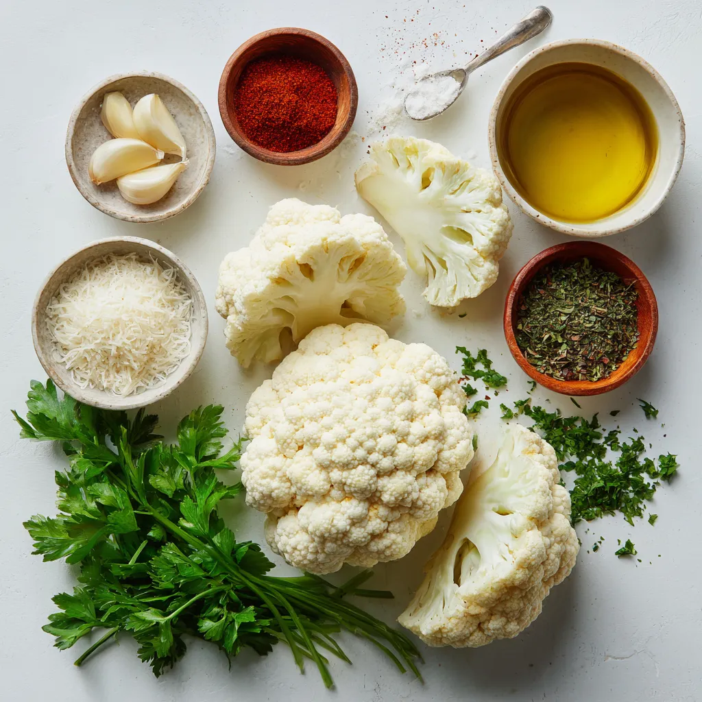 These ingredients work together to create a flavor-packed dish. The cauliflower provides a tasty base, while garlic, Parmesan, and spices add depth.