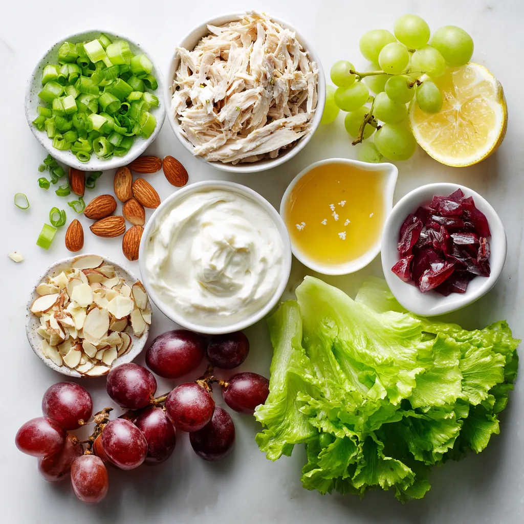 The main ingredients create a base of protein and flavor. Shredded chicken breast gives your salad protein and texture. I prefer using cooked chicken for ease. Plain Greek yogurt acts as a creamy base that keeps it healthy.