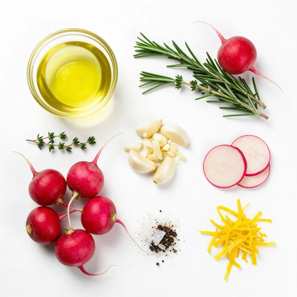The ingredients for this dish are simple and fresh. Radishes shine here, offering a crisp texture. Olive oil adds richness, while garlic brings a strong, savory flavor. Fresh rosemary and thyme enhance the dish with herbal notes. Salt and pepper help balance and elevate all the flavors. Finally, lemon zest adds brightness right before serving.