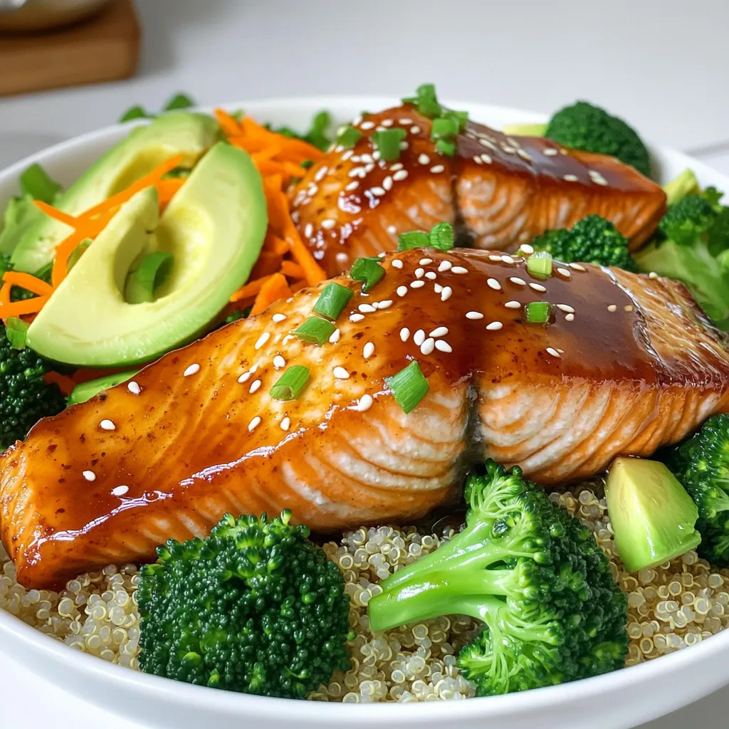 To make Honey Garlic Salmon Bowls, gather these items: - 2 salmon fillets (6 ounces each) - 2 tablespoons honey - 2 tablespoons soy sauce (or tamari for gluten-free) - 2 cloves garlic, minced - 1 teaspoon grated ginger - 2 cups cooked quinoa - 1 cup steamed broccoli florets - 1/2 cup shredded carrots - 1 avocado, sliced - Sesame seeds for garnish - Green onions, chopped, for garnish - Salt and pepper to taste This dish offers a great balance of nutrients. Each serving provides protein from salmon, fiber from quinoa and veggies, and healthy fats from avocado. - Calories: About 550 - Protein: 35g - Fat: 25g - Carbohydrates: 50g - Fiber: 10g - Sugar: 8g These values may vary based on specific brands and portion sizes. I love to keep this dish simple, but you can add more flavor. Try these seasonings: - Lemon zest for a fresh twist - Chili flakes for some heat - Fresh herbs like cilantro or parsley for brightness Adjust the flavors to suit your taste. Enjoy experimenting! To start, get a small bowl. In this bowl, whisk together 2 tablespoons of honey, 2 tablespoons of soy sauce, 2 cloves of minced garlic, and 1 teaspoon of grated ginger. This mix will make a sweet and savory sauce. It adds a lot of flavor to the salmon. Make sure all the ingredients blend well. Set this aside; you’ll use it soon. Next, we need to cook the salmon. Preheat a non-stick skillet over medium-high heat. While it heats, season 2 salmon fillets with salt and pepper on both sides. Once the skillet is hot, place the salmon in it, skin-side down. Pour half of the marinade over the salmon. Cook it for about 4 to 5 minutes. Flip the fillets carefully and pour the rest of the marinade on top. Cook for another 3 to 4 minutes. The salmon is ready when it flakes easily with a fork. Now, it’s time to put everything together. Grab serving bowls and layer in the cooked quinoa first. Add the steamed broccoli and shredded carrots next. Slice the avocado and place pieces on top. Finally, add a salmon fillet to each bowl. Drizzle the delicious pan sauce over the salmon. For the finishing touch, sprinkle sesame seeds and chopped green onions on top. This makes each bowl look bright and tasty. Enjoy your meal while it’s warm! To save time, you can prep your ingredients ahead. Cook the quinoa and steam the broccoli the day before. Store them in the fridge. This way, you just need to heat them up. You can also make the marinade ahead. Keep it in a jar, and it will stay fresh for a week. When you are ready to cook, just grab everything. This makes the process quick and easy. For the best salmon, always use a non-stick skillet. Heat it well before adding the fish. This helps to get a nice sear. Always cook the salmon skin-side down first. This keeps the fish moist and flavorful. When flipping, be gentle to avoid breaking the fillet. Cook until the salmon flakes easily with a fork. This means it’s done and perfect to eat. To make your Honey Garlic Salmon Bowls look great, use a colorful array of ingredients. Start with a base of quinoa. Add bright broccoli and vibrant carrots. Place the salmon neatly on top. The green avocado adds a nice touch. Drizzle the pan sauce over the salmon for shine. Finish with a sprinkle of sesame seeds and green onions. Serve the bowls warm for the best experience. {{image_2}} You can easily swap some ingredients. Try using maple syrup instead of honey. It gives a nice sweetness. For the soy sauce, use tamari if you need a gluten-free option. You can replace salmon with another fish, like trout or tilapia. If you prefer chicken, use chicken breast fillets. For the veggies, feel free to use snap peas or bell peppers instead of broccoli and carrots. While I love quinoa for its nutty flavor, you can choose other grains too. Brown rice works well and adds a hearty touch. If you want something lighter, use cauliflower rice. You could even try farro or barley for a chewy texture. Each grain brings a unique flavor and nutrition to your bowl. Want to jazz up your dish? Add some chili flakes for heat. Toss in fresh herbs like cilantro or basil for a fragrant twist. You can also mix in sesame oil for extra depth. A squeeze of lime or lemon juice brightens the flavors too. Experiment with these ideas to make your Honey Garlic Salmon Bowls your own! To store leftover Honey Garlic Salmon Bowls, let them cool first. Place them in an airtight container. You can keep them in the fridge for up to three days. Make sure to separate the salmon from the quinoa and veggies to keep them fresh. When you are ready to eat your leftovers, you can reheat them easily. Use a microwave for quick warming. Heat for one to two minutes, stirring halfway through. If you prefer, you can reheat the salmon in a skillet over low heat. This keeps the salmon moist and tasty. If you want to freeze your bowls, it’s best to freeze the salmon and quinoa separately. Place them in freezer-safe bags or containers. They can last up to three months in the freezer. When you are ready to eat, thaw them in the fridge overnight. Then reheat as described above. It takes just 15 minutes to make Honey Garlic Salmon Bowls. You spend 5 minutes prepping the ingredients and 10 minutes cooking. This quick meal fits into any busy day. You get a tasty dish without spending hours in the kitchen. Yes, you can use frozen salmon for this recipe. Just thaw the salmon before you cook it. You can place the frozen fillets in the fridge overnight to thaw. If you're in a rush, you can also run cold water over the fillets for a quicker thaw. Just make sure to pat them dry before seasoning. You can serve Honey Garlic Salmon Bowls with a variety of sides. Here are some ideas: - Steamed asparagus - Roasted sweet potatoes - Mixed greens salad - Sautéed spinach - Brown rice or cauliflower rice Adding these options makes the meal even more delicious and filling. You can mix and match based on your taste and what you have on hand. In this blog post, we explored how to make Honey Ga
