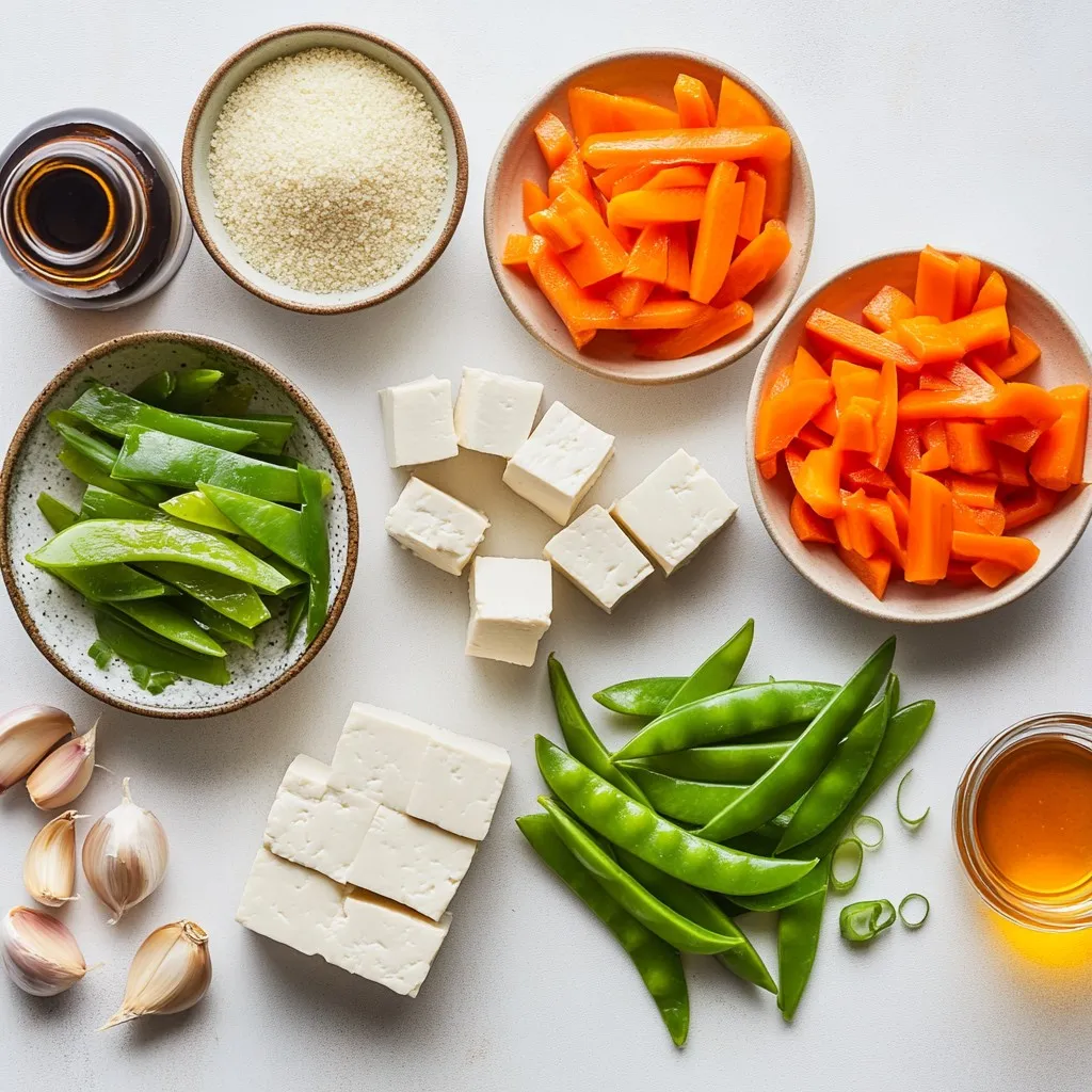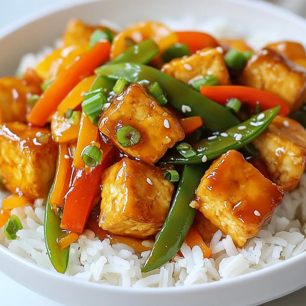 - 1 block firm tofu, pressed and cubed - 2 tablespoons honey - 3 cloves garlic, minced - 1 bell pepper, sliced (any color) - 1 cup snap peas - 1 carrot, julienned - 1 tablespoon soy sauce - 1 tablespoon sesame oil - 1 tablespoon ginger, minced - 1 tablespoon cornstarch Honey Garlic Tofu Stir Fry is a delicious meal packed with flavor and nutrients. It uses firm tofu as the main protein. Pressing the tofu helps it absorb all the tasty sauce. The honey adds a sweet touch, while garlic brings a warm aroma. The veggies in this stir fry make it colorful and fun. Bell peppers offer crunch and sweetness. Snap peas add a fresh taste, and carrots bring a nice texture. These vegetables cook quickly, keeping their bright colors. For the sauce, mix soy sauce, sesame oil, and minced ginger. This blend creates a rich, savory flavor. Cornstarch coats the tofu, making it crispy when cooked. Each bite is a delightful mix of sweet and savory. This dish is easy to make and great for any meal. You can serve it over rice or noodles to fill you up. With simple ingredients, you can create a healthy meal in no time. {{ingredient_image_1}} Start by pressing the tofu. Place the block on a plate. Use another plate on top. Add some weight to help squeeze out moisture. Let it sit for about 15-20 minutes. This step is key for crispy tofu. Once pressed, cut the tofu into bite-sized cubes. Aim for uniform pieces. This ensures even cooking. Next, grab a bowl and sprinkle cornstarch over the tofu cubes. Coat them well. The cornstarch gives the tofu a nice crunch when cooked. Now, let's make the sauce. In a small bowl, mix together honey, minced garlic, soy sauce, and sesame oil. Stir until combined. This sweet and savory mix will add great flavor to your dish. Set it aside for later. Heat a non-stick skillet or wok over medium-high heat. Add a drizzle of sesame oil. Then add the tofu cubes. Sauté for about 5-7 minutes. You want them golden brown and crispy on all sides. Remember to turn them occasionally for even cooking. Once done, remove the tofu and set it aside. In the same skillet, add more sesame oil if needed. Toss in sliced bell pepper, snap peas, and julienned carrots. Stir-fry these veggies for about 3-4 minutes. You want them tender but still crisp. Next, add minced ginger and the crispy tofu back into the skillet. Pour the honey-garlic sauce over everything. Mix well to coat all the ingredients. Cook for another 2-3 minutes. This allows the sauce to thicken slightly. Season with salt and pepper to taste. Finally, sprinkle chopped green onions on top before removing from heat. The dish is now ready to serve! To get crispy tofu, start by pressing it. Pressing removes extra water. This step makes the tofu firm and helps it fry better. Aim to press the tofu for about 15-20 minutes. After that, cut it into cubes. Next, coat the tofu cubes with cornstarch. This thin layer helps create a crispy crust when you fry it. Make sure every piece gets a good coating. To boost the flavor of your stir fry, think about adding spices. Red pepper flakes can add heat. A touch of smoked paprika brings a nice depth. Adding fresh herbs like basil can brighten the dish too. You may want to adjust the sweetness and saltiness. If you like it sweeter, add more honey. If it's too sweet, a splash of soy sauce can balance it out. Taste as you go! For serving, place the stir fry on a bed of rice or noodles. This makes it more filling and delicious. To add a pop of color, garnish with chopped green onions. You can also sprinkle sesame seeds on top. These small touches make your dish look and taste great! Pro Tips Press Tofu Thoroughly: Ensure to press the tofu for at least 15-20 minutes to remove excess moisture, which helps achieve a crispy texture when frying. Customize Your Vegetables: Feel free to mix and match your favorite vegetables such as broccoli, zucchini, or bok choy to add variety and nutrition to your stir fry. Adjust Sweetness: Depending on your taste preference, you can adjust the amount of honey in the sauce to make it sweeter or less sweet. Serve Immediately: For the best texture and flavor, serve the stir fry immediately after cooking, as the tofu can become soggy if it sits too long. {{image_2}} You can switch out tofu for chicken or shrimp if you like. Just cut the chicken into small pieces or use peeled shrimp. Cook them until golden brown, just like the tofu. This change keeps the dish tasty and adds a different flavor. If you want a plant-based option, try tempeh or seitan. Both have great textures and soak up flavors well. Just cube tempeh like you would tofu. For seitan, slice it thinly. You can still use the same sauce for a delicious meal. Feel free to mix in other veggies based on your taste. Broccoli, zucchini, or mushrooms work well in this stir-fry. You can also use leafy greens like spinach or bok choy. These add color and nutrients while keeping the dish light. Seasonal veggies can make this dish more fun. In summer, add fresh corn or bell peppers. In fall, try adding squash or sweet potatoes. These swaps keep your meal fresh and exciting all year long. To make this dish vegan-friendly, simply replace honey with maple syrup or agave. Both are great for adding sweetness without losing flavor. Ensure your soy sauce is labeled as vegan too. For a gluten-free option, use tamari instead of soy sauce. Tamari has a similar taste but lacks gluten. Check your cornstarch too, as most brands are gluten-free. These small swaps make the dish safe for everyone to enjoy. To keep your Honey Garlic Tofu Stir Fry fresh, store leftovers in the fridge. Place them in an airtight container. This helps to lock in flavor and moisture. I recommend using glass containers for better heat retention. If you have a lot of leftovers, divide them into smaller portions. You can freeze this stir fry, but the texture may change. It's best to freeze cooked stir fry. Let it cool completely before placing it in a freezer-safe bag. Squeeze out a