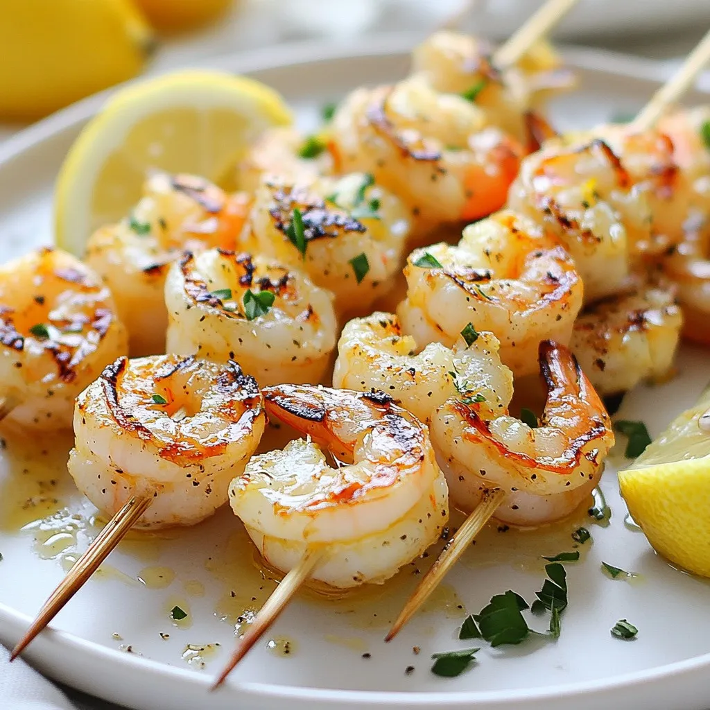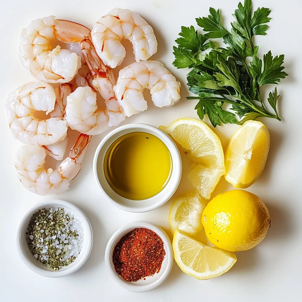 For this dish, you need simple and fresh items. Here’s what to gather: - 1 pound large shrimp, peeled and deveined - 3 tablespoons olive oil - 2 tablespoons fresh lemon juice - Zest of 1 lemon - 3 cloves garlic, minced - 1 tablespoon fresh parsley, chopped - 1 teaspoon dried oregano - 1 teaspoon paprika - Salt and pepper to taste - Lemon wedges for serving These main ingredients create a bright and zesty flavor. The shrimp is the star, while the herbs and lemon shine through. You can enhance the dish with a few extras: - A pinch of red pepper flakes for heat - Fresh thyme or cilantro for more herb flavor - A splash of white wine for depth These optional ingredients can take the dish to the next level. Feel free to mix and match based on your taste. Using fresh ingredients makes a big difference. Look for shrimp that smells clean and has a firm texture. Fresh lemon gives the best flavor, so avoid bottled juice. Good olive oil also enhances the taste. Remember, quality ingredients lead to a tasty meal. {{ingredient_image_1}} To make the marinade, grab a medium bowl. Add 3 tablespoons of olive oil and 2 tablespoons of fresh lemon juice. Next, zest one lemon and add it to the bowl. Then, mince 3 cloves of garlic and toss them in. Add 1 tablespoon of chopped fresh parsley, 1 teaspoon of dried oregano, and 1 teaspoon of paprika. Season the mix with salt and pepper. Use a whisk to blend everything well. Now, take 1 pound of large shrimp that are peeled and deveined. Add the shrimp to your marinade, making sure each piece is coated. Cover the bowl with plastic wrap. Place the bowl in the fridge for 30 minutes to 1 hour. This will help the shrimp soak up all those great flavors. Preheat your grill to medium-high heat. If using a grill pan, heat it over medium-high, too. After marinating, thread the shrimp onto skewers. If using wooden skewers, soak them in water for 30 minutes. This keeps them from burning. Grill the shrimp for about 3-4 minutes on each side. They should turn opaque and be cooked through. Be careful not to overcook them; they can get rubbery. When the shrimp are done, take them off the grill. Let them rest for a few minutes. Serve the shrimp hot, with lemon wedges on the side. The lemon adds a fresh burst of flavor that pairs perfectly with the shrimp. Enjoy this dish with your favorite sides! To keep shrimp tender, avoid overcooking them. Cook shrimp for only 3-4 minutes on each side. Remove them from the grill once they turn opaque. Shrimp should feel firm but not hard. Marinating the shrimp also helps keep them juicy. Use a mix of olive oil and lemon juice for best results. When skewering shrimp, use flat skewers if possible. This stops the shrimp from spinning. If you use wooden skewers, soak them in water for 30 minutes. This prevents burning on the grill. Thread the shrimp close together but not too tight. This allows even cooking and easy flipping. Always preheat your grill to medium-high heat. This helps the shrimp cook evenly. Keep an eye on the grill as shrimp cook quickly. Use tongs to flip the shrimp gently. Avoid pressing them down, as this can make them dry. Lastly, let the shrimp rest for a few minutes before serving. This helps lock in the juices. Pro Tips Marinate for Maximum Flavor: Allowing the shrimp to marinate for at least 30 minutes enhances the flavor significantly, but you can marinate for up to 1 hour for even better results. Use Fresh Herbs: Fresh herbs like parsley make a huge difference in flavor compared to dried. If possible, opt for fresh herbs for a brighter taste. Don't Overcook: Shrimp cook quickly and can become rubbery if overcooked. Remove them from the grill as soon as they turn opaque for the best texture. Skewer Tips: If using wooden skewers, soak them in water for at least 30 minutes to prevent burning on the grill. Metal skewers are a great alternative! {{image_2}} To add a kick, mix in some heat. Use 1-2 teaspoons of cayenne pepper or red pepper flakes. Combine these spices into the marinade. This change gives the shrimp a bold flavor. The heat balances well with the lemon. You can serve this spicy version with cooling sides like yogurt sauce or a fresh salad. For a Mediterranean twist, add new herbs. Use fresh basil and dill alongside parsley. These herbs enhance the dish's freshness. You can also swap in lemon thyme for a zesty touch. This variation pairs nicely with tabbouleh or couscous. The mix of herbs brings a bright taste to every bite. You can cook shrimp in the oven or broiler. If using an oven, preheat to 400°F. Arrange the shrimp on a baking sheet. Bake for 8-10 minutes until cooked through. For the broiler, place shrimp on a broiler pan. Broil for 2-3 minutes on each side. Both methods keep the shrimp juicy and full of flavor. To store leftover grilled shrimp, place them in an airtight container. Make sure to cool them first. Store the container in the fridge. Use the shrimp within two days for the best taste. If they smell off, toss them out. If you want to freeze the shrimp, make sure they are fully cooled. Place the shrimp in a freezer-safe bag. Remove as much air as possible before sealing. Label the bag with the date. You can freeze them for up to three months. When ready, thaw them in the fridge overnight. To reheat grilled shrimp, avoid the microwave if you can. Instead, use a skillet over low heat. Add a bit of olive oil or butter. Heat until warm but not hot, about 2-3 minutes. This keeps the shrimp tender and juicy. Enjoy your leftovers with fresh lemon juice! You should marinate the shrimp for 30 minutes to 1 hour. This time lets the shrimp soak up all the tasty flavors. If you marinate too long, the shrimp can become mushy. Yes, you can use frozen shrimp. Just make sure to thaw them first. Place the shrimp in cold water for about 15 to 20 minutes. Once thawed, you can follow the recipe as normal. Some great side dishes include: - Rice pilaf - Grilled vegetables - A fresh garden salad - Garlic bread These side