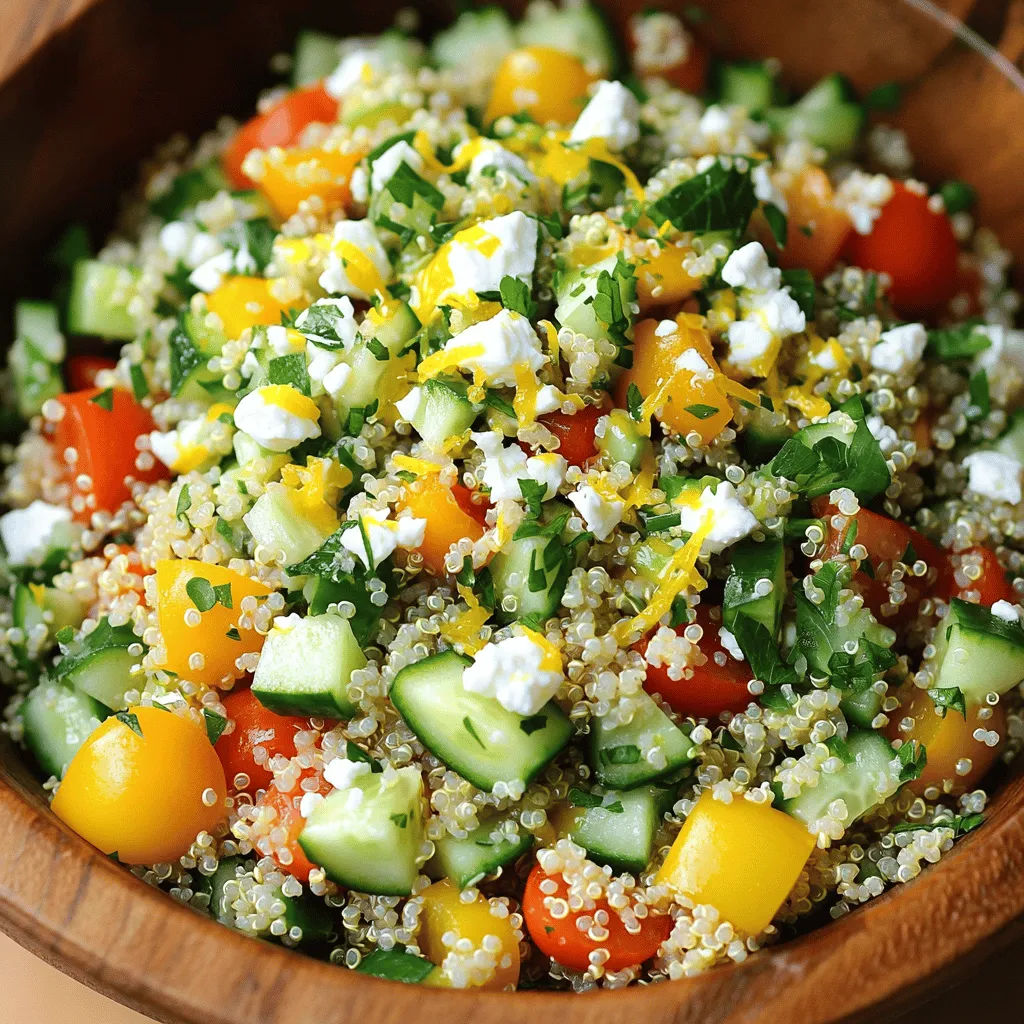 To make this Lemon Herb Quinoa Salad, start with quinoa. Quinoa brings a nutty taste and a nice texture. It cooks well in vegetable broth or water. This adds a layer of flavor to the dish. Next, pick fresh vegetables and herbs. I love using cucumber, bell pepper, cherry tomatoes, red onion, parsley, and mint. They add color and crunch. You can also add feta cheese for a creamy touch, but it’s optional.