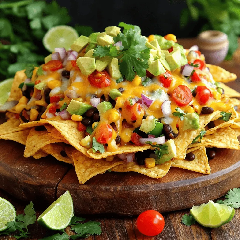 ![- 1 bag (12 oz) tortilla chips - 1 cup black beans, rinsed and drained - 1 cup corn kernels (fresh or frozen) - 1 medium bell pepper, diced (any color) - 1 medium red onion, finely chopped - 1 jalapeño, sliced (seeds removed for less heat) - 1 ripe avocado, diced - 1 cup cherry tomatoes, halved - 1 cup shredded cheese (cheddar or a vegan alternative) - 1 tablespoon olive oil - 1 teaspoon chili powder - 1 teaspoon cumin - Salt and pepper to taste - Fresh cilantro, for garnish - Lime wedges, for serving Gathering fresh ingredients makes a big difference. Tortilla chips form the crunchy base. Black beans add protein and fiber. Sweet corn brings a pop of color and crunch. Diced bell pepper and red onion add flavor and texture. Slice jalapeños for some heat. Diced avocado gives a creamy touch. Halved cherry tomatoes offer freshness. Shredded cheese melts beautifully over the nachos. Olive oil helps sauté the veggies. Chili powder and cumin bring warmth. Lastly, season with salt and pepper for balance. Fresh cilantro and lime wedges are essential for that final zing. For the full recipe, check out the details above. - Preheat the oven: Set your oven to 400°F (200°C). This helps the nachos bake evenly. - Prepare the veggies: In a large skillet, heat one tablespoon of olive oil over medium heat. Add the finely chopped red onion and diced bell pepper. Sauté them for about 3-4 minutes. They should start to soften. Next, add the corn, rinsed black beans, sliced jalapeño, chili powder, cumin, salt, and pepper. Cook this mix for another 2-3 minutes, stirring now and then. This warms everything through and blends the flavors well. - Assemble the nachos: Grab a large baking sheet. Spread the tortilla chips in a single layer. Evenly spoon the sautéed veggie mix over the chips. Finish by sprinkling shredded cheese on top. - Place nachos in the oven: Carefully slide the baking sheet into your preheated oven. - Determine baking time: Let the nachos bake for 10-12 minutes. Keep an eye on them until the cheese melts and bubbles. - Add fresh toppings: Once baked, take the nachos out of the oven. Top them with diced avocado, halved cherry tomatoes, and fresh cilantro. - Serve with lime wedges: Place lime wedges on the side. A squeeze of lime adds a bright flavor to your nachos. Enjoy this loaded veggie nachos recipe! For the full recipe, refer to the above details. To enhance the flavors of your Loaded Veggie Nachos, focus on fresh ingredients. Fresh veggies add brightness. Use ripe avocados and sweet cherry tomatoes for the best taste. Sautéing veggies is key to good nachos. Start with olive oil in a hot pan. Add onions first, and wait until they soften. Then, add bell peppers and corn. This method brings out their natural sweetness. Remember, don’t overcrowd the pan. Give each piece room to cook. Garnishing your nachos makes them look great. Use fresh cilantro for a pop of green. Squeeze lime juice over the top for a fresh taste. You can also add a dollop of sour cream or a drizzle of salsa for color and flavor. When serving, stack the nachos high on a large platter. This makes them fun and inviting. You can also place lime wedges around the nachos for easy access. If you want vegan cheese, look for brands that melt well. Nutritional yeast is a good option for a cheesy flavor without dairy. For toppings, consider your diet. You can swap black beans for chickpeas. Add spinach or kale for more greens. If you want heat, try pickled jalapeños instead of fresh. Explore the [Full Recipe] to get cooking! {{image_2}} You can change up the veggies in loaded veggie nachos to fit the season. In summer, try fresh zucchini or squash. In fall, use roasted sweet potatoes for a sweet taste. Leafy greens, like spinach or kale, add flavor and nutrition. Just toss them in with other veggies before baking. They will wilt nicely and blend in well. Spices and herbs can really change nachos. Try adding smoked paprika or garlic powder for depth. Fresh herbs like cilantro or chives add brightness. For cheese, mix different types. A pepper jack offers heat, while a sharp cheddar gives bite. Vegan cheese can also melt beautifully, making it a great choice. You don't always need tortilla chips. Try baked veggie chips or even pita chips for a twist. Want to go even healthier? Use baked sweet potato slices or cauliflower chips. You can layer nachos on rice or quinoa for a filling meal. Get creative with the base to suit your tastes. For the complete recipe, check out the Full Recipe. To keep your leftover nachos fresh, use airtight containers. Glass or plastic containers work well. You can also wrap them tightly in aluminum foil. Store them in the fridge for up to three days. After that, the chips may get too soggy. To reheat nachos and keep them crunchy, use the oven. Preheat the oven to 350°F (175°C). Spread the nachos on a baking sheet. Heat them for about 10 minutes. This method helps maintain that crispy texture. For toppings, add fresh ingredients like diced avocado or tomatoes after reheating. This keeps them vibrant and tasty. You can freeze nachos before cooking. Just layer the chips and toppings in a freezer-safe bag. Remove all the air to prevent freezer burn. For baked nachos, cool them first. Then, wrap them tightly in plastic wrap and foil. You can store baked nachos for up to two months. To enjoy, just reheat them in the oven. For the full recipe, check out the guide above. Yes, you can prep Loaded Veggie Nachos ahead. Here are some tips for meal prep: - Prep the Veggies: Chop the bell pepper, onion, and other veggies. Store them in airtight containers. - Cook the Mixture: You can sauté the veggie mix in advance. Just reheat it before assembling. - Keep Chips Separate: Store tortilla chips in a sealed bag to keep them crispy. - Layer Right Before Serving: Assemble nachos just before baking for the best crunch. Nachos taste great with various dips. Here are some suggestions: - Guacamole: Creamy and fresh, i
