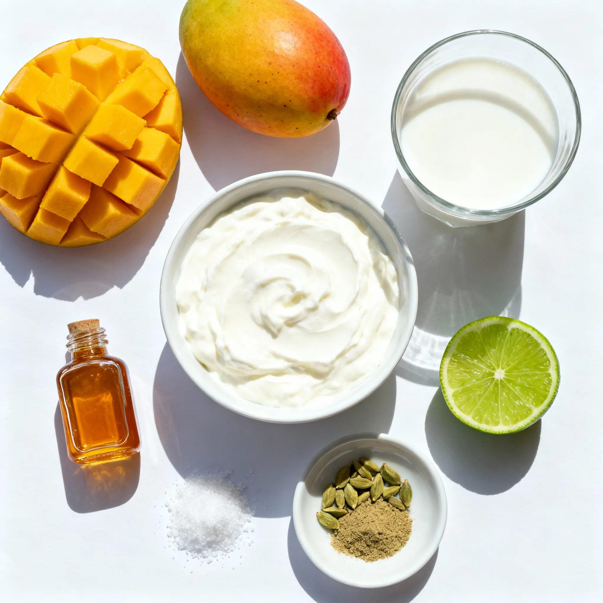 - In a blender, combine the diced mangoes, yogurt, milk, honey (or maple syrup), ground cardamom, lime juice, and salt.