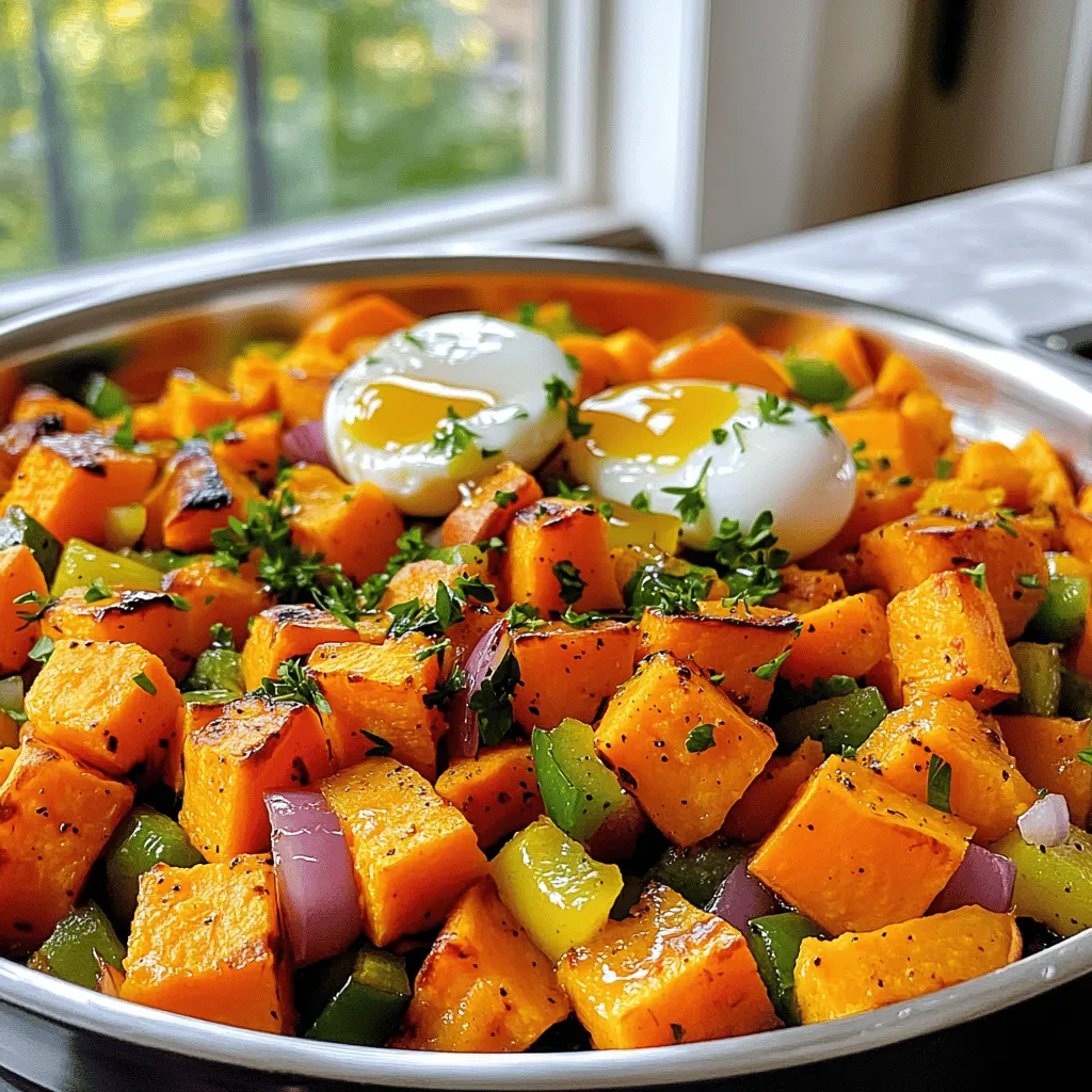 To make this dish vegan, skip the eggs. You can add more veggies for flavor and texture. Try using chickpeas or mushrooms as a protein boost. They both work well with sweet potatoes.