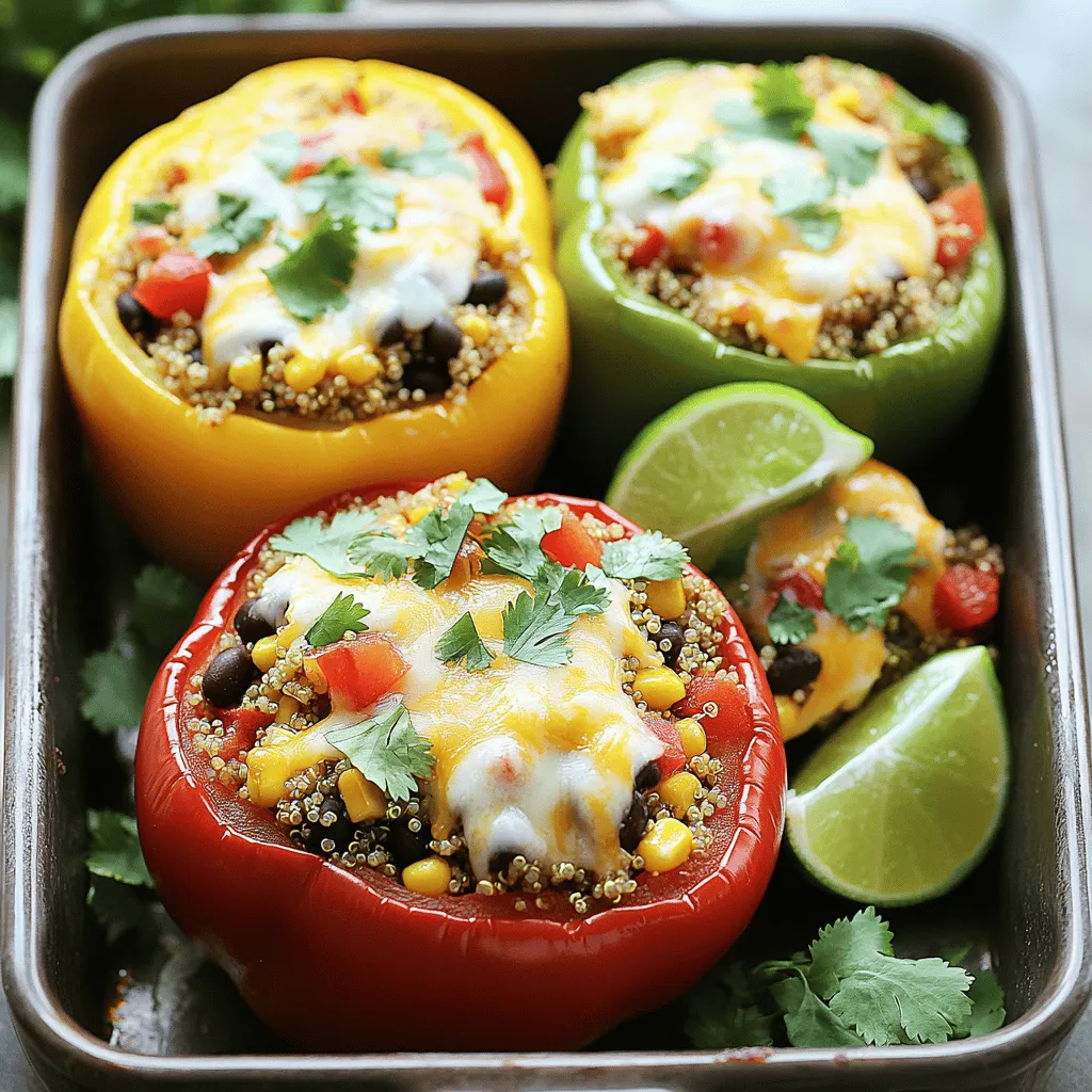 . - Preheat the oven to 375°F (190°C). - Cut the tops off the bell peppers and remove the seeds. Place them upright in a baking dish. - In a medium saucepan, combine 1 cup of rinsed quinoa with 2 cups of vegetable broth. - Bring the mixture to a boil. Then, reduce heat to simmer, cover, and cook for about 15 minutes. You want the quinoa fluffy and all the liquid absorbed. - In a large bowl, combine the cooked quinoa, 1 can of black beans, 1 cup of corn, and 1 cup of diced tomatoes. - Add 1 teaspoon each of cumin and chili powder, and ½ teaspoon of smoked paprika. Season with salt and pepper to taste. Mix it all together well. - Spoon the quinoa mixture into each bell pepper. Fill them tightly and mound slightly at the top. - Add 1 cup of shredded cheese on top of the stuffed peppers. - Cover the baking dish with foil and bake for 25 minutes. - Remove the foil and bake for another 10-15 minutes until the peppers are tender and the cheese is bubbly. For the full recipe, check the instructions above! - Choosing the right bell peppers: Select large, firm peppers. Red, yellow, and green all work well. Their sweetness adds flavor. Look for peppers without blemishes. Fresh peppers hold up better during cooking. - Ensuring quinoa is properly cooked: Rinse the quinoa to remove bitterness. Use twice as much broth as quinoa. Simmer until it is fluffy. This usually takes about 15 minutes. Let it sit covered for a few minutes after cooking. - Adding other vegetables: Feel free to throw in diced zucchini, mushrooms, or spinach. These add color and nutrients. You can also mix in cooked carrots or chopped kale. This makes the dish even heartier. - Spice level adjustments: If you like heat, add diced jalapeños. For milder flavors, skip the chili powder. You can also use a pinch of cayenne pepper for warmth. Taste as you go to find your perfect heat. - Garnishing techniques: Top your stuffed peppers with fresh cilantro. This brightens the dish and adds a fresh taste. You can also sprinkle extra cheese on top. A squeeze of lime adds a zesty finish. - Serving suggestions: Serve the peppers on a colorful plate. Adding a side salad makes it a complete meal. You can also offer sour cream or avocado on the side for extra creaminess. For the full recipe, check out the Full Recipe section above! {{image_2}} You can easily boost the protein in your Mexican quinoa stuffed peppers. Try adding ground turkey or chicken. Cook the meat before mixing it with the quinoa and beans. This adds a savory flavor and makes the dish heartier. For a vegetarian version, consider incorporating tofu. Crumble firm tofu and sauté it with spices. This option keeps the meal filling and tasty while staying meat-free. Mixing up the spices can create exciting flavor variations. For a southwest-style dish, add smoked chipotle or cayenne pepper for heat. You can also try a Mediterranean twist. Use feta cheese and olives in the filling. This gives a fresh, tangy taste that pairs well with the peppers. If you prefer a vegan option, there are simple swaps. Choose dairy-free cheese alternatives to keep it cheesy without animal products. Nutritional yeast is a great choice for a cheesy flavor. You can also add more plant-based ingredients. Think of black olives, zucchini, or spinach to enhance nutrients and flavor. These adjustments make the dish suitable for everyone. For the full recipe, check out the details above. To keep your Mexican quinoa stuffed peppers fresh, refrigerate them right away. Place them in an airtight container. This helps keep the moisture in and prevents them from drying out. You can stack them if needed, but make sure they’re covered well. Use leftovers within three to four days for the best taste. When you want to enjoy your leftovers, you can use the microwave or the oven. The microwave is quick but may make the peppers a bit soggy. Heat them at medium power for about 2-3 minutes. The oven gives better results. Preheat it to 350°F (175°C) and bake for 10-15 minutes. This keeps the peppers firm and the cheese nice and melted. Cover them with foil to keep moisture in. Freezing stuffed peppers is a smart way to save a meal for later. First, let them cool completely. Wrap each pepper tightly in plastic wrap. Then, place them in a freezer-safe bag. They can last up to three months in the freezer. When you’re ready to eat, thaw them in the fridge overnight. Reheat as you would with fresh peppers. Enjoy the flavor without the fuss! For the full recipe, check the earlier section. Making Mexican Quinoa Stuffed Peppers takes about 1 hour. You need 20 minutes to prep and 40 minutes to cook. This includes baking time. Yes, you can make this recipe ahead. Prepare the stuffed peppers, then cover and store them in the fridge. They stay fresh for up to 2 days. When ready, bake them until hot. Yes, these stuffed peppers are gluten-free. All the ingredients, like quinoa and black beans, do not contain gluten. Always check labels for any hidden gluten. You can use rice or farro instead of quinoa. Both give a nice texture. For a lighter option, try cauliflower rice. Just cook it until tender before mixing with the other ingredients. This blog post covered how to make delicious Mexican Quinoa Stuffed Peppers. You learned about key ingredients like bell peppers, quinoa, and spices. We explored step-by-step instructions for prepping, cooking, and baking. Plus, we shared tips for customizing and presenting your dish. You now have storage info to keep your peppers fresh and a FAQ section for any lingering questions. These stuffed peppers are tasty, healthy, and easy to make. Enjoy creating your own unique twist on this crowd-pleasing recipe!](https://dailydishly.com/wp-content/uploads/2025/07/158fa0a1-d758-421b-8667-18571c0cd20a.webp)