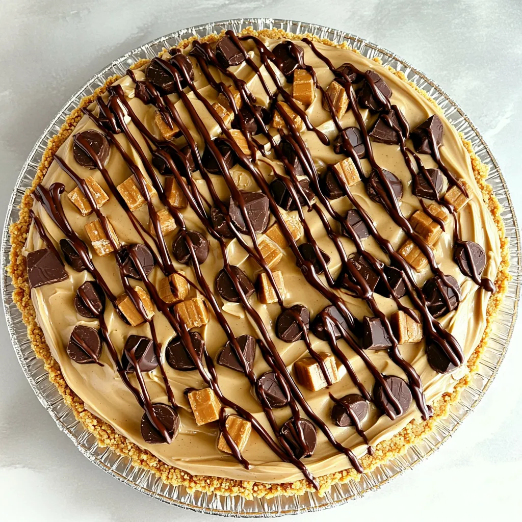 For a stunning presentation, smooth the top of the pie with a spatula. Drizzle chocolate sauce over the top for a nice finish. You can also sprinkle extra chopped peanut butter cups for a fun look.