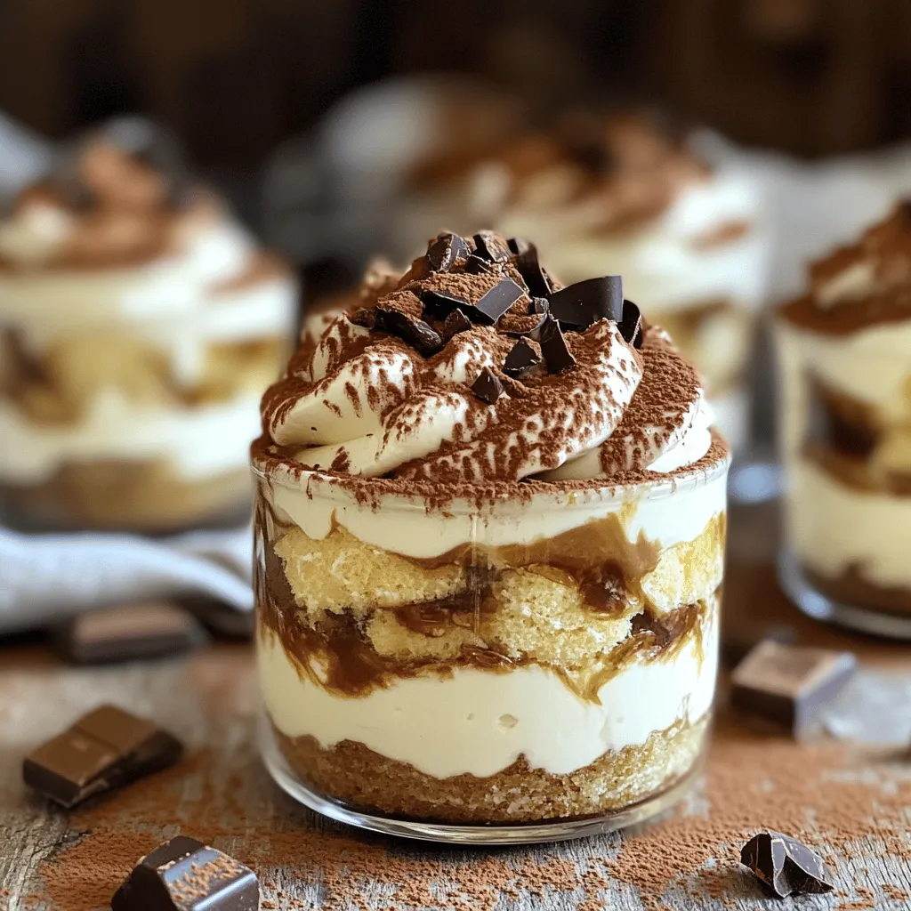- 1 cup strong brewed coffee, cooled - 2 tablespoons cocoa powder - 8 ounces mascarpone cheese, softened - 1 cup heavy whipping cream - ½ cup powdered sugar - 1 teaspoon vanilla extract - 12 ladyfinger cookies - Dark chocolate shavings for garnish Strong brewed coffee gives the tiramisu its rich flavor. You want it strong but cool. Mascarpone cheese adds creaminess and a distinct taste. It makes the dessert special. Ladyfinger cookies are light and soak up the coffee well. They create a nice texture. Cocoa powder adds a bitter balance to the sweetness. It is key for that classic taste. Heavy whipping cream is essential for the fluffiness of the dessert. It makes everything light. If you don't have mascarpone, you can mix cream cheese with heavy cream. This works well. For a coffee-free option, use milk mixed with vanilla extract instead. It will still taste good. If you're out of ladyfingers, sponge cake or even graham crackers can work as a substitute. Cocoa powder can be swapped with chocolate syrup for a sweeter twist. Just adjust the sugar. Making no-bake tiramisu cups is simple and fun. You need just a few steps. We will layer coffee-soaked ladyfingers with a creamy mascarpone mix. This dessert looks fancy but takes only 20 minutes to prep. Let’s dive into the steps. 1. Start by brewing 1 cup of strong coffee. Let it cool completely. 2. In a shallow dish, mix the cooled coffee with 1 tablespoon of cocoa powder. Set this aside. 3. In a large bowl, whip 1 cup of heavy cream. Add ½ cup of powdered sugar and 1 teaspoon of vanilla extract. Beat until you see stiff peaks. 4. Gently fold in 8 ounces of softened mascarpone cheese. Be careful not to deflate the whipped cream. 5. Take 12 ladyfinger cookies. Dip each one quickly into the coffee mix. Soak them just enough, but don’t let them get soggy. 6. In serving cups or jars, place a layer of soaked ladyfingers at the bottom. 7. Add a big layer of the mascarpone mixture over the ladyfingers. 8. Repeat the layers, finishing with a layer of the mascarpone mix on top. 9. Sift the remaining cocoa powder over the top layer for a nice touch. 10. Chill the tiramisu cups in the fridge for at least 2 hours. This helps the flavors blend well. 11. Before serving, sprinkle dark chocolate shavings on top for a special finish. Use clear cups or jars to show off the layers. This makes the dessert look more appealing. When layering, keep the ladyfingers neat. Avoid over-soaking them to maintain texture. Sifting cocoa powder on top adds elegance. You can also use a piping bag for the mascarpone mix to create a fancy look. Enjoy making these delightful dessert cups! To make perfect whipped cream, start with cold tools. Chill your mixing bowl and beaters in the fridge. Use heavy cream for the best texture. Whip the cream until you see stiff peaks. This means it holds its shape well. Add powdered sugar and vanilla extract while whipping. This gives it a sweet flavor that pairs well with the tiramisu. To keep ladyfingers from getting soggy, dip them quickly. Just a second in the coffee mix is enough. You want them moist but not mushy. If they soak too long, they will fall apart. Layer them neatly in the cups to create nice layers. Remember, the goal is to have a good texture. You can enhance flavors by adding a pinch of salt to the mascarpone mix. This balances sweetness and brings out the coffee flavor. Try using different cocoa powders for varied taste. Dark cocoa adds richness, while lighter cocoa gives a milder taste. You can also experiment with flavored extracts, like almond or orange. Each choice adds its unique twist to the dessert. {{image_2}} You can have fun with flavors in your no-bake tiramisu cups. Try adding chocolate or fruit. For a chocolate twist, mix some melted chocolate into the mascarpone. You can also add cocoa powder to the ladyfinger soak for a richer taste. If you love fruit, consider using fresh berries. Layer in some mashed strawberries or raspberries between the mascarpone. This adds a fresh and tangy note to the dessert. You can make this dessert gluten-free with a few simple swaps. Use gluten-free ladyfingers or sponge cake. Many stores sell these options now. Just check the labels to ensure they fit your needs. You can also make your own ladyfingers using gluten-free flour. This way, everyone can enjoy this tasty treat without worry. For a vegan version, swap out the dairy ingredients. Use coconut cream instead of mascarpone cheese. Chill a can of coconut milk overnight, then scoop out the solid cream. For the whipped topping, try using a plant-based whipping cream. You can also replace ladyfingers with vegan cookies or sponge cake. With these changes, you can enjoy a delicious vegan tiramisu cup that everyone will love. To keep your no-bake tiramisu cups fresh, store them in the fridge. Use an airtight container or cover each cup with plastic wrap. This helps prevent drying and keeps the flavors intact. Make sure to chill them right after you finish making them. This dessert needs time to set and taste better cold. These tiramisu cups last about 2 to 3 days in the fridge. After that, the ladyfingers may become too soft. They will still taste good, but the texture will change. To enjoy them at their best, eat them within this time frame. You can freeze tiramisu cups if you need to save them for later. Wrap each cup tightly with plastic wrap or foil. Place them in a freezer-safe bag or container. They can last up to a month in the freezer. When you're ready to eat them, move the cups to the fridge overnight to thaw. Avoid refreezing once they have thawed, as this can ruin the texture. Yes, you can make No-Bake Tiramisu Cups ahead of time. This dessert tastes even better after resting. I suggest making them a day before. Just cover them with plastic wrap and chill. They will soak up all the flavors. The longer they sit, the better they taste! If you don’t have mascarpone cheese, there are good swaps. You can use cream chees