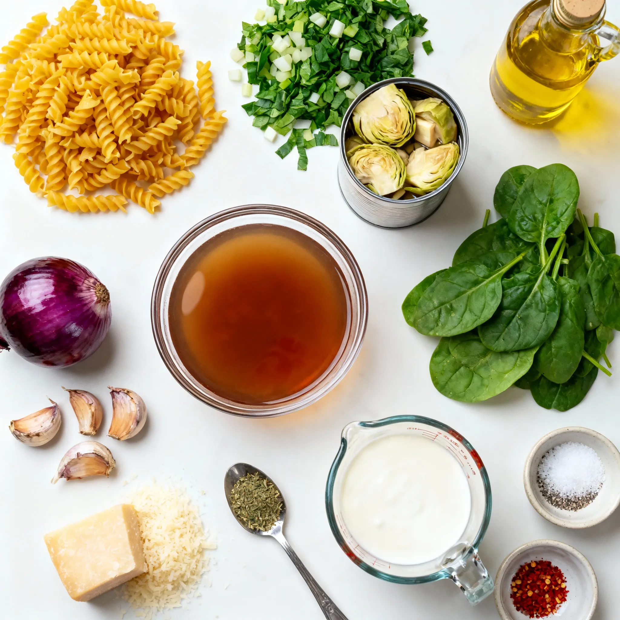 To make the one-pot spinach artichoke pasta, gather these ingredients first. The pasta serves as the base, while the artichokes and spinach add great flavor. The heavy cream and Parmesan cheese create a rich, creamy sauce. Garlic and onions add depth and warmth to the dish.