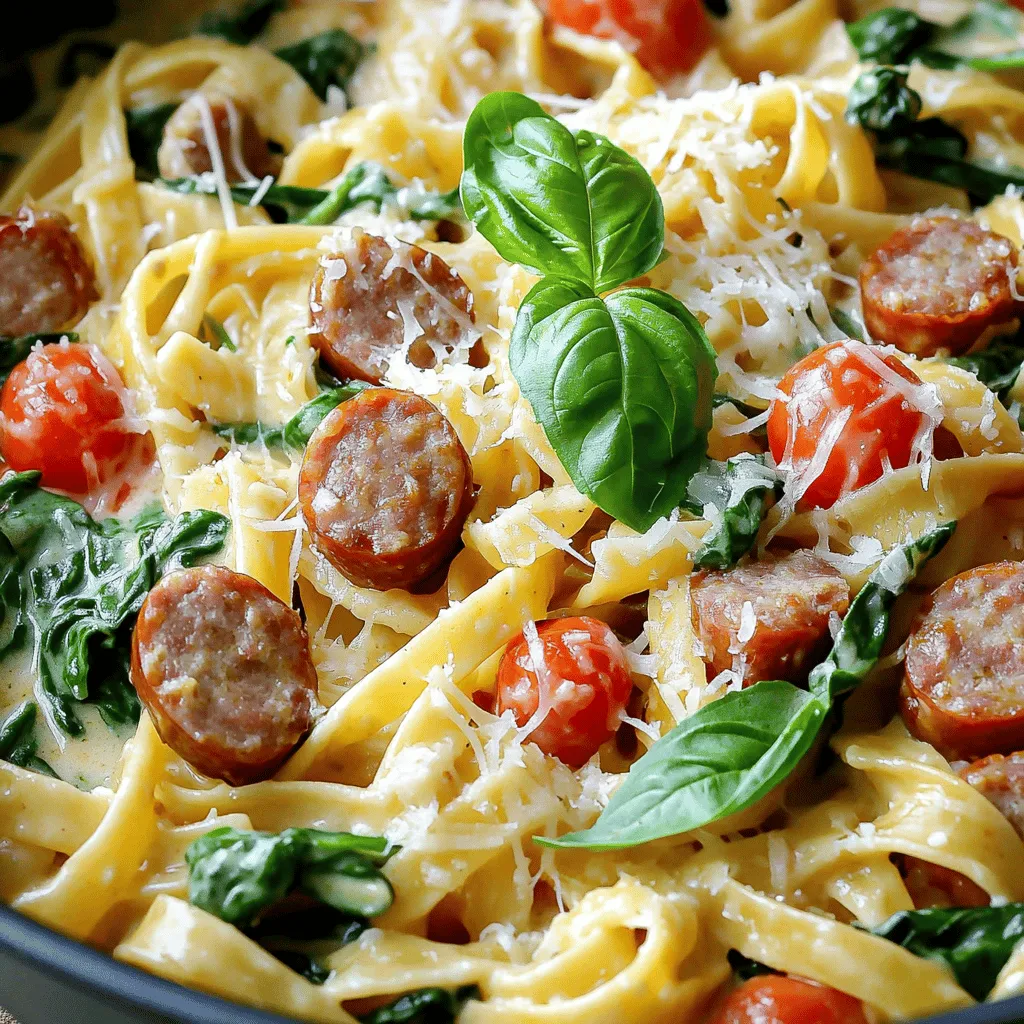 These ingredients combine to create a hearty meal. The fettuccine pasta cooks in the broth, soaking up all the flavors. The Italian sausage adds a savory kick. The cream makes it rich and smooth. Finally, spinach and basil bring freshness to each bite.