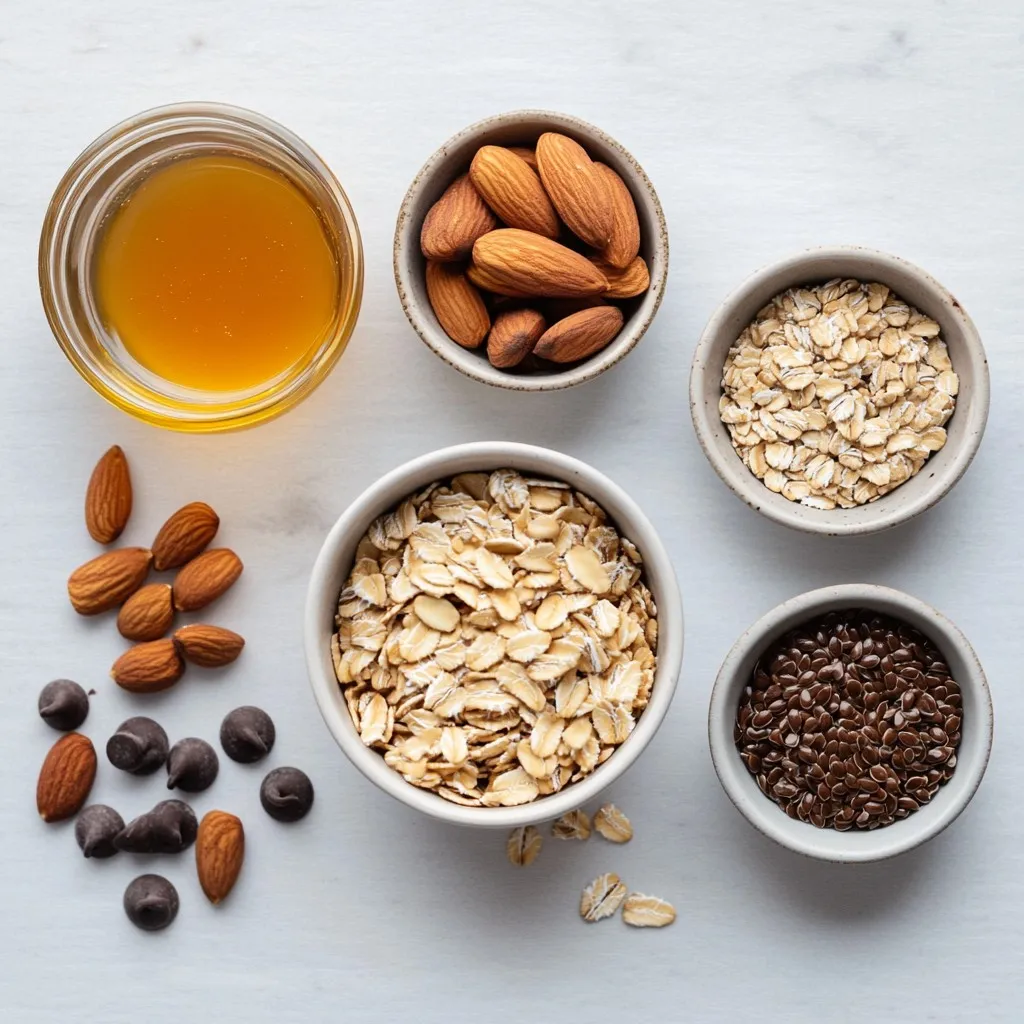 First, gather your ingredients. You will need rolled oats, natural peanut butter, honey or maple syrup, dark chocolate chips, chopped nuts, ground flaxseed, vanilla extract, and a pinch of salt. Make sure to have a bowl and a pan ready.
