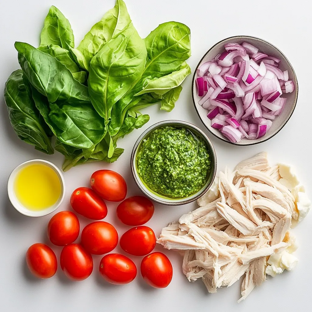This list of ingredients makes a fresh and tasty meal. As you prepare, remember that each ingredient plays a role. The chicken provides protein, while the pesto adds flavor. This mix creates a delightful balance.