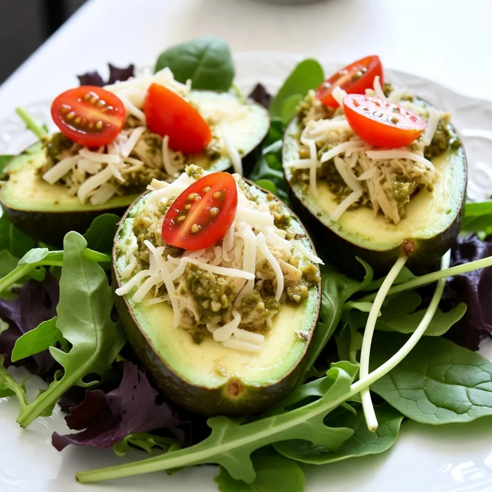 Presentation matters! Serve your stuffed avocados on a bed of mixed greens. This adds color and crunch. You can also drizzle extra pesto over the top. It enhances the look and flavor. A sprinkle of fresh basil leaves adds a nice touch.