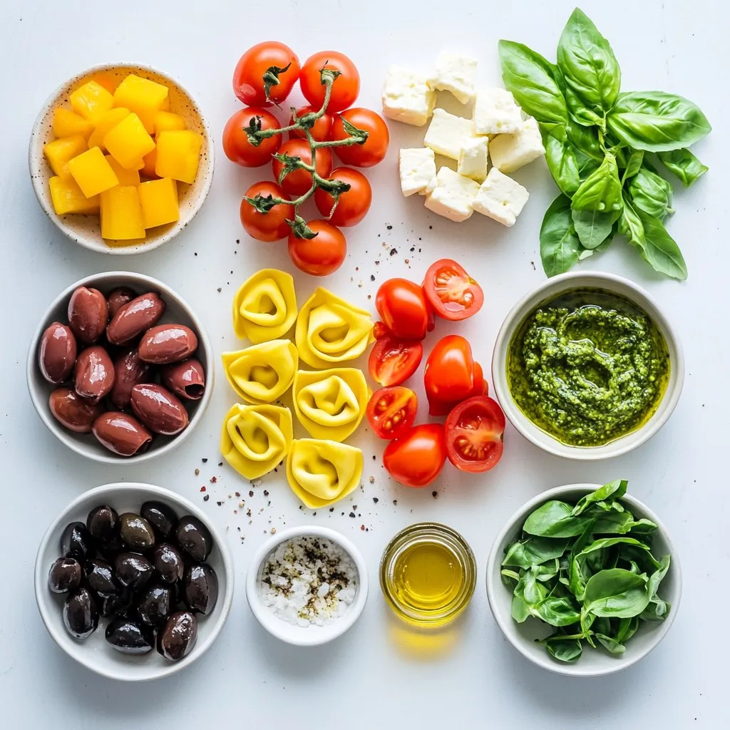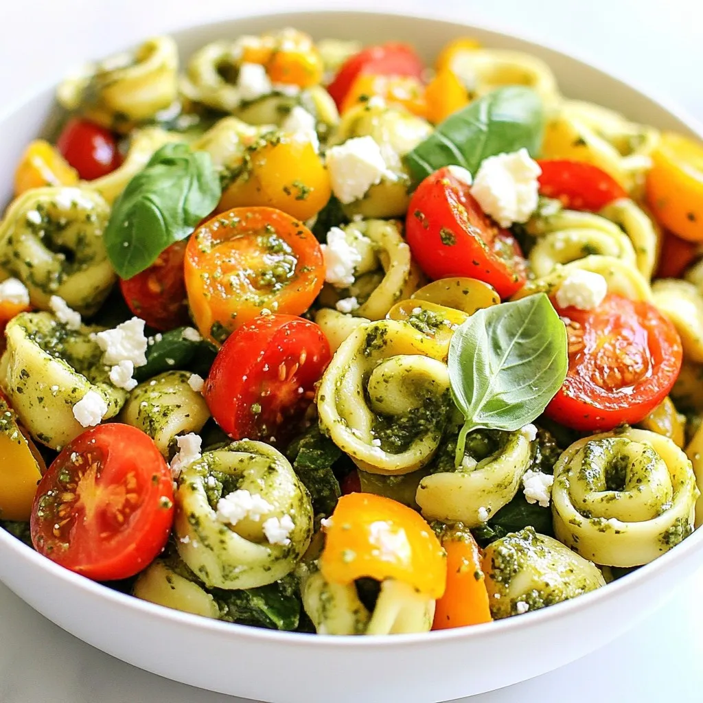 - 12 oz cheese tortellini - 1 cup cherry tomatoes, halved - 1 cup bell peppers, diced (red, yellow, or green) - 1 cup fresh spinach, roughly chopped - ½ cup black olives, sliced - ½ cup feta cheese, crumbled - ½ cup pesto sauce (store-bought or homemade) - 2 tablespoons olive oil - Salt and pepper to taste - Fresh basil leaves for garnish When making pesto tortellini pasta salad, it's crucial to choose the best ingredients. I love cheese tortellini for its creamy texture. It serves as a great base. Cherry tomatoes bring a burst of freshness. I often use red, yellow, or green bell peppers for added crunch and color. Fresh spinach adds vitamins and a nice green touch. Black olives lend a salty bite while feta cheese adds creaminess and tang. I prefer using homemade pesto, but store-bought works well too. A drizzle of olive oil enhances the flavor and helps the salad stay moist. Season it with salt and pepper to taste, and don’t forget fresh basil for garnish. It adds a lovely aroma and makes the dish pop visually. This ingredient mix creates a fresh and flavorful dish. Each bite is packed with taste, making it perfect for any gathering. {{ingredient_image_1}} Start by bringing a large pot of salted water to a boil. This step is key as it flavors the tortellini while cooking. Once the water is bubbling, add the cheese tortellini. Cook it according to the package instructions until al dente. This usually takes about 3 to 5 minutes. When it’s done, drain the tortellini and rinse it under cold water. This will stop the cooking process and help it cool down. Next, wash your vegetables well. For the cherry tomatoes, cut them in half. Dice your bell peppers into small pieces. Roughly chop the fresh spinach. Slice the black olives. In a large mixing bowl, combine the halved cherry tomatoes, diced bell peppers, chopped spinach, sliced olives, and crumbled feta cheese. This mix adds color and crunch to your salad. Now it’s time to put everything together. Add the cooled tortellini to the bowl with the vegetables. Pour the pesto sauce and olive oil over the tortellini and veggies. Season with salt and pepper to taste. Gently toss everything together. Make sure the tortellini and veggies are evenly coated with the pesto. Cover the bowl and refrigerate for at least 30 minutes. This chilling time helps all the flavors meld together beautifully. Before serving, give it a quick toss again and garnish with fresh basil leaves. Enjoy your fresh and flavorful pesto tortellini pasta salad! You can make this dish your own with different veggies. Try adding - Zucchini, diced - Carrots, shredded - Peas, fresh or frozen For cheese, you have great choices. Mix in - Mozzarella balls - Parmesan shavings - Goat cheese for a tangy twist To coat the tortellini well, add the pesto slowly. Mix gently to cover each piece. A good tip is to use warm tortellini. This helps the pesto stick better. When serving, warm or cold is great. If you want it warm, serve right after mixing. For a cold dish, chill it for at least 30 minutes. This lets the flavors blend. Herbs and spices can boost taste. Add - A pinch of red pepper flakes for heat - A sprinkle of garlic powder for depth To make it fresher, toss in - Chopped fresh parsley - Squeezed lemon juice for brightness - Extra basil leaves for a fragrant touch Pro Tips Use Fresh Ingredients: Whenever possible, opt for fresh vegetables and herbs to enhance the flavor and nutritional value of your pasta salad. Make Your Own Pesto: For a richer taste, consider making your own pesto with fresh basil, garlic, pine nuts, Parmesan cheese, and olive oil. Chill Before Serving: Allowing the salad to chill for at least 30 minutes helps the flavors blend beautifully, making each bite a burst of taste. Customize to Your Liking: Feel free to add or swap in your favorite vegetables, proteins, or cheeses for a personalized touch to the salad. {{image_2}} You can easily boost the protein in your pesto tortellini pasta salad. Adding grilled chicken or shrimp works great. Just cook them simply on a grill or in a pan. Slice them and mix them into the salad. If you prefer vegetarian options, try adding chickpeas or black beans. Both add protein and a nice texture. If you need a gluten-free salad, swap the cheese tortellini for gluten-free varieties. Many brands offer great gluten-free pasta that cooks well. You can also use gluten-free penne or fusilli. These options taste good and keep the salad fun. Seasonal vegetables can change the salad's flavor. In summer, add fresh zucchini or corn for sweetness. In winter, try roasted butternut squash or Brussels sprouts. These veggies warm up the dish and add hearty flavors. Adjusting your salad for the seasons keeps it fresh and exciting. To store your pesto tortellini pasta salad, place it in an airtight container. This keeps the salad fresh and safe. Refrigerate the container right away. The salad lasts 3 to 5 days in the fridge. Check it for any signs of spoilage before eating. Yes, you can freeze the salad! However, some ingredients may change texture. I recommend freezing only the pasta and pesto mix. Avoid freezing fresh vegetables and cheese. When ready to eat, thaw in the fridge overnight. Reheat gently on the stove or microwave. Add a splash of olive oil for moisture if needed. To keep your salad fresh after storage, keep the dressing separate until serving. This helps prevent sogginess. If the salad starts to look dull, add fresh herbs or a little lemon juice. Toss before serving to revive flavors. Enjoy your vibrant salad even after storing! Yes, you can use homemade pesto for this salad. In fact, I love making my own! Homemade pesto gives you more control over the flavors. You can adjust the garlic, nuts, and cheese to your taste. Store-bought pesto is a great option too, especially when you're short on time. It’s quick and easy. Both options work well in this dish. You can store pesto tortellini pasta salad in the fridge for up to three 