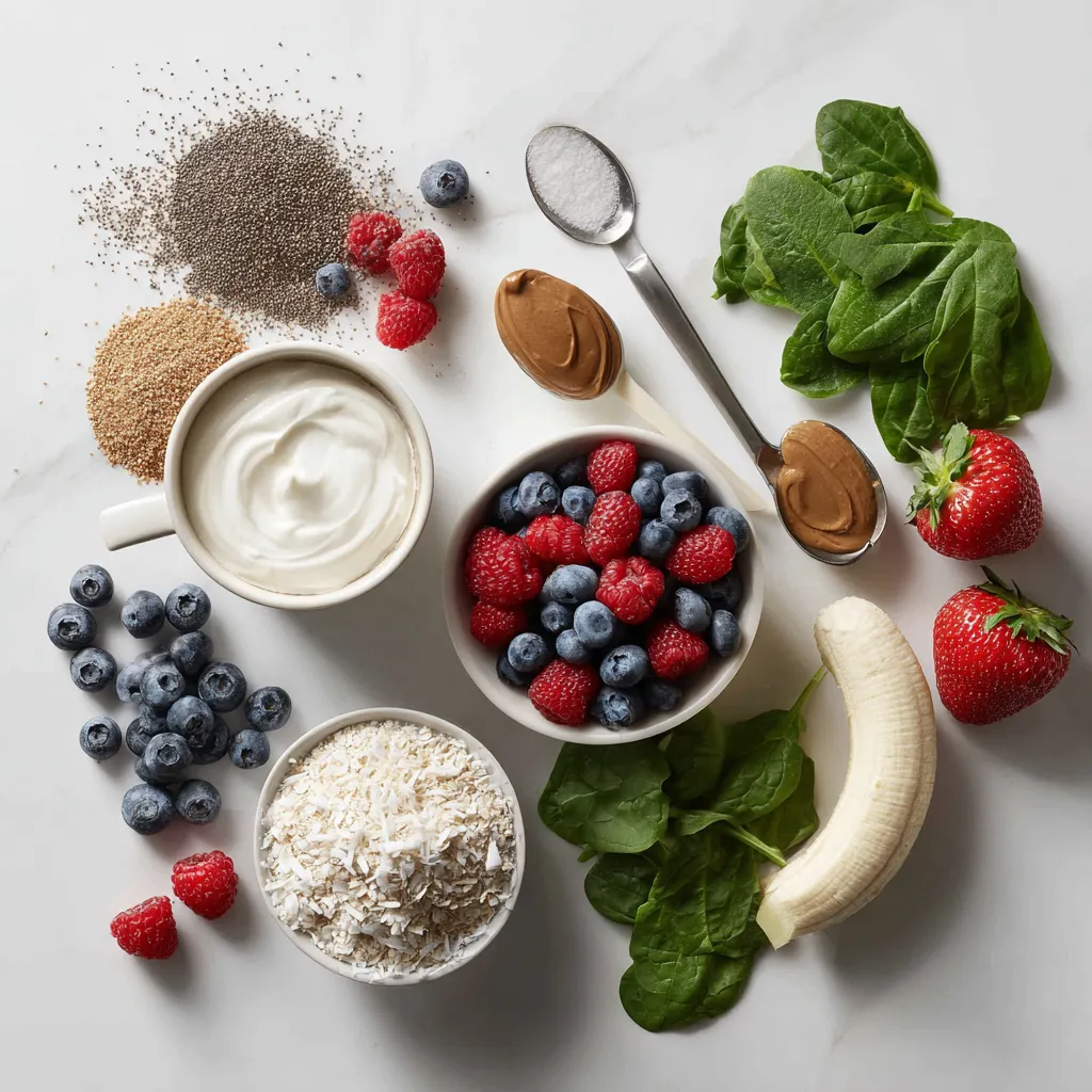 - In a blender, combine the almond milk, banana, Greek yogurt, fresh spinach, frozen mixed berries, protein powder, chia seeds, and almond butter.