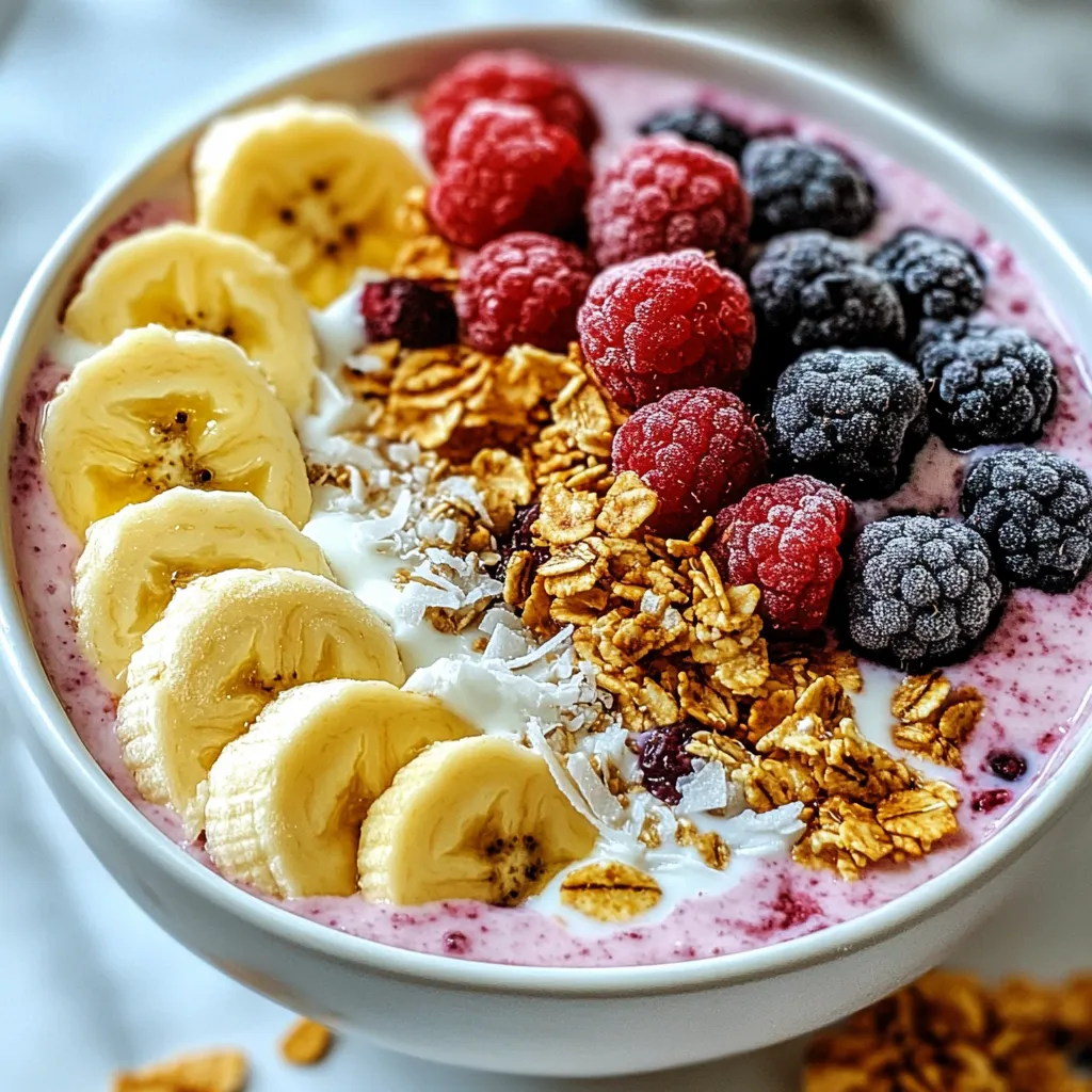 ![- 1 cup frozen mixed berries: strawberries, blueberries, raspberries - 1 ripe banana - 1/2 cup unsweetened almond milk or milk of your choice - 1 tablespoon chia seeds - 1 tablespoon honey or maple syrup (optional) - Toppings: sliced fresh fruits (kiwi, strawberries), granola, shredded coconut, edible flowers To start, you need frozen mixed berries. They give the bowl a sweet, tangy flavor. You can use strawberries, blueberries, and raspberries. Next, add a ripe banana. It makes the smoothie creamy and rich. Choose almond milk or your favorite milk for smooth blending. This choice affects the taste and texture. Chia seeds are a superfood packed with fiber and nutrients. They help thicken the smoothie. You may want to add honey or maple syrup for sweetness. This step is optional; adjust it based on your taste. For the toppings, get fresh fruits like kiwi and strawberries. They add color and extra flavor. Granola gives a nice crunch. Shredded coconut adds a tropical touch, while edible flowers make it look special. This recipe is simple and flexible. You can mix and match based on what you have. Explore the full recipe for more! - Step 1: Blend the ingredients until smooth. Start by adding the frozen mixed berries, banana, almond milk, and chia seeds to your blender. Turn it on high and blend until it is creamy. Make sure there are no lumps. If you need more liquid, add a little extra almond milk. - Step 2: Adjust the consistency with almond milk. If the mixture is too thick, just pour in more almond milk. Keep blending until you reach your desired smoothness. This step is key for a perfect texture. - Step 3: Pour into a bowl and prepare for toppings. Once blended, pour your smoothie into a bowl. Spread it out evenly so you have a nice base for your toppings. - Step 4: Layer the toppings creatively. Now comes the fun part! Arrange your fresh fruits, granola, and coconut on top of the smoothie. You can make it look pretty by placing each item in sections or creating patterns. Let your creativity shine! - Step 5: Optional drizzle for added flavor. If you like it sweeter, drizzle some honey or maple syrup over the top. This adds a nice touch to the flavors and makes it look even more appealing. - Step 6: Tips for presentation. For a great look, use colorful fruits like kiwi or strawberries. Adding edible flowers can make your bowl pop. Remember, we eat with our eyes first! Enjoy your berry bliss smoothie bowl right away for the best taste. For a great berry smoothie bowl, start with the best berries. Frozen mixed berries work best. Look for strawberries, blueberries, and raspberries. These fruits add flavor and color. They also pack vitamins. When picking a ripe banana, look for a yellow peel. Small brown spots show it is sweet and ready. Avoid bananas that are too green or too brown. They won’t blend well in the smoothie. If you want an alternative to nut milk, try oat milk or coconut milk. Both options give a creamy texture. You can also use regular cow's milk if you prefer. Adjusting sweeteners can change your smoothie bowl. Use honey or maple syrup if you like it sweeter. Start with one tablespoon, then taste. Add more if needed. For a creamy consistency, blend the fruits long enough. Stop to scrape down the sides of the blender. If it’s too thick, add a splash of almond milk. You can add flavoring options like vanilla extract or yogurt. A splash of vanilla gives a nice touch. Yogurt adds creaminess and protein. Both choices make your bowl tastier. {{image_2}} You can change up the berry mix for a new flavor. Try using 2 cups of mixed berries. Add strawberries, blueberries, or raspberries for a tasty blend. You can also use tropical fruits like mango or pineapple. These fruits give a sweet twist and bright color. Seasonal fruits are a fun option too. In summer, use fresh peaches or cherries. In fall, try apples or pears. Mixing different fruits keeps your smoothie bowl exciting and fresh. Nut butters add a rich flavor and creaminess. Almond butter or peanut butter works well. You can also choose nut-based toppings like chopped nuts or granola. They give a nice crunch and extra nutrition. Seeds like pumpkin or sunflower seeds provide more vitamins. You can also add oats for fiber. They make your bowl filling and hearty. If you want healthier options, try using yogurt or cottage cheese. They boost protein without extra sugar. You can also add sliced fresh fruits or shredded coconut for a tropical touch. Get creative with your toppings for a bowl that looks as good as it tastes! To store any leftover smoothie bowl, place it in an airtight container. This keeps it fresh and prevents spills. If you have extra toppings, store them separately. This keeps them crisp. For toppings like granola, a sealed bag works well. You can also freeze any unused smoothie blend. Pour it into ice cube trays. Once frozen, transfer the cubes to a bag. This way, you can enjoy it later. If you made your smoothie bowl in advance, serve it chilled. You can also blend it again if it thickens too much. Add a splash of almond milk for a smoother texture. When ready to eat, layer fresh toppings on top. You can also sprinkle a bit of granola for crunch. Adjust sweetness with honey or maple syrup if needed. Enjoy your berry bliss smoothie bowl from the [Full Recipe] whenever you like! - Can I use fresh berries instead of frozen? Yes, you can use fresh berries. Fresh berries make a lighter smoothie. Just add ice to keep it cold. Frozen berries give a thicker texture. Both are good options! - How can I make my berry smoothie bowl healthier? To boost health, add spinach or kale. You can also swap honey for a ripe banana. Reducing sweeteners helps too. Don't forget to add nuts or seeds for healthy fats! - What are some recommended toppings for a smoothie bowl? Great toppings include sliced kiwi, strawberries, or blueberries. Try granola for crunch and shredded coconut for sweetness. Edible flowers add beauty and fun! - Ho