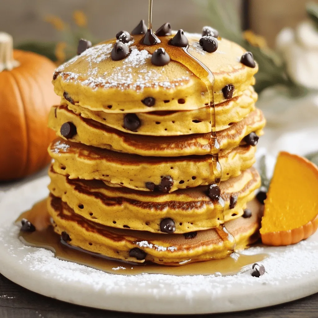 To make a great pumpkin chocolate chip pancake stack, you need: - 1 cup all-purpose flour - 1 tablespoon baking powder - 1/2 teaspoon baking soda - 1/2 teaspoon salt - 1 teaspoon ground cinnamon - 1/2 teaspoon ground nutmeg - 1 cup canned pumpkin puree - 2 large eggs - 1/2 cup milk (or plant-based alternative) - 1/4 cup maple syrup (plus more for serving) - 1 teaspoon vanilla extract - 1/2 cup chocolate chips You also need some basic tools to make these pancakes: - Mixing bowls - Whisk or fork - Non-stick skillet or griddle - Measuring cups and spoons When it comes to serving, consider these extras: - Maple syrup for drizzling - Butter or oil for cooking - Powdered sugar for dusting - Whipped cream for a rich touch - Extra chocolate chips for garnish - Pumpkin slices for decoration These ingredients and tools will set you up for a delicious pancake experience! First, gather your dry ingredients. In a large bowl, combine: - 1 cup all-purpose flour - 1 tablespoon baking powder - 1/2 teaspoon baking soda - 1/2 teaspoon salt - 1 teaspoon ground cinnamon - 1/2 teaspoon ground nutmeg Whisk these together until mixed well. This step is key for even flavor. Now, in a separate bowl, mix your wet ingredients. Add: - 1 cup canned pumpkin puree - 2 large eggs - 1/2 cup milk (or a plant-based alternative) - 1/4 cup maple syrup - 1 teaspoon vanilla extract Stir these until smooth. This mix gives the pancakes their rich flavor. Heat a non-stick skillet over medium heat. Lightly grease it with butter or oil. Pour about 1/4 cup of batter for each pancake onto the skillet. Cook until bubbles form, about 2-3 minutes. Flip the pancake and cook for another 2 minutes until golden brown. Repeat this with the rest of the batter. Adjust the heat as needed to prevent burning. Stack your pancakes high on a plate. Drizzle extra maple syrup over the top. For a fun touch, sprinkle more chocolate chips. Serve warm for the best taste. You can also add whipped cream or a slice of pumpkin for decoration. Enjoy this delightful treat! To make your pancakes fluffy, use fresh baking powder. Mix dry and wet ingredients separately. Combine them gently. Lumps in the batter are okay; they help keep the pancakes fluffy. Let the batter rest for about 5 minutes. This allows the baking powder to work better. Heat your skillet on medium, not too hot. If it's too hot, the pancakes will burn. Use a non-stick pan or griddle. Lightly grease it with butter or oil. Pour about 1/4 cup of batter for each pancake. Cook until bubbles form on top, then flip. Each side should be golden brown. Adjust heat as needed to avoid burning. Stack pancakes high on a large plate. Drizzle with maple syrup for sweetness. Add a sprinkle of chocolate chips for a fun touch. Dust with powdered sugar for a festive look. You can also top them with whipped cream. A slice of pumpkin on the side adds a nice touch. Enjoy your delicious creation! {{image_2}} You can make these pancakes even better by adding nuts or fruits. Chopped walnuts or pecans add a nice crunch. You can also try adding sliced bananas or blueberries. These add flavor and nutrients. Just fold them into the batter before cooking. If you need gluten-free pancakes, swap the all-purpose flour for a gluten-free blend. Look for one that works for baking. For a dairy-free option, use almond milk or oat milk instead of regular milk. These changes keep the flavor and texture great. Want to spice things up? Try adding extra spices like ginger or cloves. A pinch of allspice can also add warmth. You can even use flavored extracts, like almond or orange. These small tweaks can elevate your pancake experience to a new level. To keep your pumpkin chocolate chip pancakes fresh, let them cool first. Stack them with parchment paper between each pancake. Place the stack in an airtight container. Store the container in the fridge if you plan to eat them soon. They stay good for about three days this way. To reheat your pancakes, use a microwave or a skillet. For the microwave, place a pancake on a plate. Heat it for about 30 seconds. If you want it crisp, use a skillet. Heat it on medium for a few minutes until warm. This keeps them nice and soft. You can freeze these pancakes for later. Stack them as before and wrap them tightly in plastic wrap. Then, place them in a freezer bag. They can last up to two months in the freezer. When you want to eat them, take out the pancakes and let them thaw in the fridge overnight. You can reheat them after thawing. Enjoy your delicious pancakes anytime! Yes, you can use fresh pumpkin. First, roast the pumpkin until soft. Then, scoop out the flesh and mash it until smooth. This fresh pumpkin gives a nice flavor. Just use the same amount as canned pumpkin puree. To make them fluffier, you can add an extra egg. You can also use buttermilk instead of regular milk. This makes the batter lighter. Make sure not to overmix the batter. A few lumps are okay. If you don’t have maple syrup, you can use honey or agave syrup. Both add sweetness. You can even try fruit purees, like applesauce, for a different taste. Leftover pancakes can last up to three days in the fridge. Store them in an airtight container. You can also freeze them for up to two months. Reheat in a microwave or toaster. Enjoy your pancakes anytime! Now you know how to make tasty pumpkin chocolate chip pancakes. We covered the key ingredients and steps, plus tips for great texture and storage. Feel free to try different add-ins or swap ingredients to fit your needs. Enjoy your pancakes fresh, reheated, or frozen! Experiment and have fun with this easy recipe. You’ll impress family and friends every time!