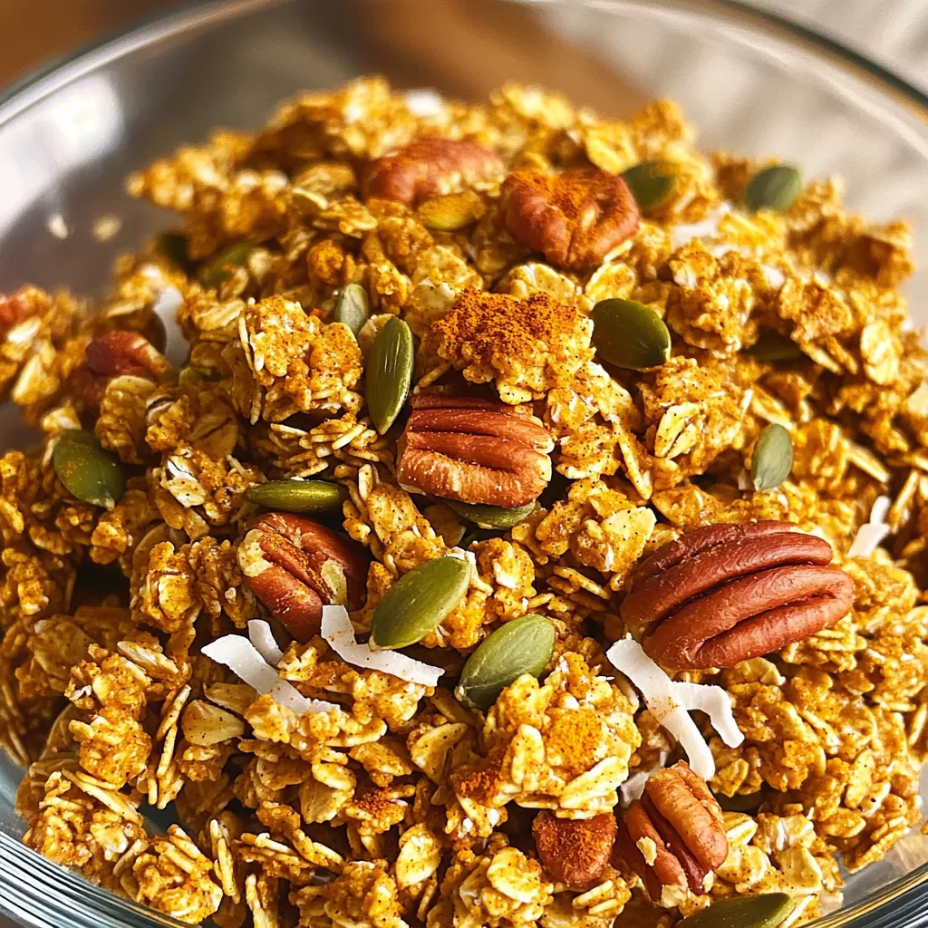 - 2 cups rolled oats - 1 cup pecans, chopped - 1/2 cup pumpkin seeds - 1/2 cup unsweetened shredded coconut The main ingredients in this pumpkin spice granola create a great base. Rolled oats give the granola its chewy texture. Chopped pecans add a nice crunch and rich flavor. Pumpkin seeds bring extra nutrition and a bit of saltiness. Lastly, unsweetened shredded coconut adds sweetness and a tropical twist. - 1/3 cup maple syrup - 1/4 cup coconut oil, melted - 1 cup pumpkin puree - 1 teaspoon vanilla extract The wet ingredients combine to bind everything together. Maple syrup adds a natural sweetness and a rich flavor. Coconut oil helps to crisp up the granola while adding a hint of coconut flavor. Pumpkin puree not only gives this granola its lovely orange color but also boosts the pumpkin flavor. Vanilla extract rounds out the taste with warmth. - 2 teaspoons pumpkin pie spice - 1/2 teaspoon salt - 1/4 cup brown sugar (optional, for added sweetness) Spices and sweeteners elevate the flavor of this granola. Pumpkin pie spice combines cinnamon, nutmeg, and ginger for a cozy taste. A bit of salt balances the sweetness. If you want your granola sweeter, you can add brown sugar. This optional ingredient makes the granola extra delicious. First, preheat your oven to 350°F (175°C). This helps the granola bake evenly. Line a large baking sheet with parchment paper. This makes cleanup easy and prevents sticking. In a big bowl, combine the rolled oats, chopped pecans, pumpkin seeds, and unsweetened shredded coconut. Add the pumpkin pie spice and salt. Mix everything well. This step is key for even flavor. In another bowl, whisk together the maple syrup, melted coconut oil, pumpkin puree, and vanilla extract. Make sure it is smooth. This mixture will add moisture and richness to your granola. Now, pour the wet mixture over the dry ingredients. Stir until all the dry ingredients are coated nicely. If you want sweeter granola, add the brown sugar now and mix until it dissolves. This will enhance the flavor. Spread the granola mixture evenly on the lined baking sheet. Press it down gently to form a compact layer. This helps create those crunchy clusters we all love. Bake in the oven for 25-30 minutes. Stir halfway through to promote even browning. Keep an eye on it, as it can brown quickly. Once the granola is golden and fragrant, take it out of the oven. Let it cool completely on the baking sheet. This step is important; it allows the granola to harden into clusters. After cooling, break it into pieces. Store the granola in an airtight container at room temperature. Enjoy it with yogurt, milk, or as a snack! To get those crunchy clusters, press down the mixture firmly on the baking sheet. This helps the granola stick together. Bake it at 350°F for 25 to 30 minutes. Stir halfway through to ensure even cooking. Watch it closely at the end. It can brown quickly. You can add dried fruits or seeds to make it your own. Consider raisins, cranberries, or sunflower seeds. You can also adjust the sweetness. If you want it sweeter, add more brown sugar. Just mix it in well before baking. Granola tastes great with yogurt or milk. You can layer it in a bowl for a parfait. For a fun presentation, serve it in a clear glass jar. Top with extra pumpkin seeds or a drizzle of maple syrup for added flair. Enjoy! {{image_2}} You can easily make this granola gluten-free. Just use gluten-free oats instead of regular rolled oats. This swap keeps the crunch while ensuring everyone can enjoy it. Gluten-free oats are widely available and just as tasty. They soak up the flavors well, making your granola just as delicious and satisfying. If you want a nut-free granola, swap out the pecans for seeds. Pumpkin seeds are a great choice. They add a nice crunch and keep the flavor rich. Sunflower seeds or even hemp seeds also work well. This change makes the granola safe for those with nut allergies while keeping it hearty. You can get creative with the spices in your granola. Try adding cinnamon or nutmeg for a different twist. You can also add a splash of almond or coconut extract for added flavor. This gives your granola a unique touch. Experimenting with spices can lead to fun new flavors you’ll love! Store your pumpkin spice granola in an airtight container. This keeps it fresh and crunchy. Glass jars work great, but any container that seals well will do. You want to avoid air exposure, which can make your granola stale quickly. When stored correctly, your granola will stay fresh for about two weeks. After that, it may lose some crunch and flavor. If you want to enjoy it longer, consider freezing it, which can extend its life for several months. To freeze your granola, first let it cool completely. Then, transfer it to a freezer-safe bag or container. Remove as much air as possible before sealing it. When you're ready to enjoy it, just take out a portion and let it thaw at room temperature. This keeps your granola tasty and crunchy for later use. Yes, you can use other nuts. Almonds, walnuts, or hazelnuts work well. Each nut adds a unique flavor and crunch. For a nut-free option, try sunflower seeds or pumpkin seeds. Just remember to chop the nuts into smaller pieces for even baking. Pumpkin puree gives the granola its flavor and moisture. You can skip it, but the granola might be less rich. If you want a different taste, try applesauce or mashed bananas. These alternatives add moisture and sweetness, keeping the granola tasty. Yes, this granola can be vegan. Use maple syrup instead of honey for sweetness. Make sure the coconut oil is refined if you want a neutral flavor. All other ingredients are plant-based, so you can enjoy this treat without any animal products. Granola is versatile and fun to use. You can eat it as a snack or breakfast. Sprinkle it on yogurt or oatmeal for extra crunch. Add it to smoothies for a boost. It also makes a great topping for desserts like ice cream or fruit salad. You learned how to make a