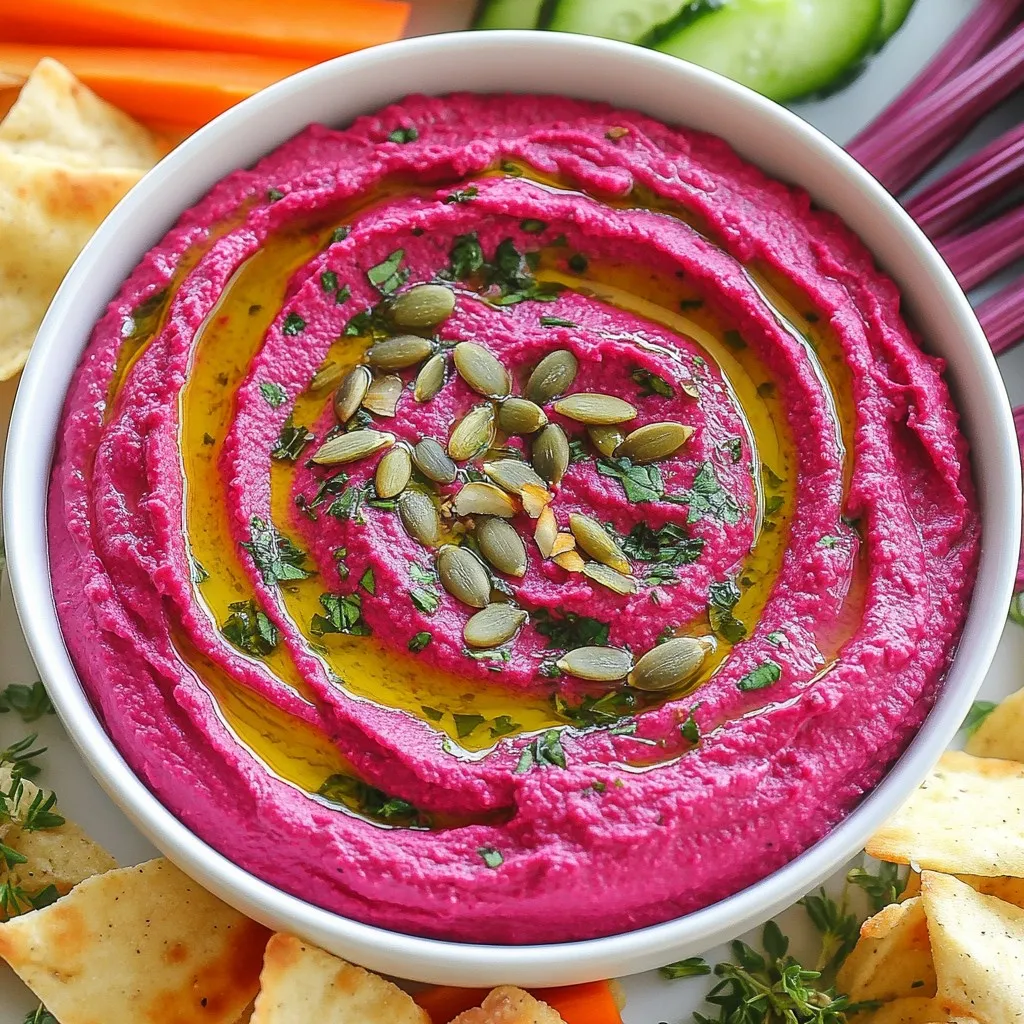 Serve your beet hummus in a bright bowl. Drizzle olive oil on top for shine. Garnish with pumpkin seeds and fresh herbs. This adds color and texture. Pair it with colorful veggies like carrots and cucumbers. Pita chips also work great for dipping. You can even spread it on toast for a tasty snack.