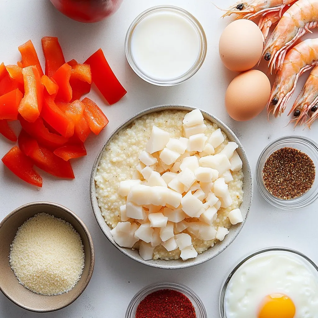 - In a large bowl, combine the cooked grits, sautéed vegetables, shrimp, shredded cheddar cheese, milk, eggs, Cajun seasoning, smoked paprika, salt, and pepper. Mix well until everything is fully incorporated.