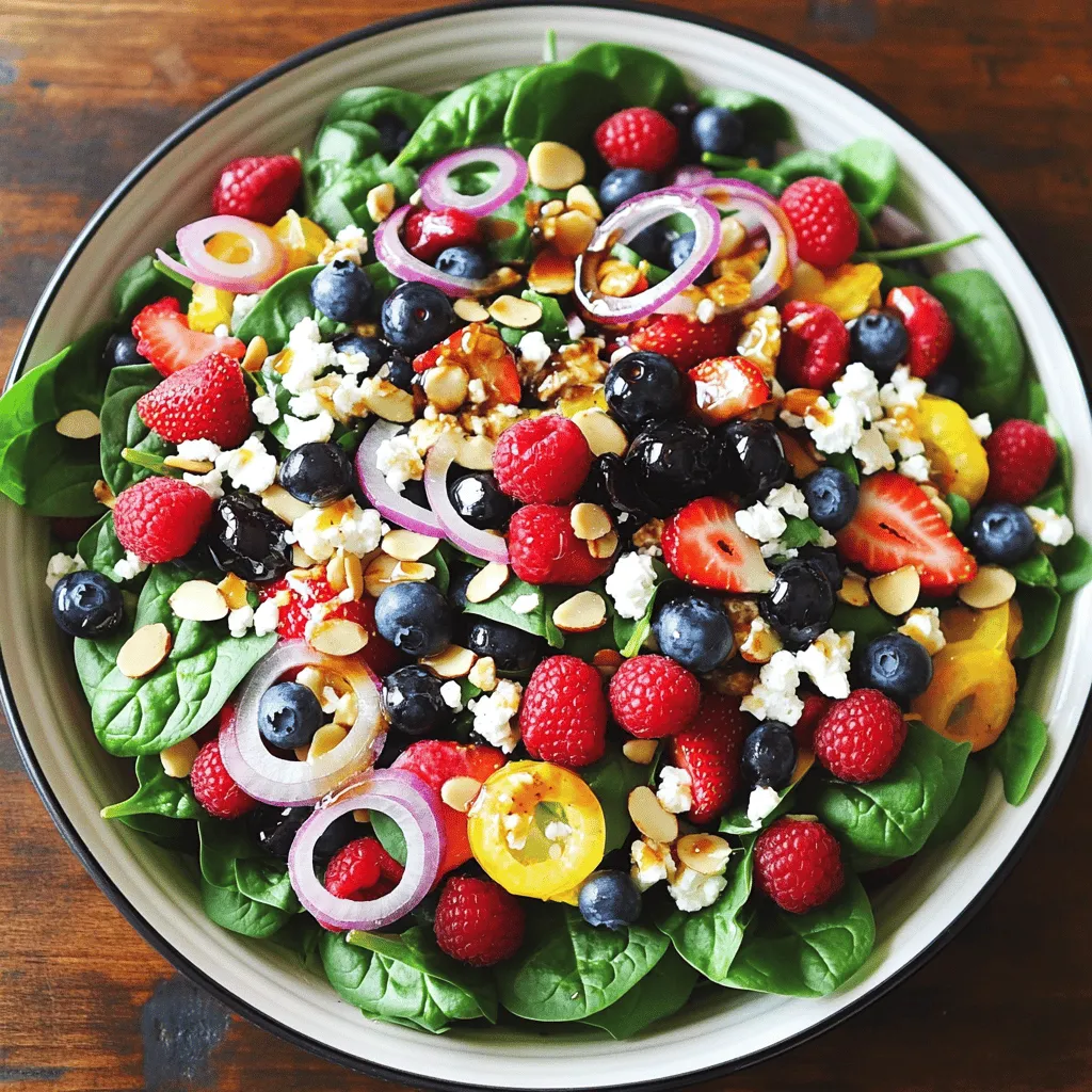 ![For the Summer Berry Spinach Salad, you will need: - 4 cups fresh spinach, washed and dried - 1 cup mixed berries (strawberries, blueberries, raspberries) - 1/2 cup feta cheese, crumbled - 1/4 cup sliced almonds or walnuts - 1/4 red onion, thinly sliced Fresh spinach is the base of this salad. It brings a crisp texture and bright color. Mixed berries add sweetness and a burst of flavor. Feta cheese gives a creamy touch, while nuts add crunch. Red onion contributes a mild bite. Together, these ingredients create a fresh and colorful dish. For the dressing, gather these ingredients: - 1 tablespoon honey - 2 tablespoons balsamic vinegar - 2 tablespoons olive oil This dressing balances sweetness and tang. Honey adds a light sweetness, while balsamic vinegar offers depth. Olive oil helps to blend the flavors and adds richness. Whisk these together for a simple yet tasty dressing. To finish the salad, you will need: - Salt and pepper to taste Salt and pepper are key for enhancing flavors. A pinch of salt can brighten the salad. Freshly cracked pepper adds a nice kick. Use these seasonings to taste, ensuring every bite is flavorful. This Summer Berry Spinach Salad is easy to make and delightful to eat. For the full recipe, check out the details. Start by washing and drying the spinach. Rinse it gently under cold water. Use a salad spinner to dry it well. This step ensures your salad stays crisp. Next, grab a large mixing bowl. Place the dried spinach into the bowl and set it aside. Now it’s time to add fresh produce. Rinse the mixed berries under cold water. If you have large strawberries, slice them into smaller pieces. Add the berries to your bowl with spinach. Next, thinly slice the red onion. Sprinkle the onion over the spinach and berries. This adds a nice crunch and flavor. For the dressing, take a small bowl. Whisk together honey, balsamic vinegar, and olive oil. Add salt and pepper to taste. This dressing balances sweetness and acidity. Taste it and adjust as needed. If you want more sweetness, add a bit more honey. Drizzle the dressing over the salad. Make sure to coat all the ingredients lightly. Use a large spoon to toss the salad gently. Be careful not to mash the berries. You want everything mixed well without squishing the fruit. Finally, sprinkle crumbled feta cheese and sliced almonds or walnuts on top. This adds creaminess and crunch. For the full recipe, follow the instructions above! When you shop for berries, choose what’s in season. Seasonal berries taste better and are often cheaper. For summer, look for strawberries, blueberries, and raspberries. These berries add great flavor to your salad. To tell if berries are ripe, check their color. Strawberries should be bright red. Blueberries must be deep blue with a slight bloom. Raspberries should be plump and firm, with no mushy spots. Smell them, too! Fresh berries have a sweet aroma. Spinach packs a lot of nutrients. It is low in calories but high in vitamins A and C. Eating spinach can help your skin and boost your immune system. Berries are also full of antioxidants. They help fight disease and keep your heart healthy. For protein, feta cheese adds a nice touch. You can also use nuts like almonds or walnuts. These not only provide protein but healthy fats, too. Together, they make the salad filling and nutritious. For a beautiful salad, serve it in a large shallow bowl. This allows the colors to shine. You can also use individual plates for a fancy look. Garnishing ideas include a sprinkle of extra feta or nuts on top. A few whole berries can make it pop with color. Drizzling a little extra dressing adds a nice finish. These simple touches will impress your guests. For the full recipe and more ideas, check out the [Full Recipe]. {{image_2}} If you want to make this salad vegan, swap the feta cheese for a plant-based cheese. Many brands offer tasty alternatives. You can also use avocado for creaminess. For a gluten-free option, check your balsamic vinegar. Most are gluten-free, but always read the label. This salad naturally fits into a gluten-free diet without any changes. I love using feta cheese in this salad. Its salty flavor pairs well with the sweet berries. Goat cheese is another great choice. It adds a tangy taste that complements the spinach. If you prefer plant-based choices, try cashew cheese or almond feta. Both options provide a rich flavor and creamy texture to your dish. You can mix in other fruits for added flavor. Think about including sliced peaches or juicy oranges. They add a nice sweetness and a pop of color. If you want more protein, grilled chicken is perfect. It makes the salad filling and hearty. Quinoa is another great add-in. It gives a nice crunch while boosting the nutrition. For the full recipe, check the details above. To store your leftover Summer Berry Spinach Salad, use a tight-sealing container. Glass or BPA-free plastic containers work well. Make sure the container is clean and dry before use. You want to keep the salad fresh and crisp. Store the salad in the fridge. Keep it away from strong-smelling foods like onions or garlic. This will help keep the salad's taste intact. Properly stored, your salad lasts about 2 to 3 days in the fridge. Look out for signs of spoilage. If the spinach wilts or the berries become mushy, it's time to toss it. A strange smell is also a clear sign that the salad is no longer good. You can get creative with leftover salad. Toss it into a wrap for a tasty lunch. Add leftover grilled chicken or fish for a hearty meal. You can also mix it into a grain bowl with quinoa or rice. This way, you reduce waste and enjoy new flavors! Yes, you can prep the salad ahead. I suggest preparing the spinach and berries first. Keep them separate from the dressing until you are ready to serve. This helps keep everything fresh and crisp. You can mix the salad a few hours in advance. Just store it in the fridge. I love using a mix of fresh berries. Strawberries, blueberries, 